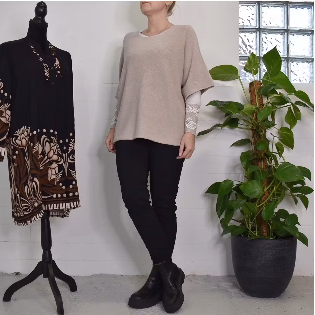 Det här är en skön och fin långärmad topp med rundad halsringning och vacker spets i ärmslutet. Materialet är stretchigt och supermjukt. Storlekar - S/M & L/XL. Då det är individuellt hur man upplever storlekar, och vi alla är olika formade, så rekommenderar vi att ta hjälp av måtten längre ner i beskrivningen för att se vilken storlek som kan passa. Modellen har en bröstvidd på cirka 88cm, är 163cm lång och bär storlek S/M.