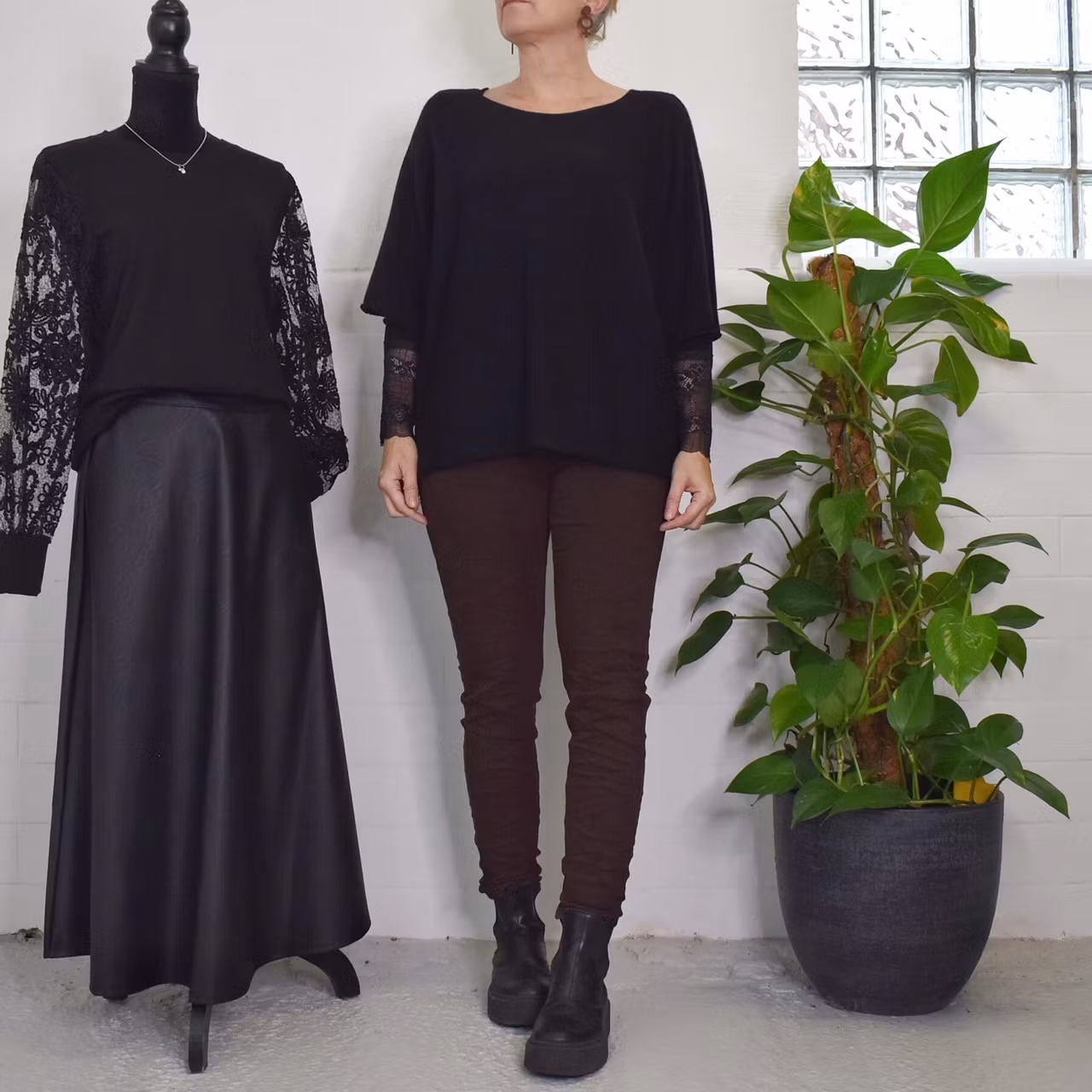 Det här är en skön och fin långärmad topp med rundad halsringning och vacker spets i ärmslutet. Materialet är stretchigt och supermjukt. Storlekar - S/M & L/XL. Då det är individuellt hur man upplever storlekar, och vi alla är olika formade, så rekommenderar vi att ta hjälp av måtten längre ner i beskrivningen för att se vilken storlek som kan passa. Modellen har en bröstvidd på cirka 88cm, är 163cm lång och bär storlek S/M.