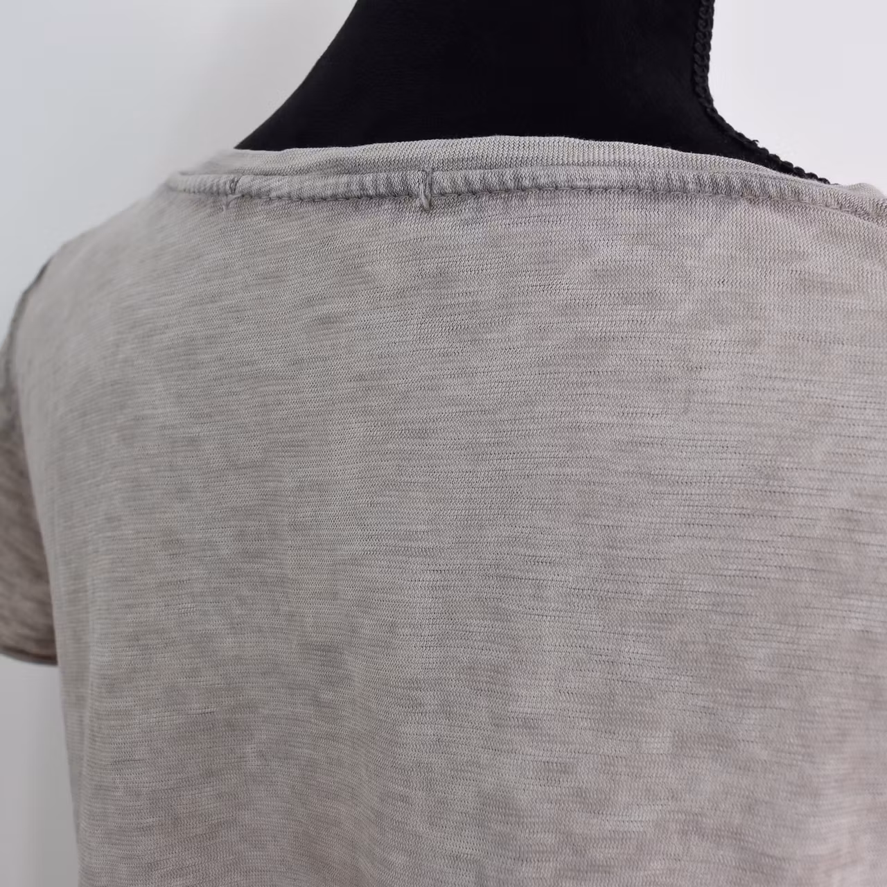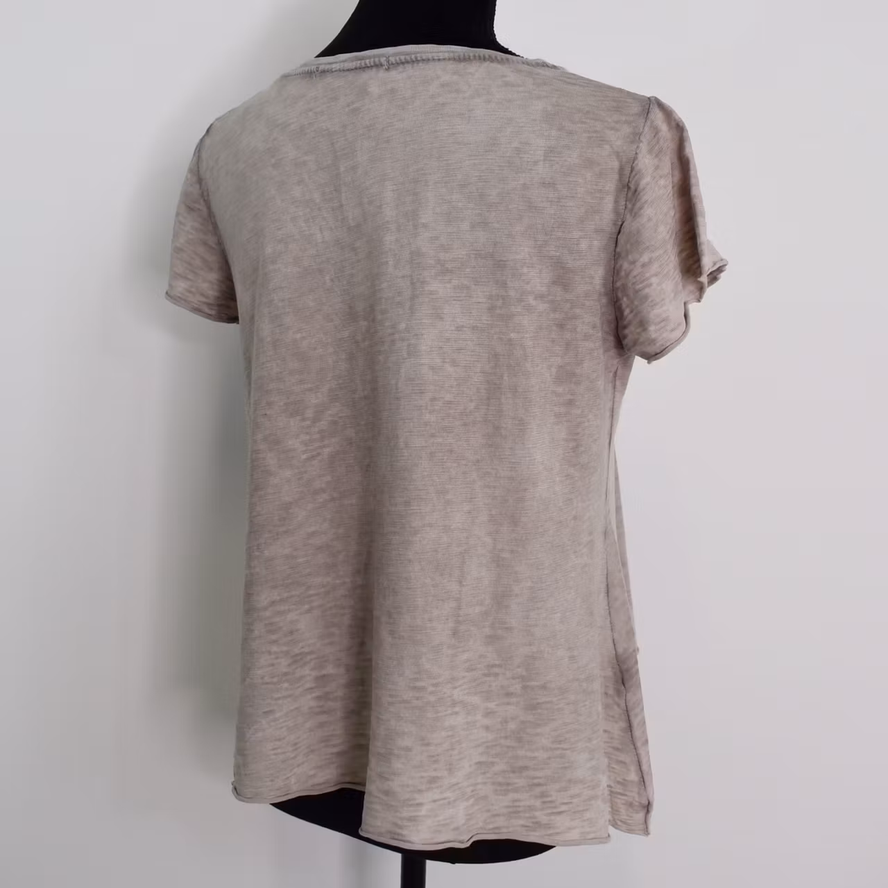 Det här är en enkel, snygg och skön v-ringad t-shirt i en kort a-formad modell. Färgen är kraftigt melerad och att tyget är tunt. Materialet innehåller ingen stretch men är följsamt och töjbart. Observera att alla exemplar har en unik melering och ser därför inte ut som den på bilderna. Modellen har en bröstvidd på cirka 88cm och är 163cm lång.