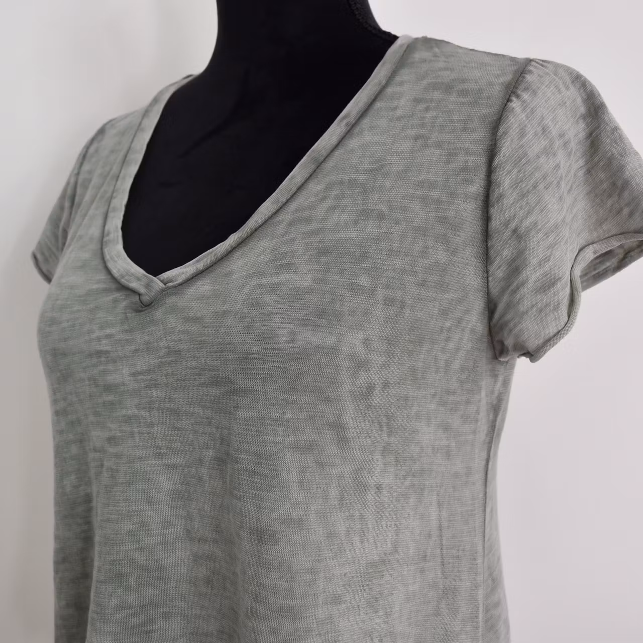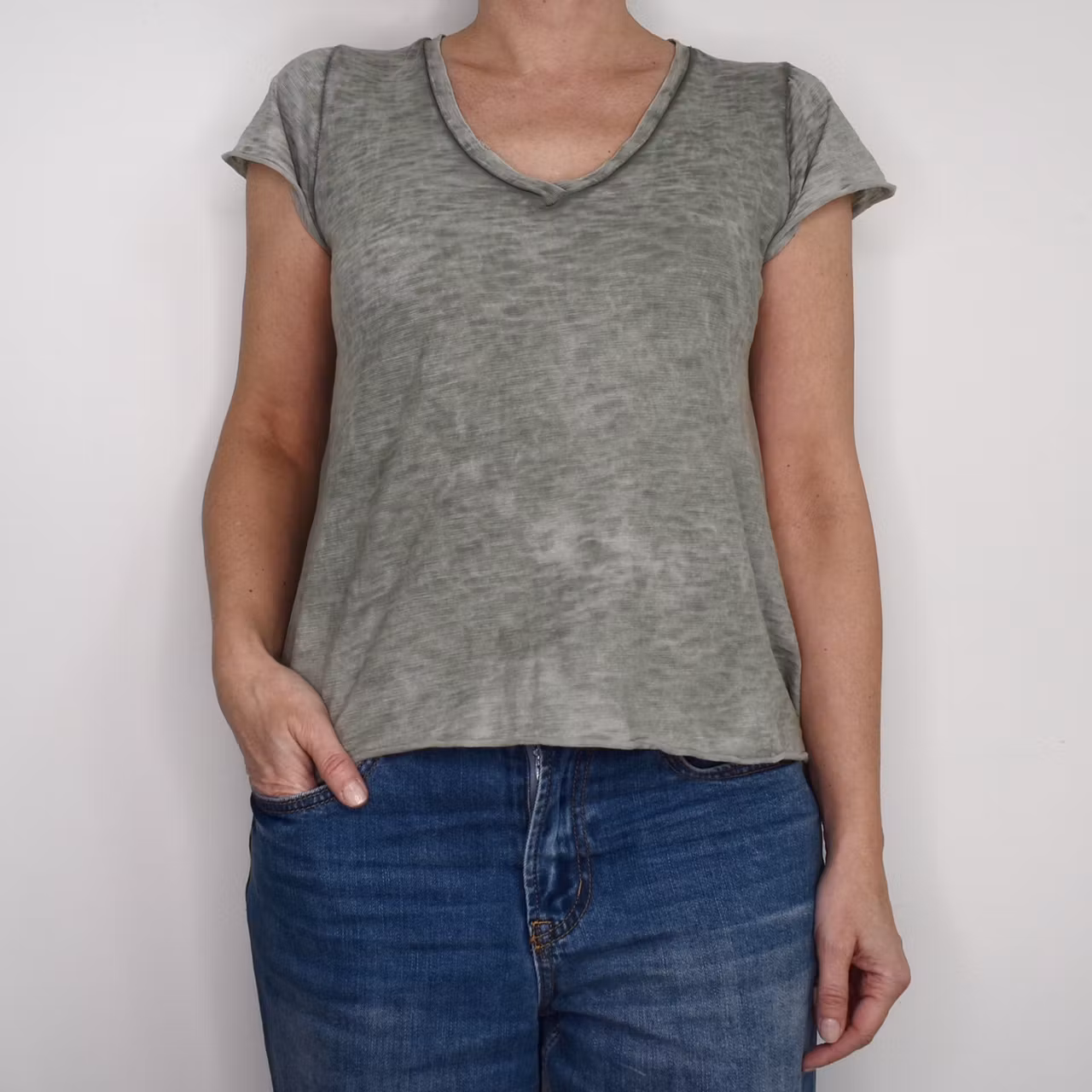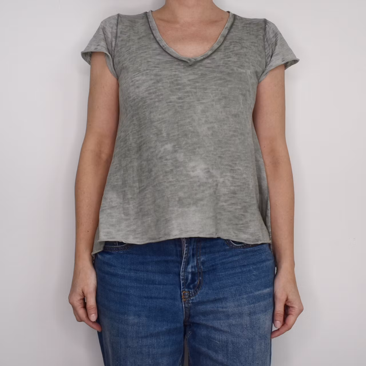 Det här är en enkel, snygg och skön v-ringad t-shirt i en kort a-formad modell. Färgen är kraftigt melerad och att tyget är tunt. Materialet innehåller ingen stretch men är följsamt och töjbart. Observera att alla exemplar har en unik melering och ser därför inte ut som den på bilderna. Modellen har en bröstvidd på cirka 88cm och är 163cm lång.