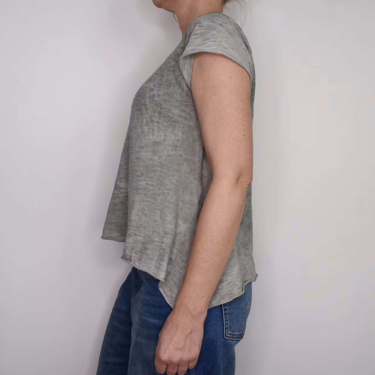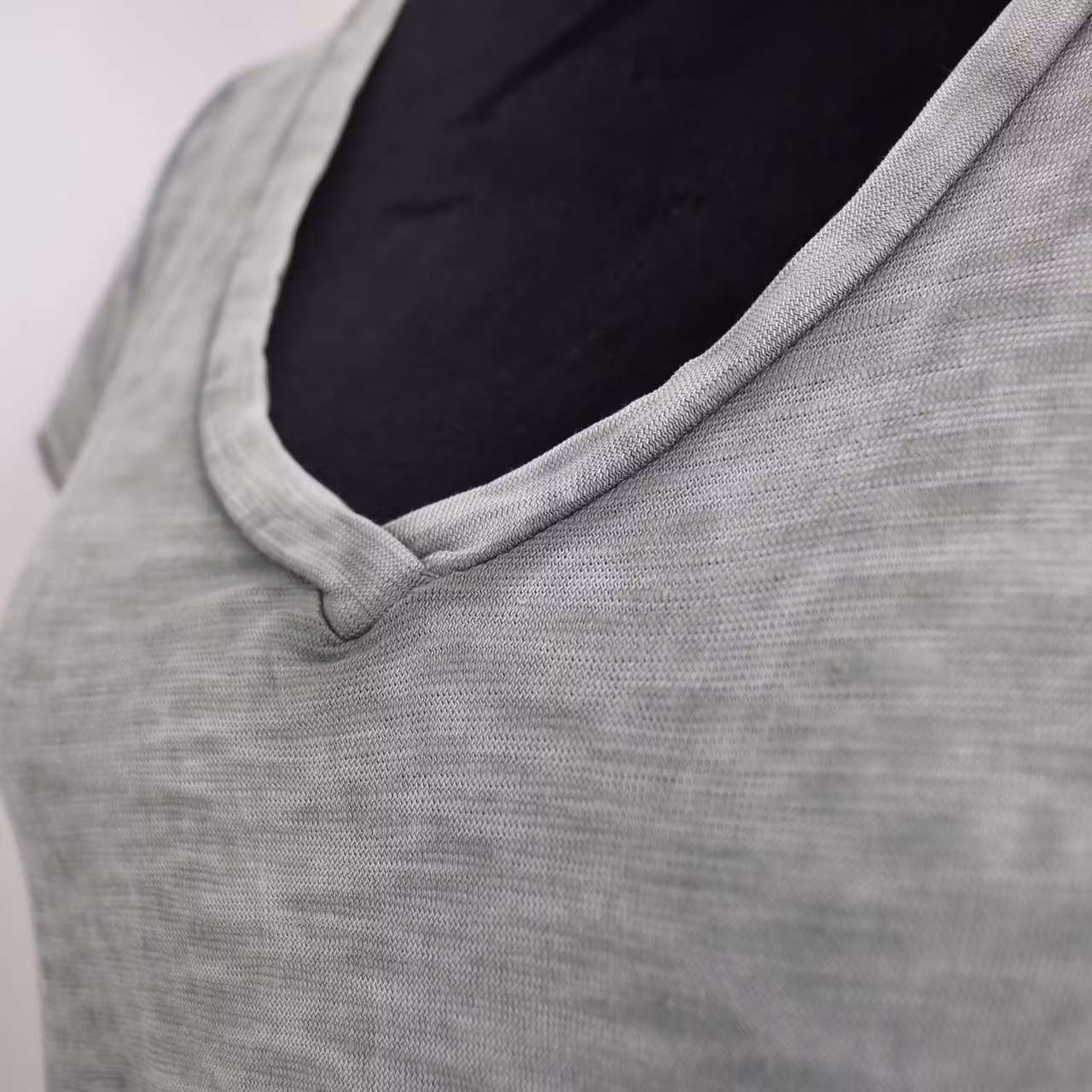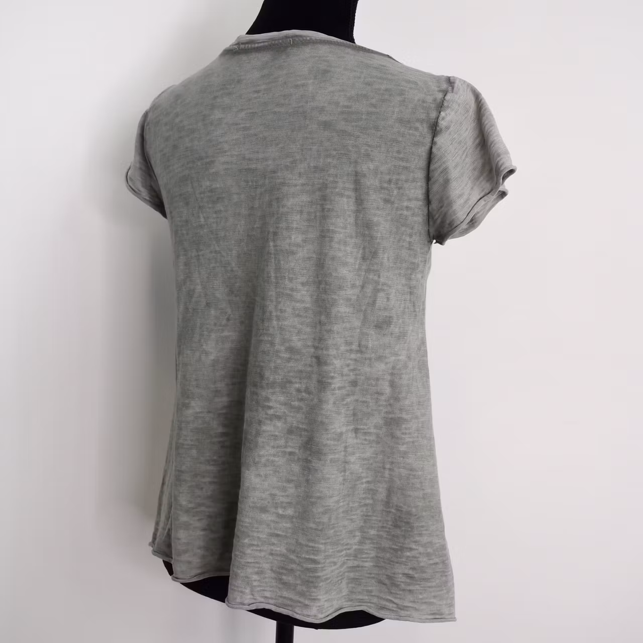 Det här är en enkel, snygg och skön v-ringad t-shirt i en kort a-formad modell. Färgen är kraftigt melerad och att tyget är tunt. Materialet innehåller ingen stretch men är följsamt och töjbart. Observera att alla exemplar har en unik melering och ser därför inte ut som den på bilderna. Modellen har en bröstvidd på cirka 88cm och är 163cm lång.