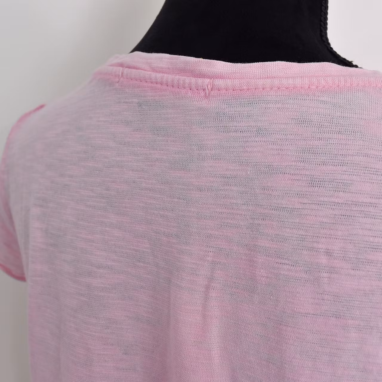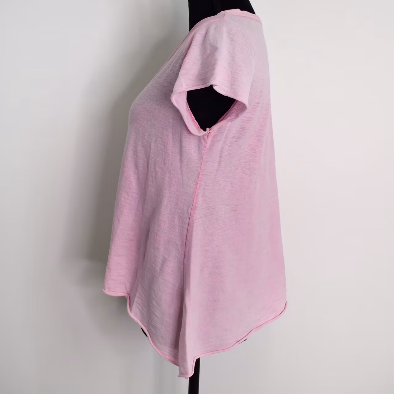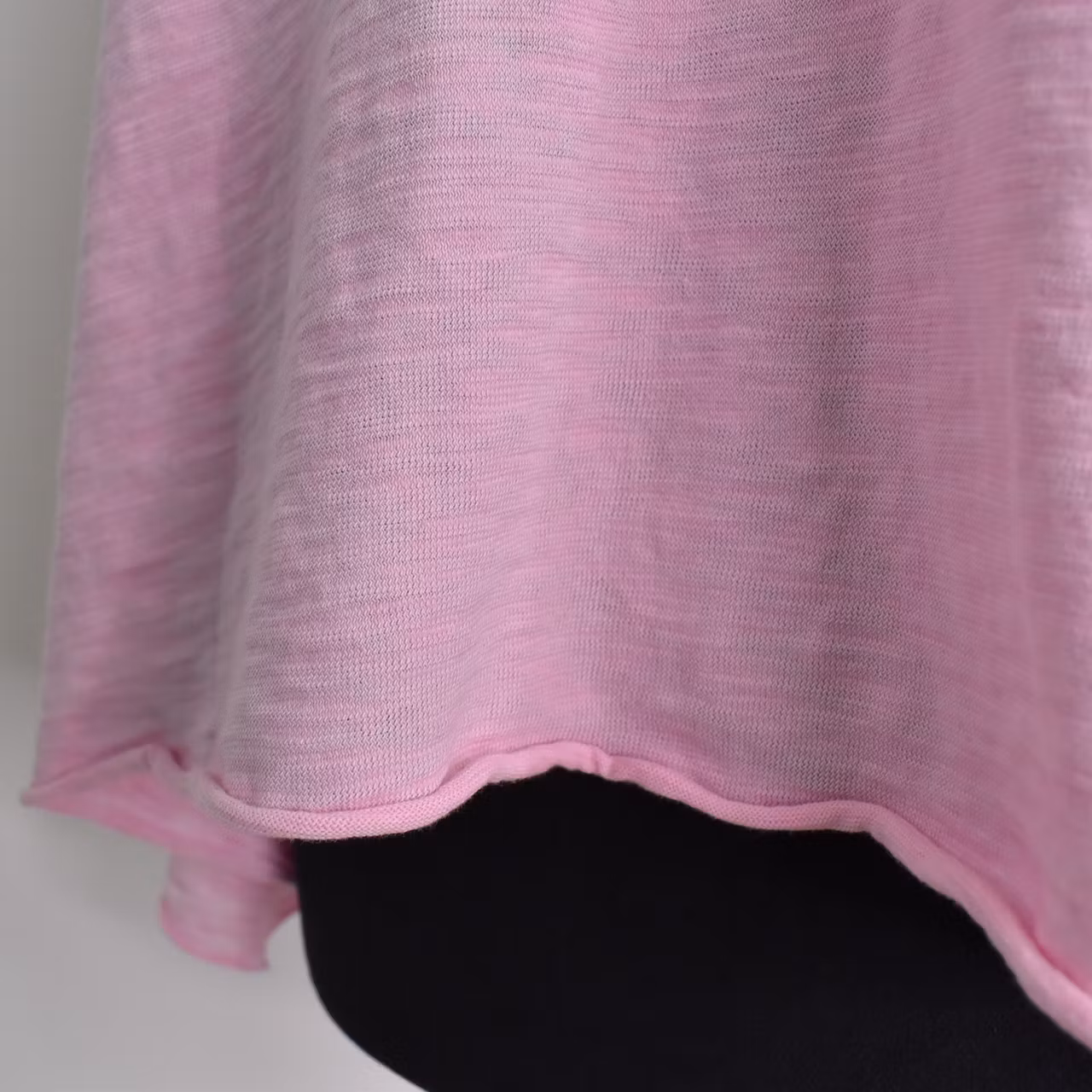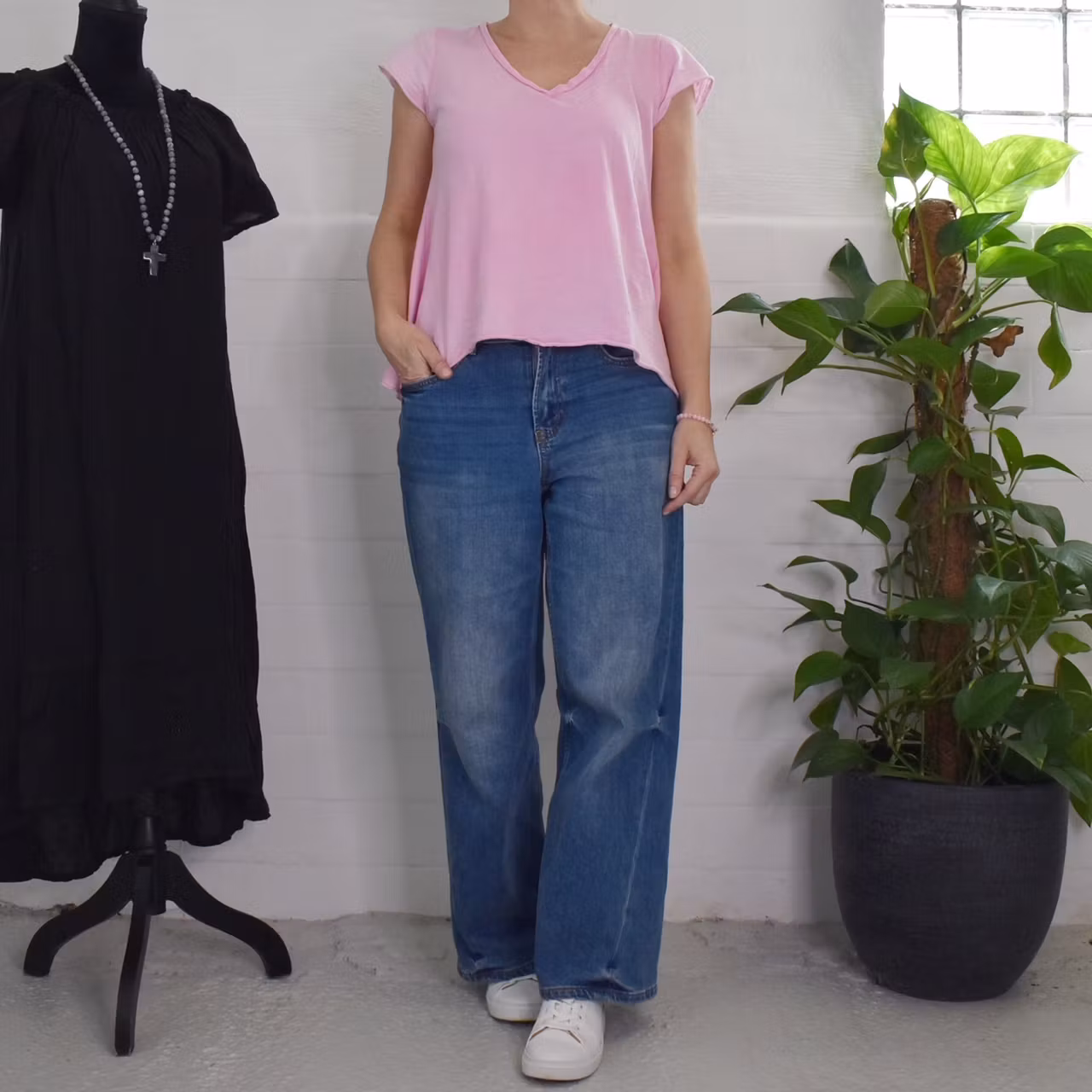 Det här är en enkel, snygg och skön v-ringad t-shirt i en kort a-formad modell. Färgen är kraftigt melerad och att tyget är tunt. Materialet innehåller ingen stretch men är följsamt och töjbart. Observera att alla exemplar har en unik melering och ser därför inte ut som den på bilderna. Modellen har en bröstvidd på cirka 88cm och är 163cm lång.