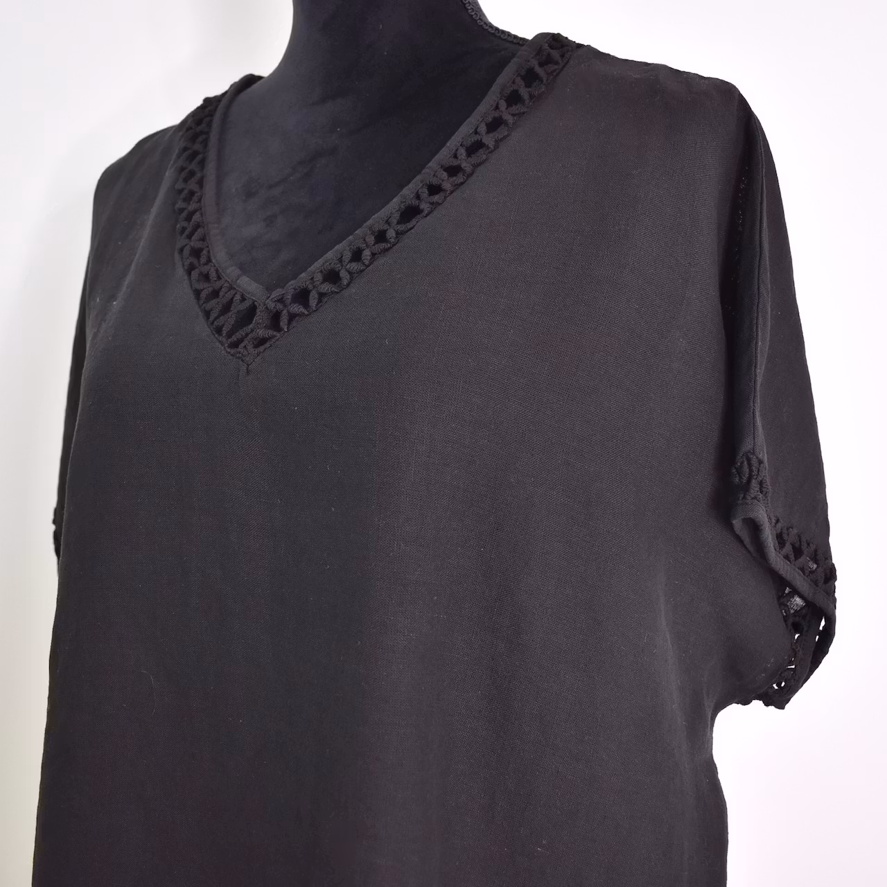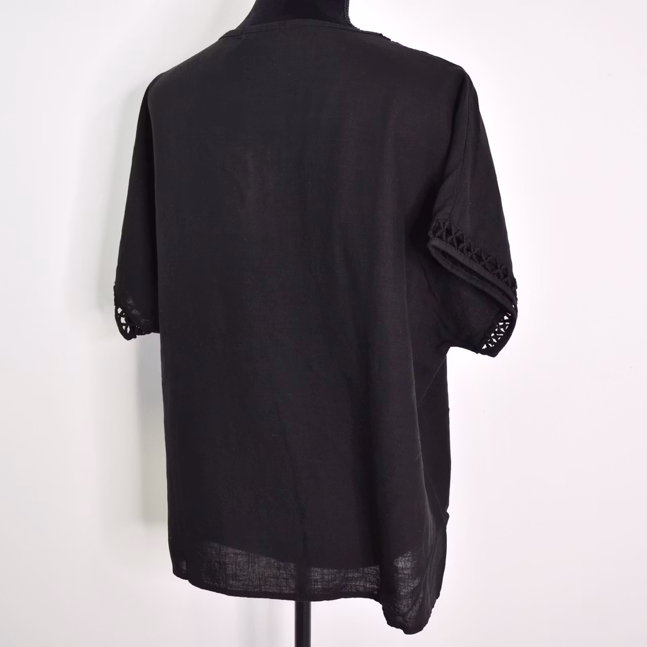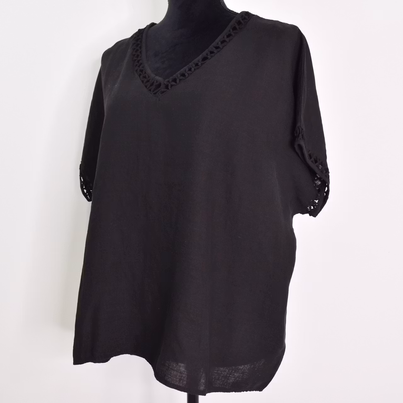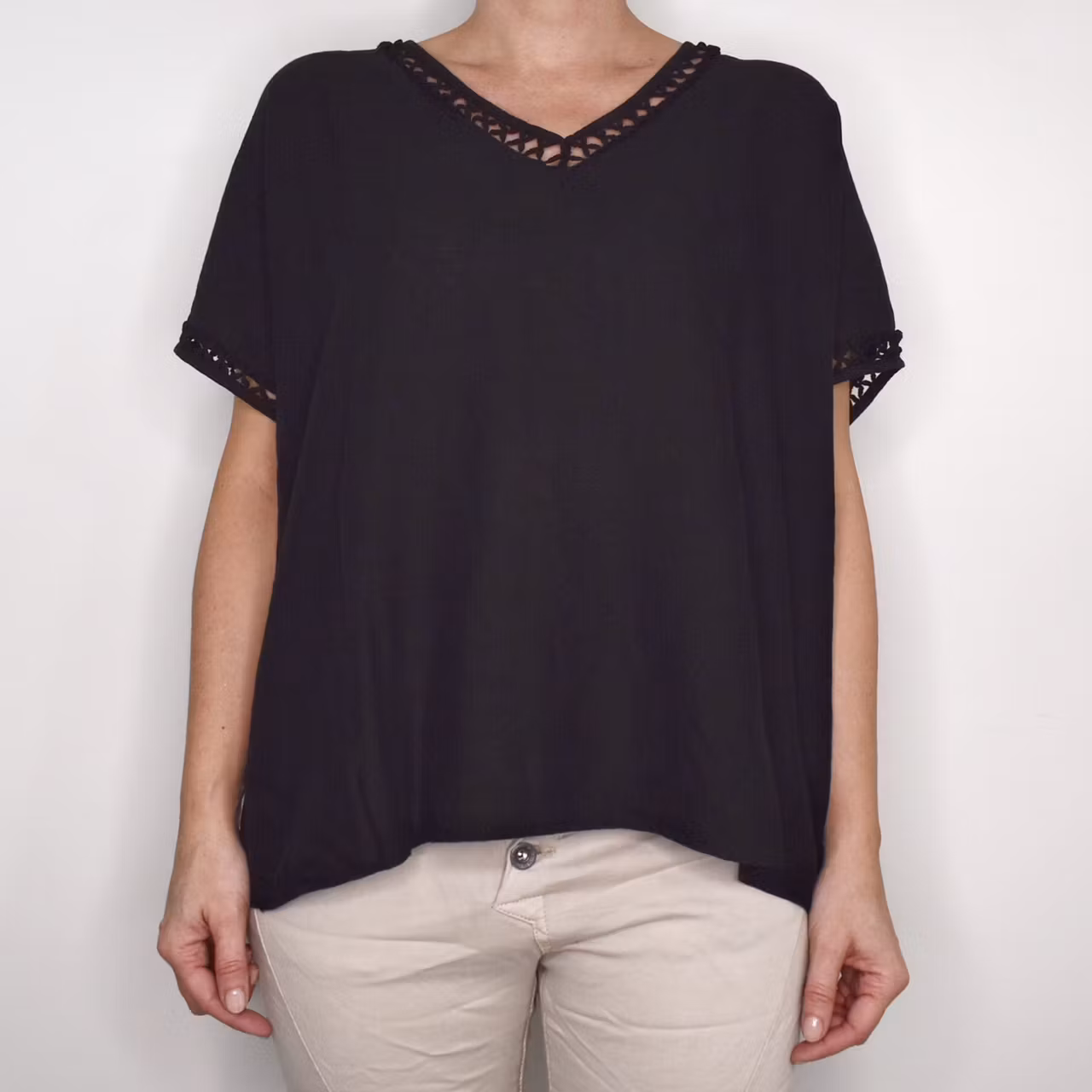 Det här är en fin v-ringad topp i livfullt material och med tjusig hålspets i hals samt i slutet på den korta ärmen. Passformen är avslappnad. Tänk på att tyget är tunt och inte innehåller stretch. Modellen har en bröstvidd på cirka 88cm och är 163cm lång.