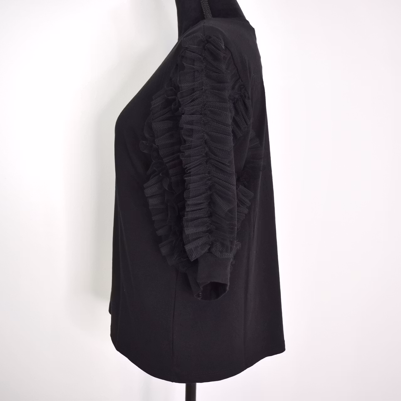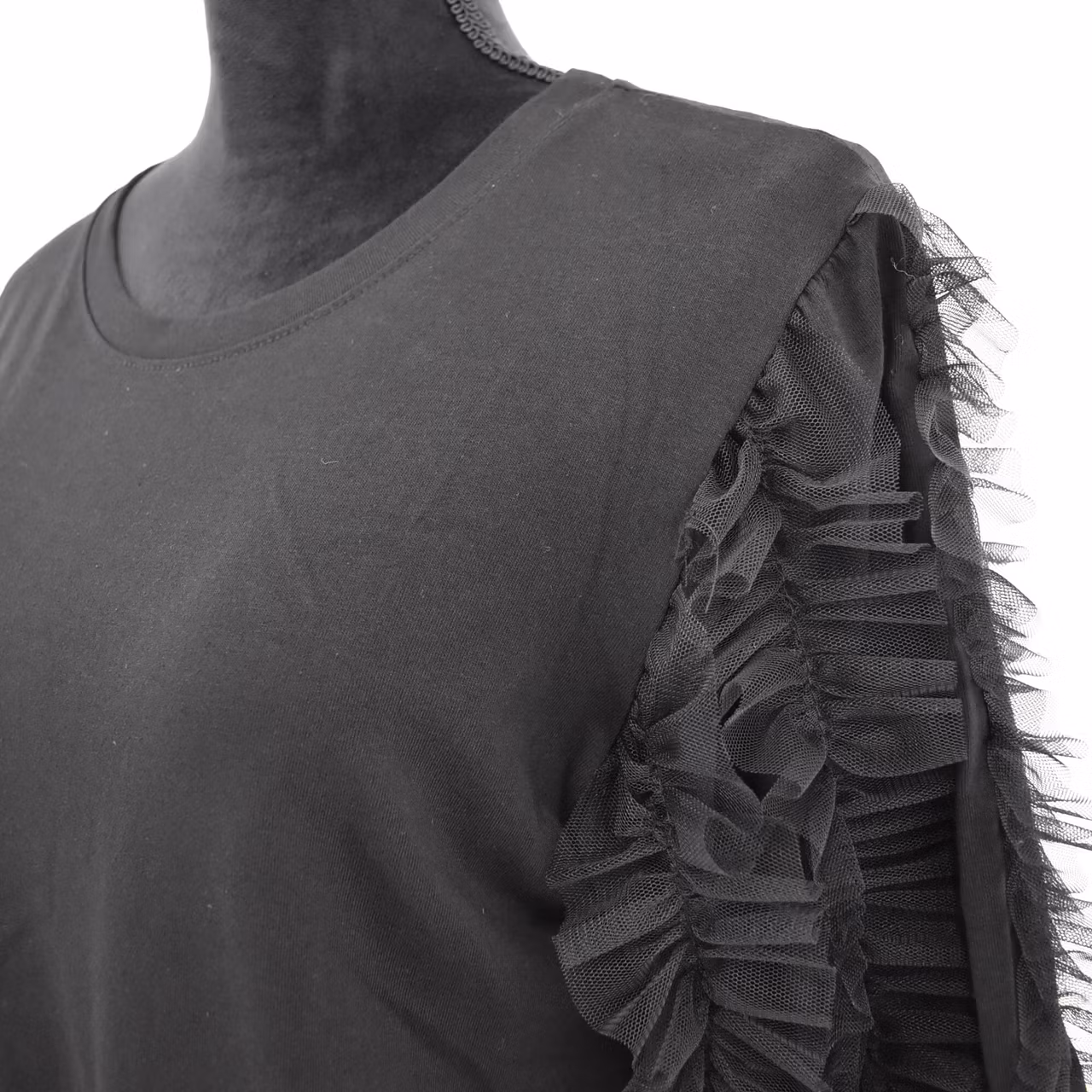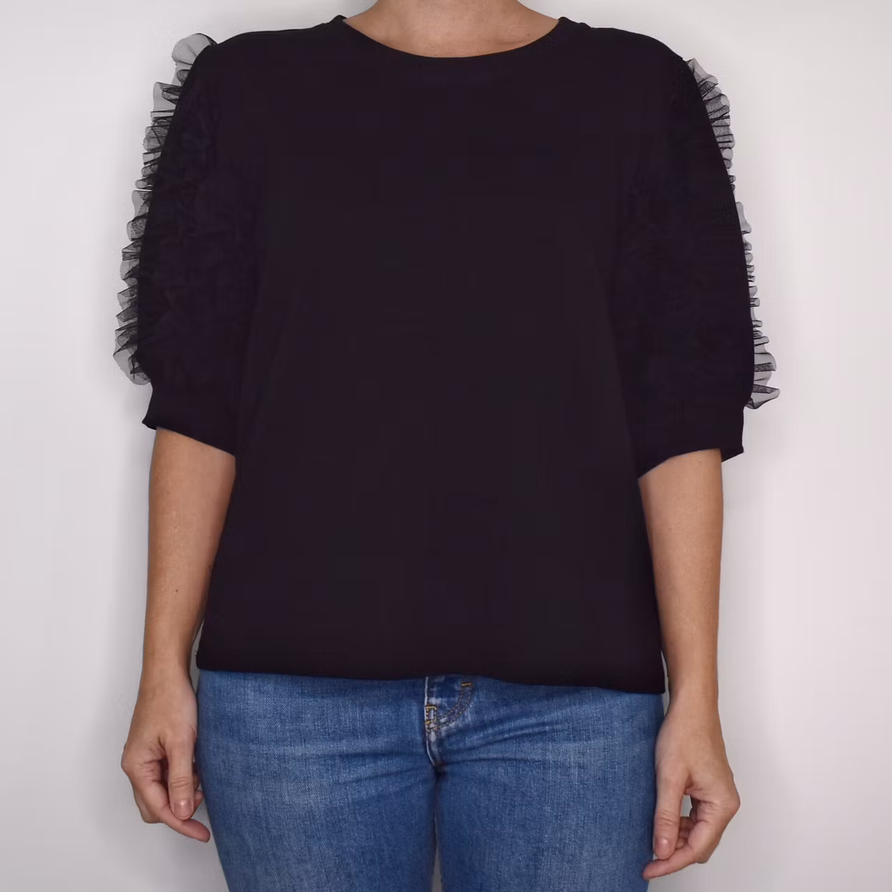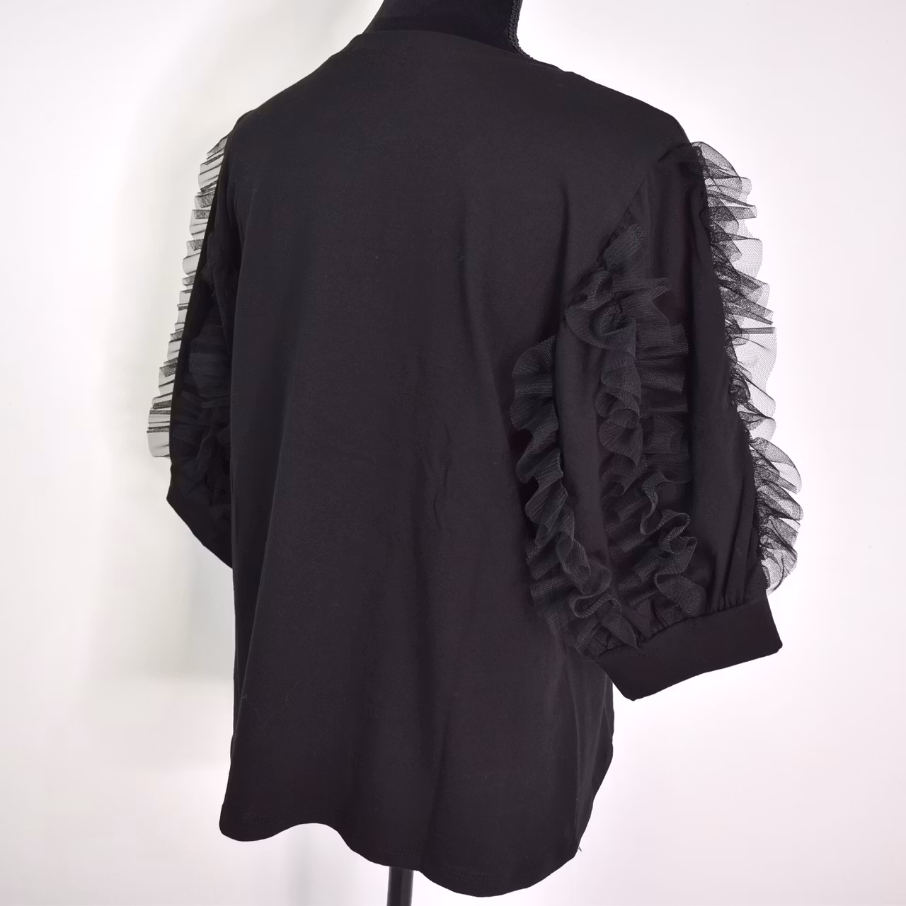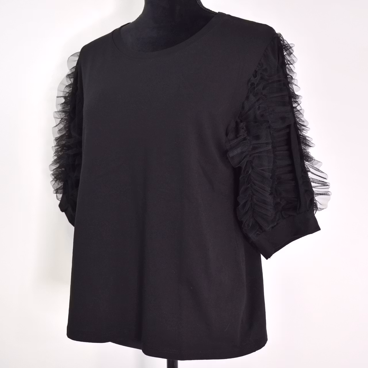 Det här är en vacker topp med tyll-volang på de korta ärmarna och rundringad hals. Tyget är mjukt, stretchigt och behagligt. Modellen har en bröstvidd på cirka 88cm, är 163cm lång och bär storlek S/M.