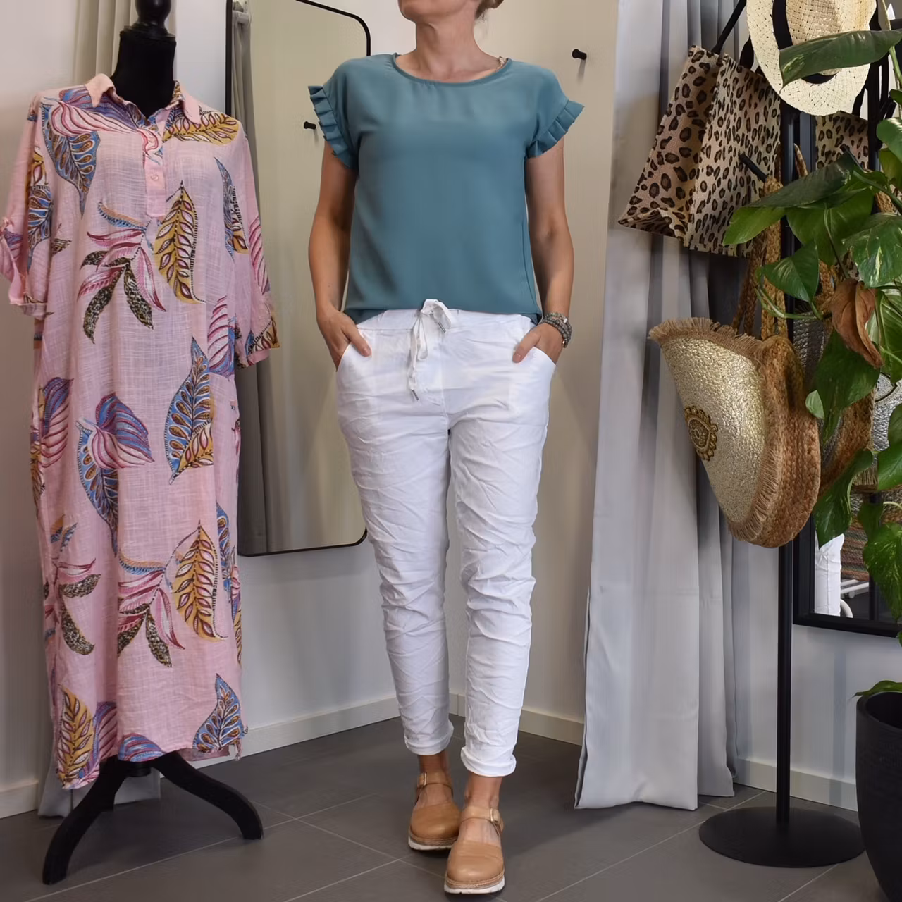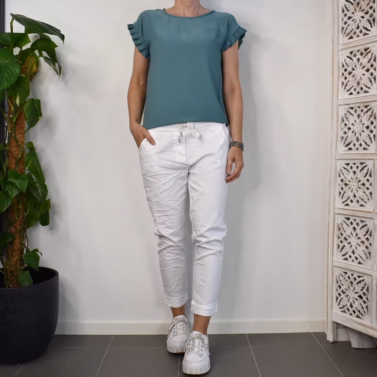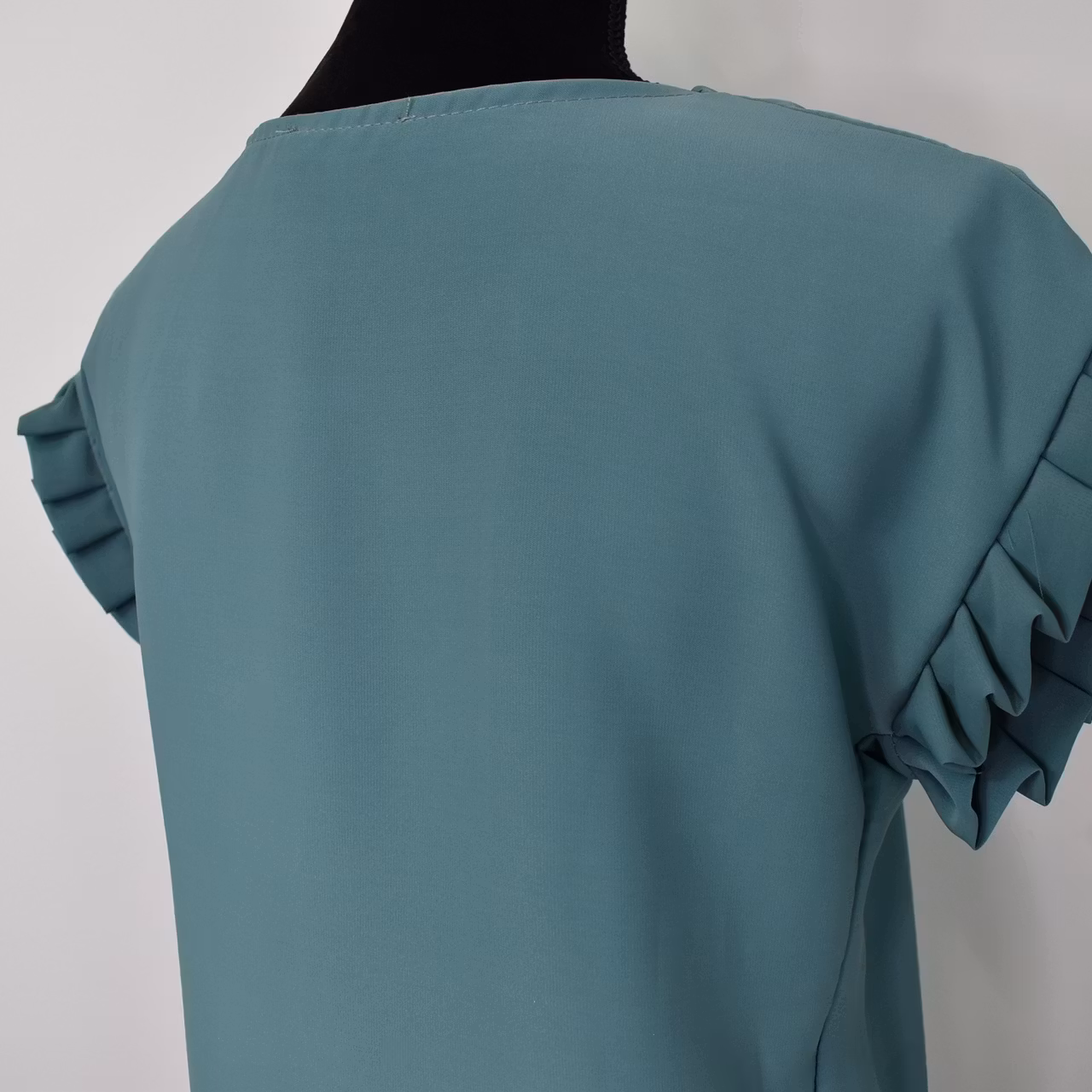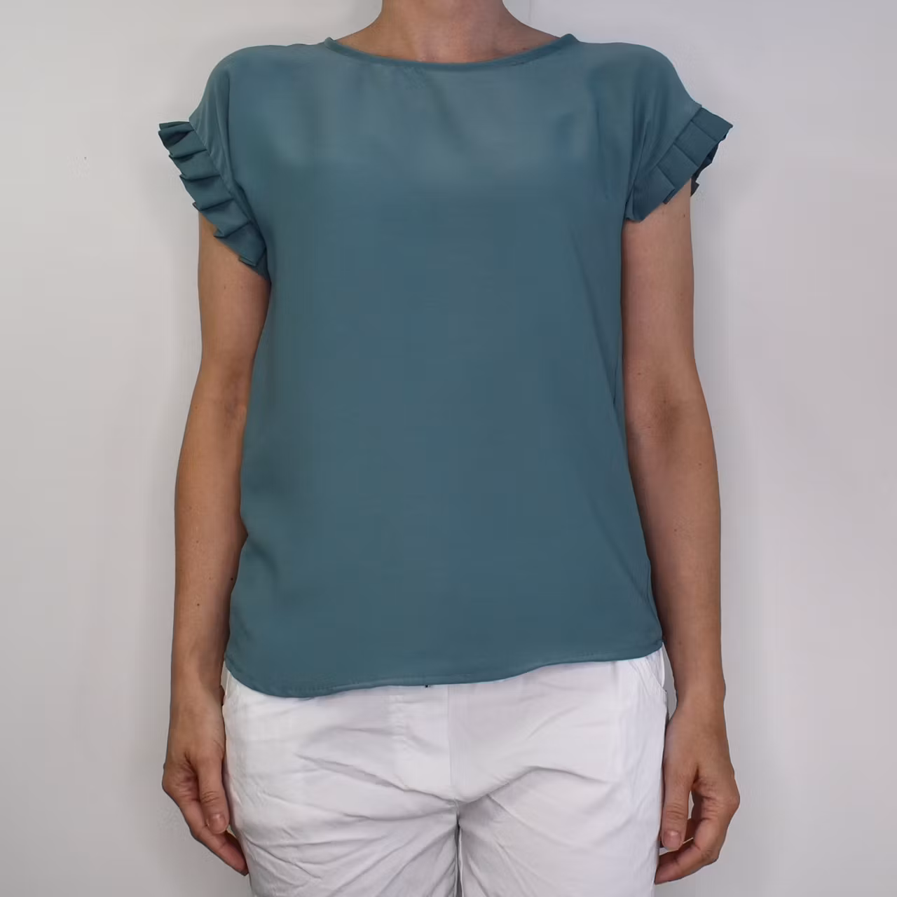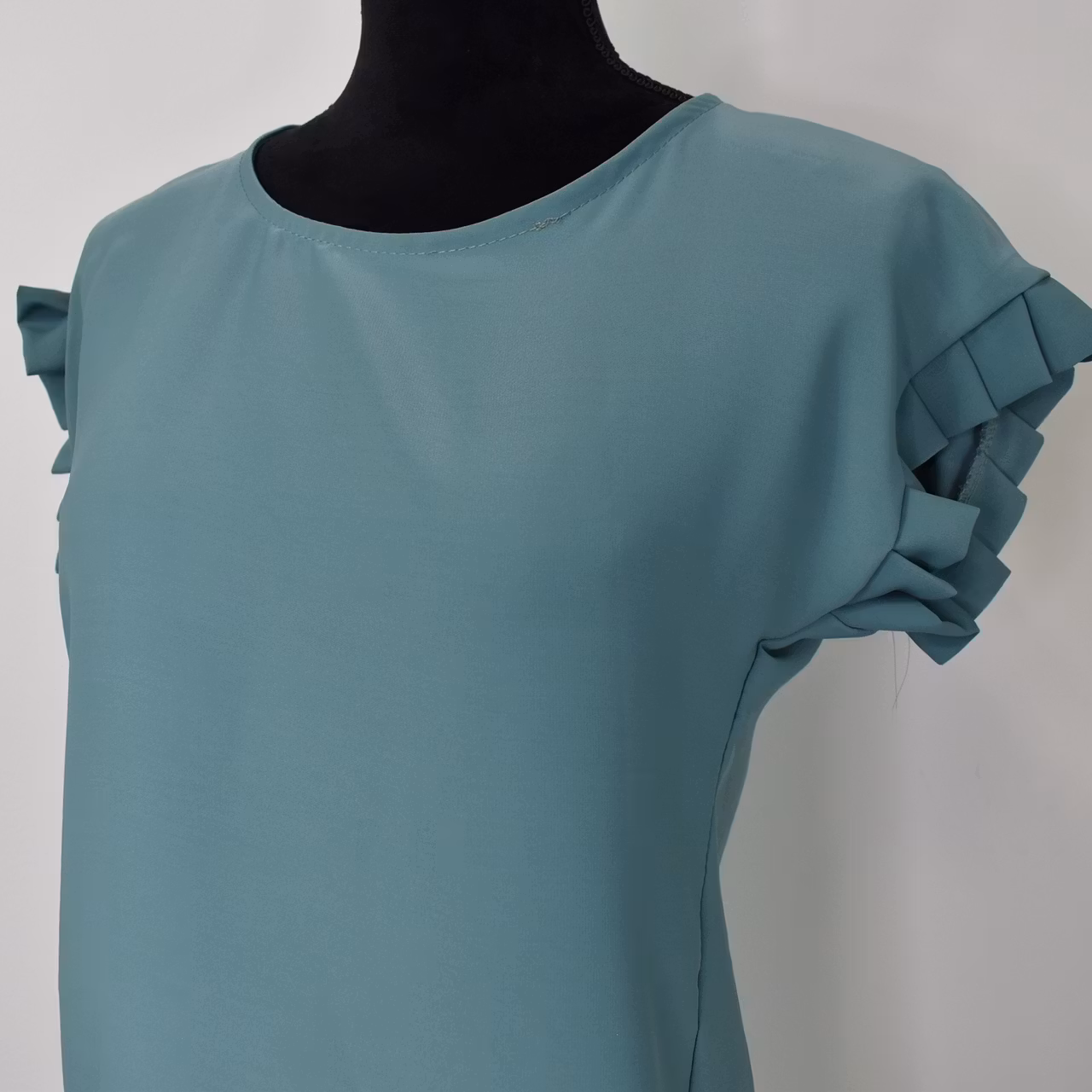 Det här är en tjusig topp med rundad halsringning och vacker volang på ärmen. Passformen är rak. Observera att materialet inte innehåller stretch så då tyget är stumt kan denna upplevas som liten och tajt när man tar den på sig. Storlekar - S - L. Då vi alla är olika formade och upplever storlekar olika så rekommenderar vi att man även använder sig av måtten längre ner i beskrivningen för att bedöma om plagget kan passa. Modellen har en bröstvidd på cirka 88cm, är 163cm lång och bär storlek S.