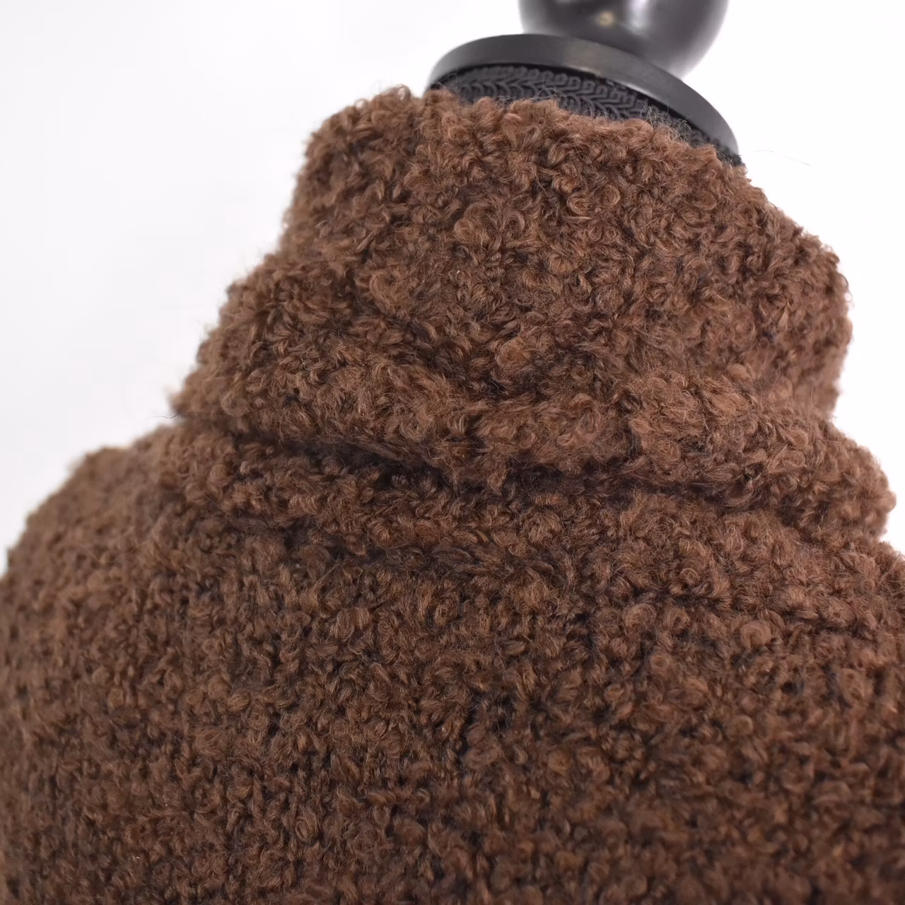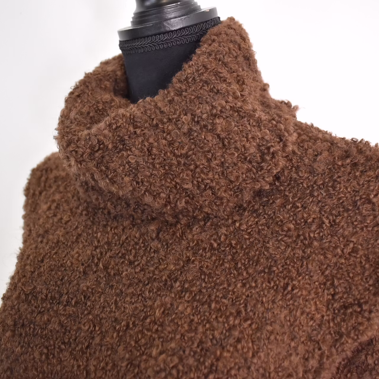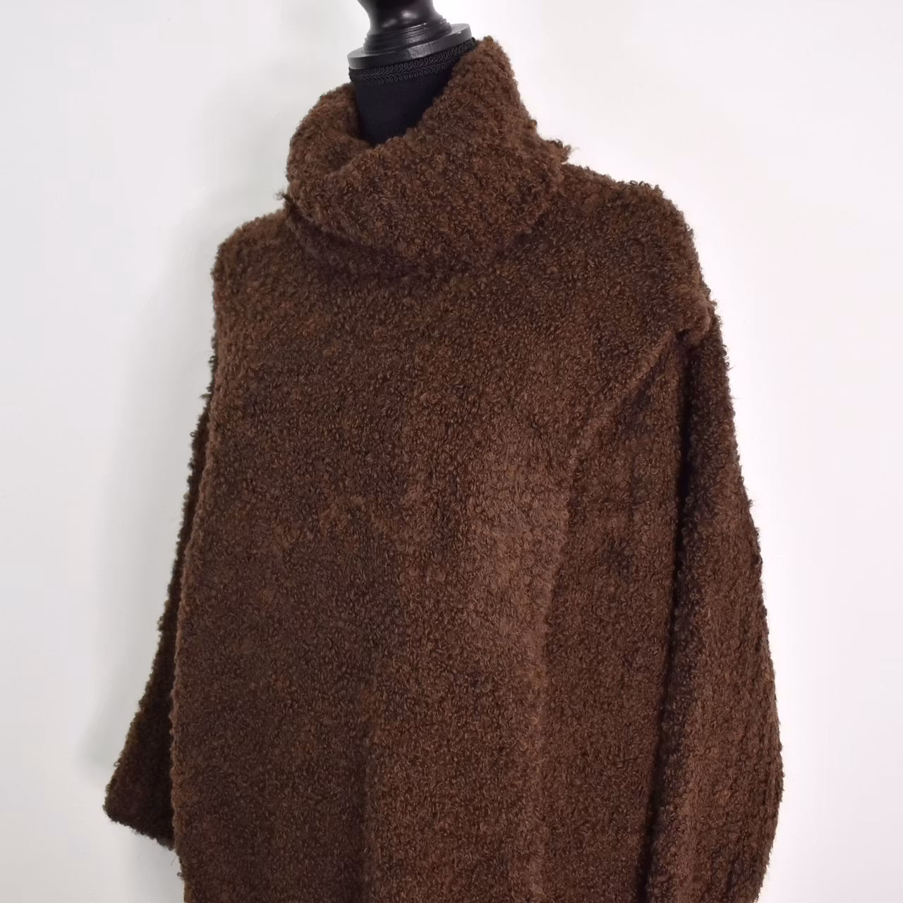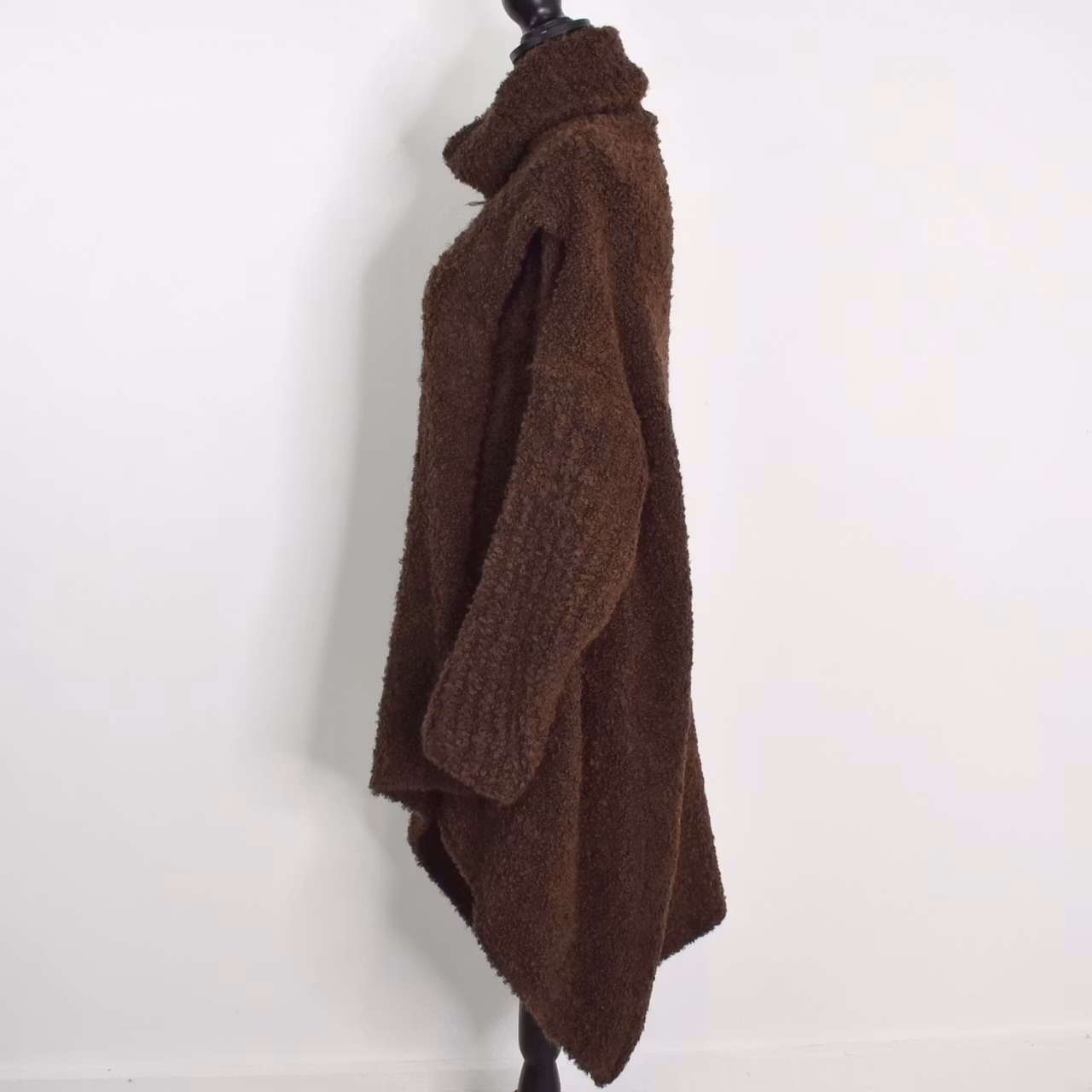 Det här är en underbar stickad långtröja i mjukt material som går omlott framtill. Tröjan har en lös polokrage och nerhasad axel. Ärmen är ribbstickad. Tröjan sitter ihop inuti (se sista bilden) och är något längre baktill. Passformen är avslappnad. One Size - passar uppskattningsvis upp till XL (42). Då vi alla är olika formade rekommenderar vi att man tar hjälp av måtten nedan för att bedöma om plagget kan passa. Modellen har en bröstvidd på cirka 88cm, och är 163cm lång.