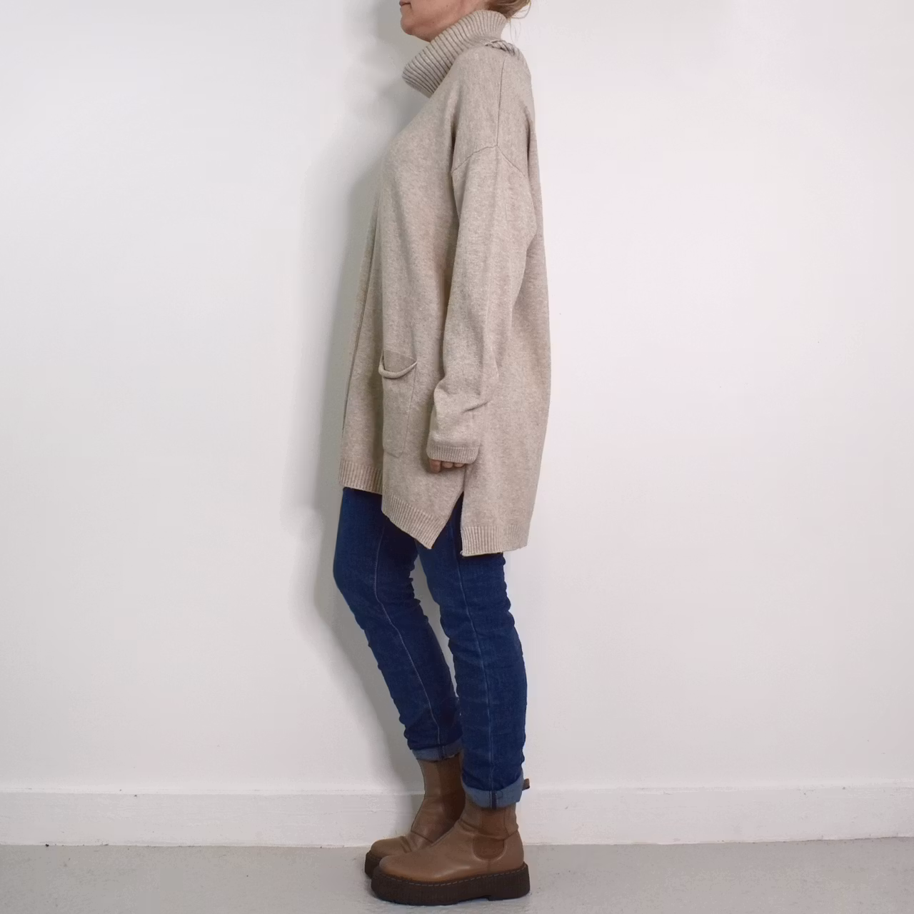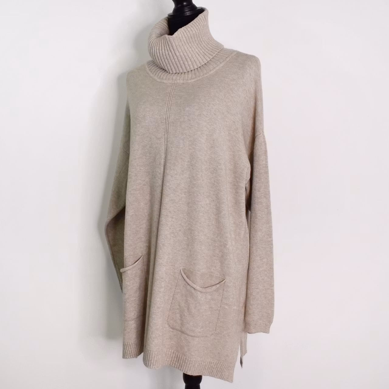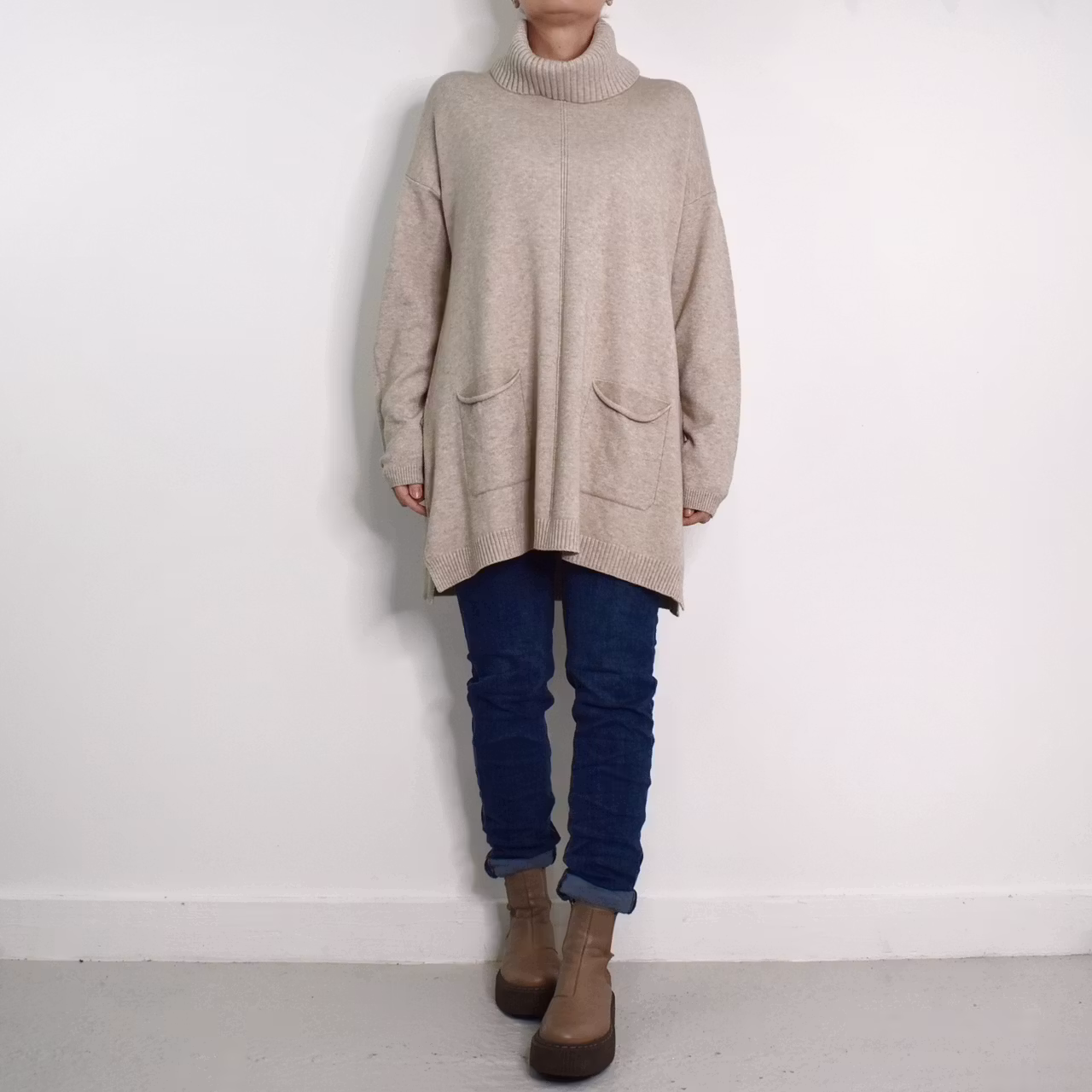 Det här är en fin och mysig finstickad långtröja med lös polokrage. Ärmen är lång och axeln något nerhasad. Nertill på framsidan finns två fickor och i sidorna en liten slits. Kragen, ärmslutet och längst ner på tröjan är ribbstickade. Både fram och bak finns dekorativa lodrätta linjer. Tyget är supermjukt och följsamt. One Size - passar uppskattningsvis upp till XL (42). Då vi alla är olika formade rekommenderar vi att man tar hjälp av måtten nedan för att bedöma om plagget kan passa. Modellen har en bröstvidd på cirka 88cm, och är 163cm lång.