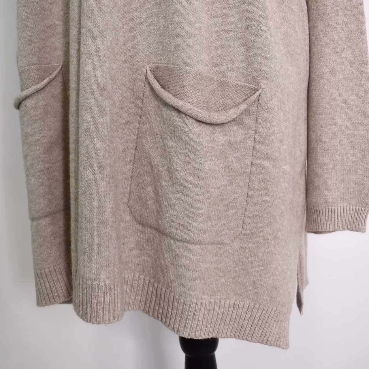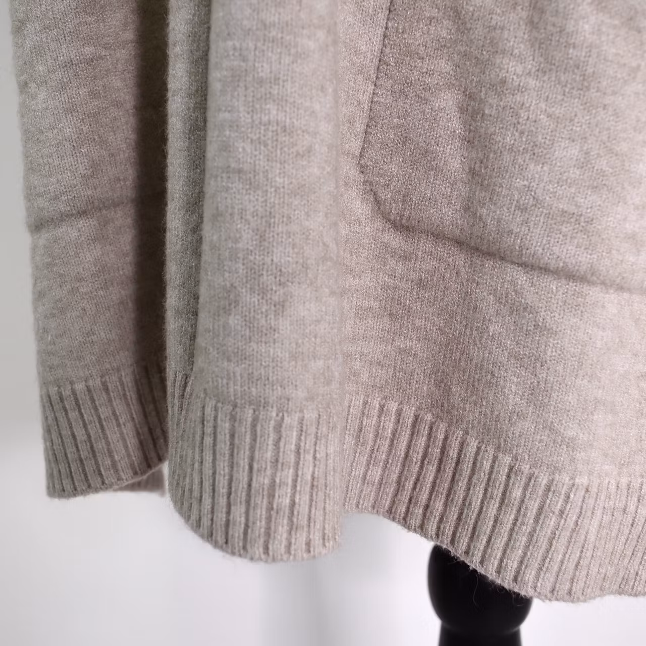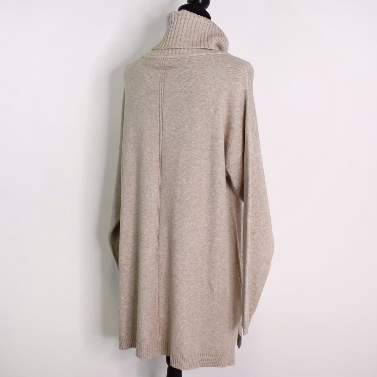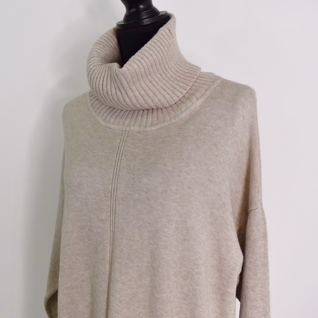 Det här är en fin och mysig finstickad långtröja med lös polokrage. Ärmen är lång och axeln något nerhasad. Nertill på framsidan finns två fickor och i sidorna en liten slits. Kragen, ärmslutet och längst ner på tröjan är ribbstickade. Både fram och bak finns dekorativa lodrätta linjer. Tyget är supermjukt och följsamt. One Size - passar uppskattningsvis upp till XL (42). Då vi alla är olika formade rekommenderar vi att man tar hjälp av måtten nedan för att bedöma om plagget kan passa. Modellen har en bröstvidd på cirka 88cm, och är 163cm lång.