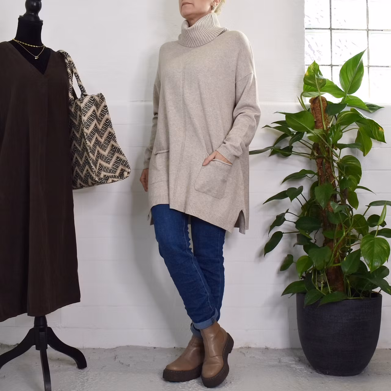 Bra att veta: Supermjukt tyg. Lös polokrage och nerhasad axel. Fickor fram och liten slits i sidorna.