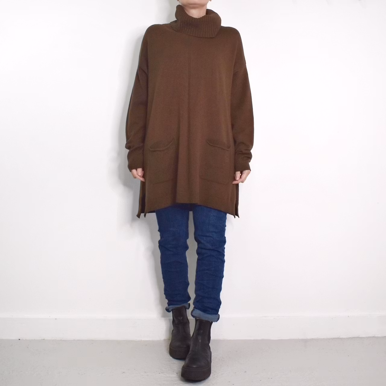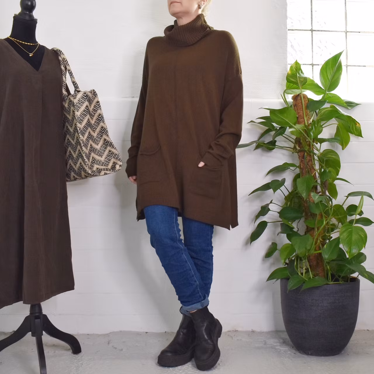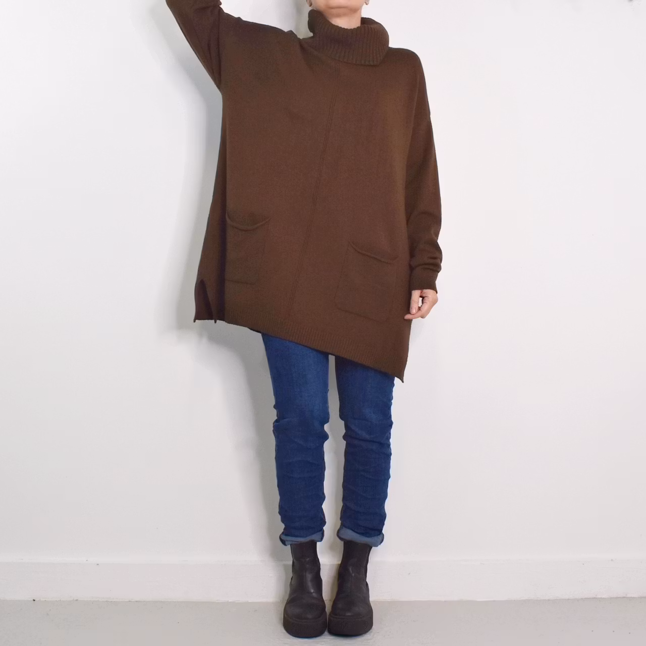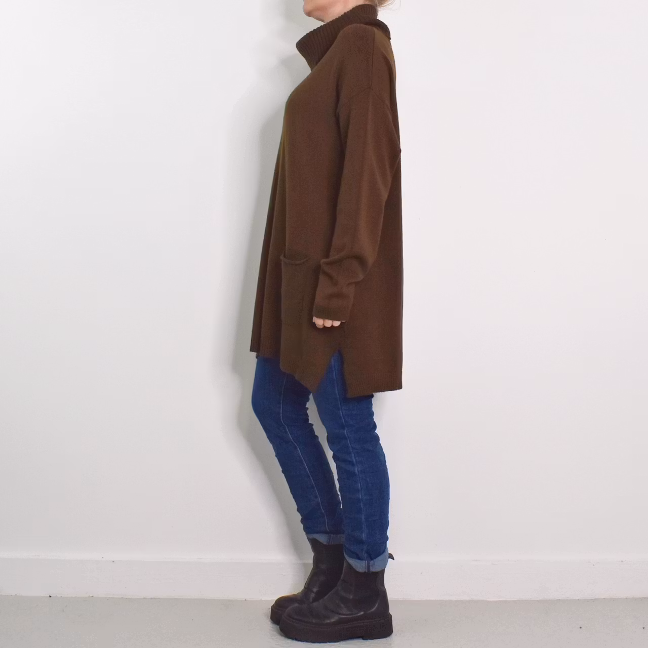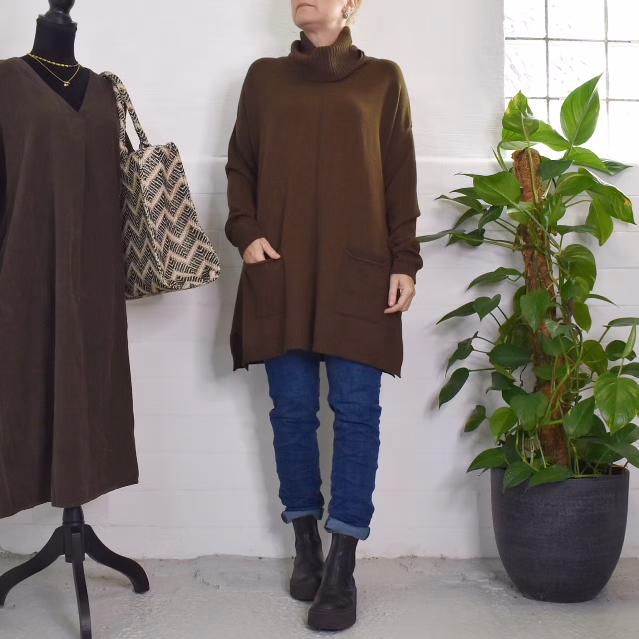 Det här är en fin och mysig finstickad långtröja med lös polokrage. Ärmen är lång och axeln något nerhasad. Nertill på framsidan finns två fickor och i sidorna en liten slits. Kragen, ärmslutet och längst ner på tröjan är ribbstickade. Både fram och bak finns dekorativa lodrätta linjer. Tyget är supermjukt och följsamt. One Size - passar uppskattningsvis upp till XL (42). Då vi alla är olika formade rekommenderar vi att man tar hjälp av måtten nedan för att bedöma om plagget kan passa. Modellen har en bröstvidd på cirka 88cm, och är 163cm lång.
