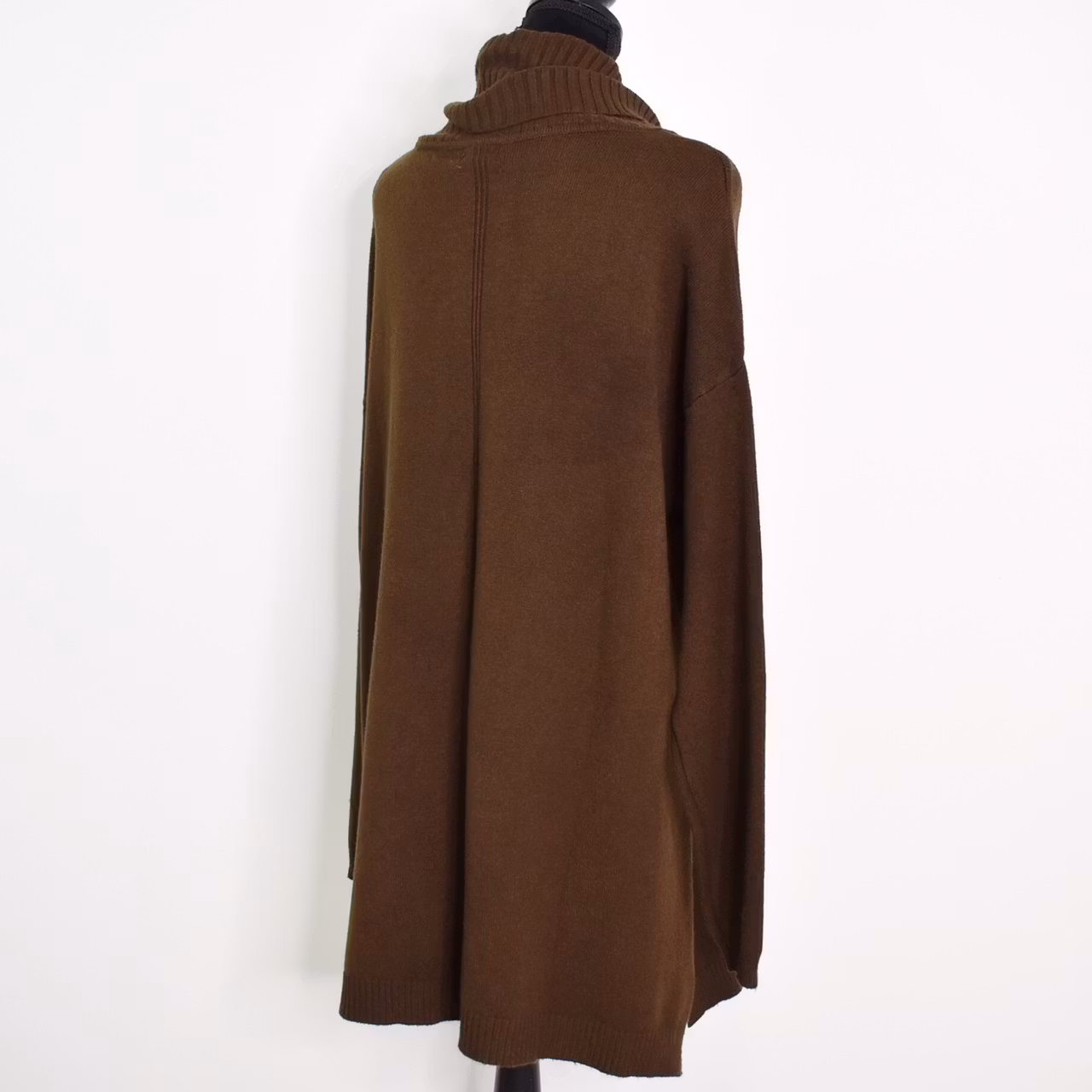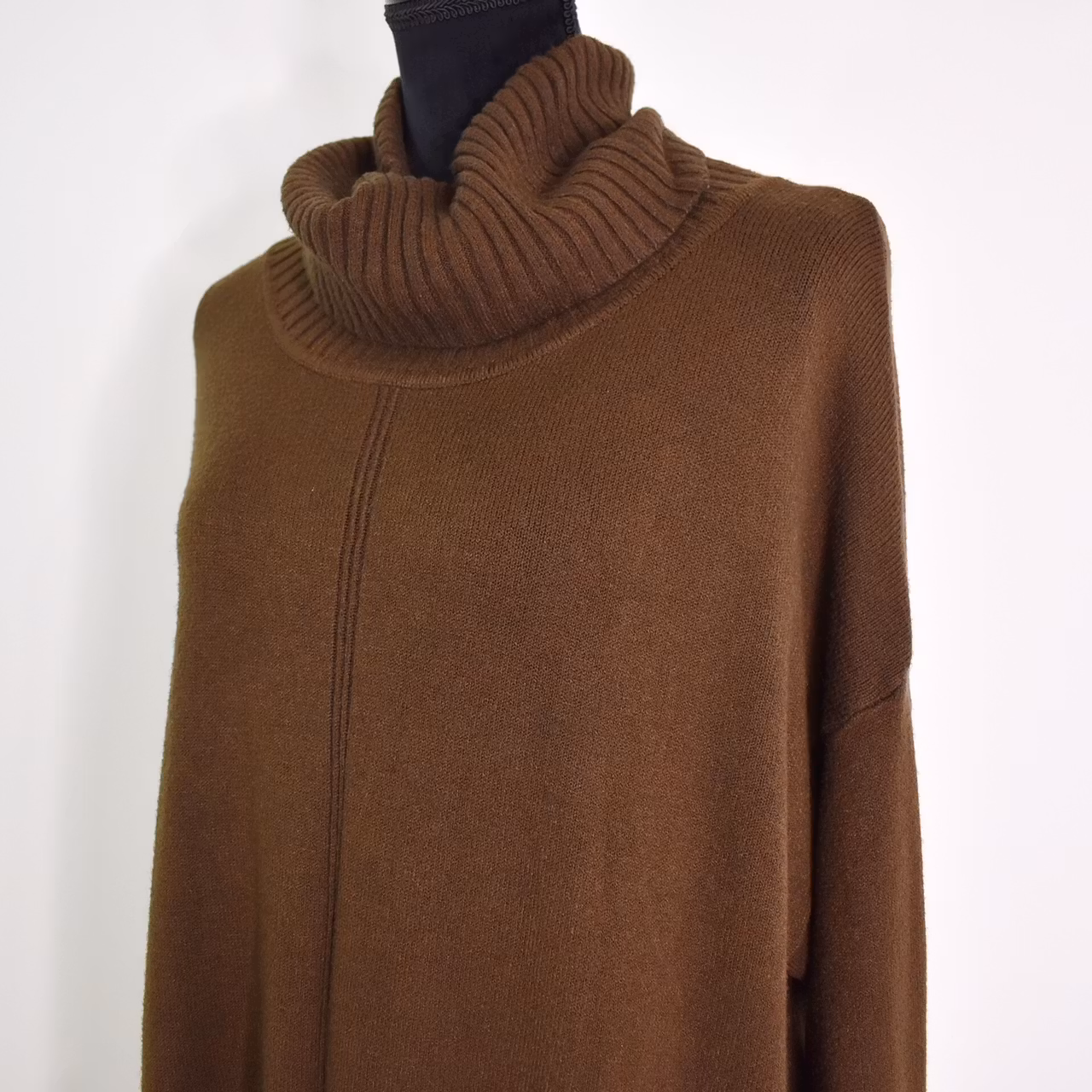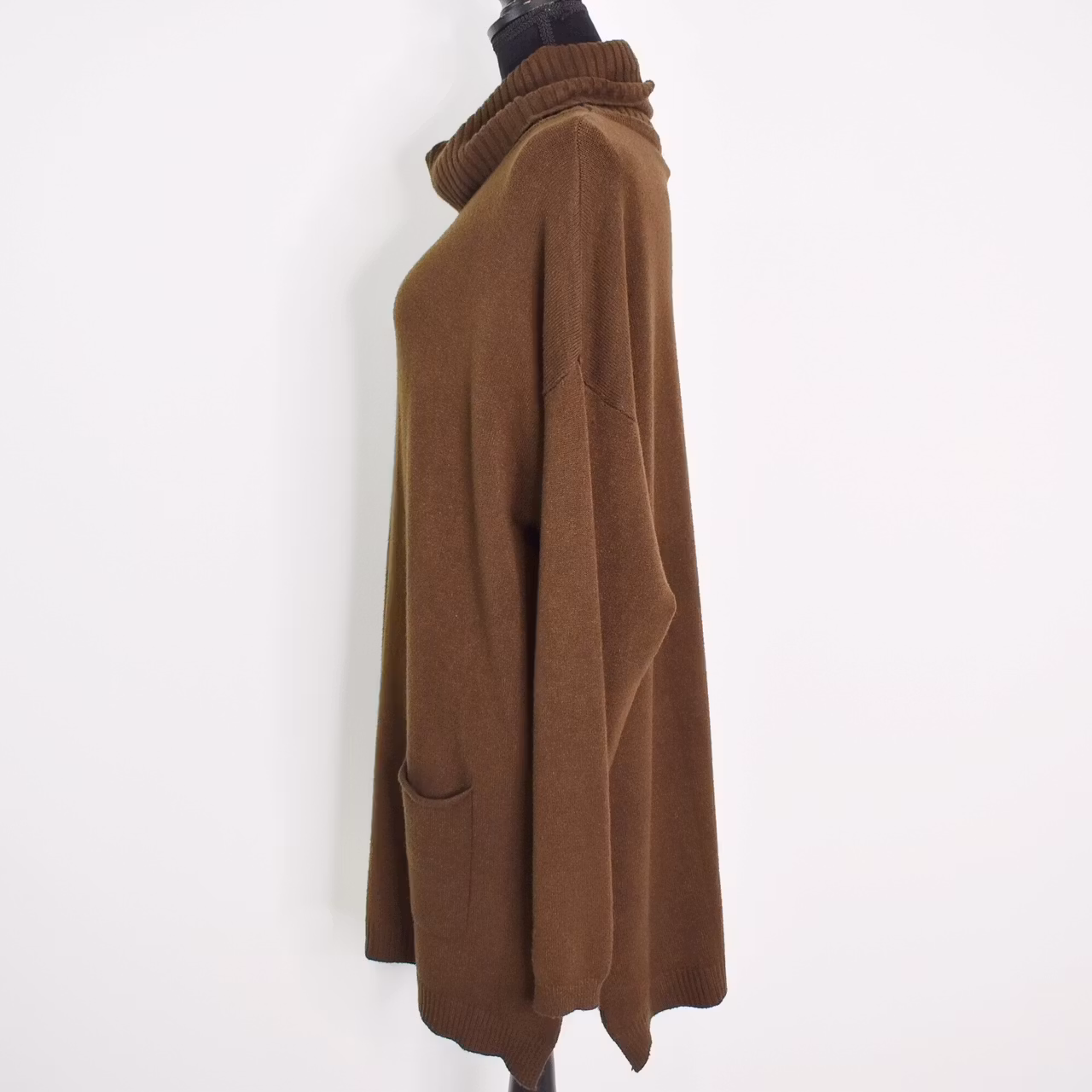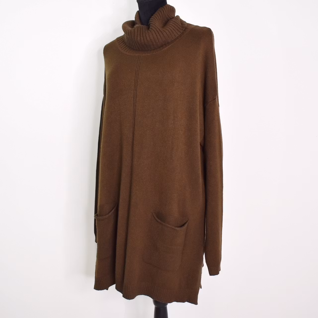Det här är en fin och mysig finstickad långtröja med lös polokrage. Ärmen är lång och axeln något nerhasad. Nertill på framsidan finns två fickor och i sidorna en liten slits. Kragen, ärmslutet och längst ner på tröjan är ribbstickade. Både fram och bak finns dekorativa lodrätta linjer. Tyget är supermjukt och följsamt. One Size - passar uppskattningsvis upp till XL (42). Då vi alla är olika formade rekommenderar vi att man tar hjälp av måtten nedan för att bedöma om plagget kan passa. Modellen har en bröstvidd på cirka 88cm, och är 163cm lång.