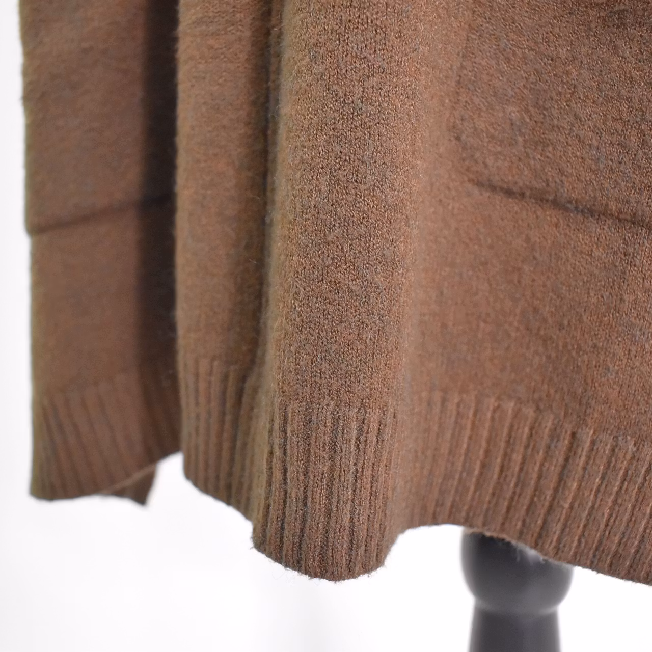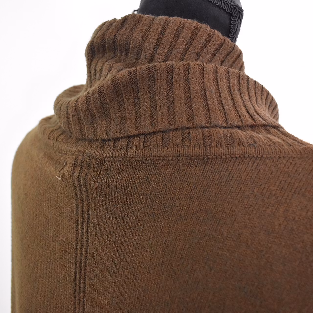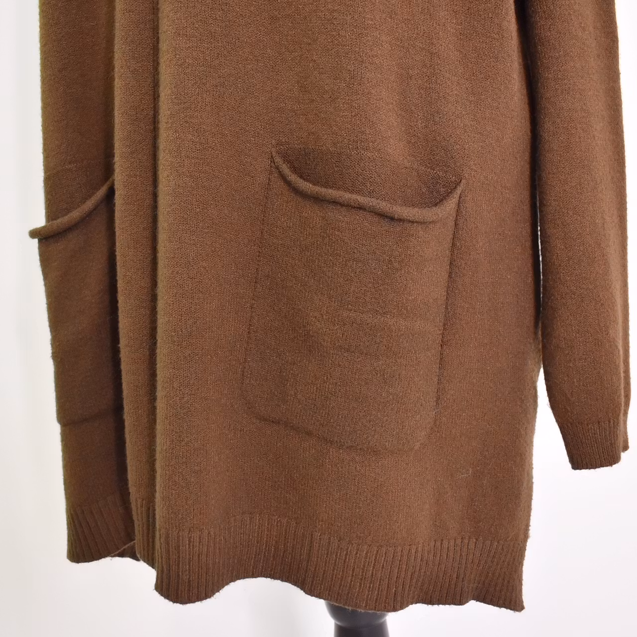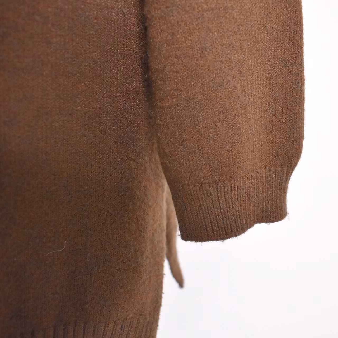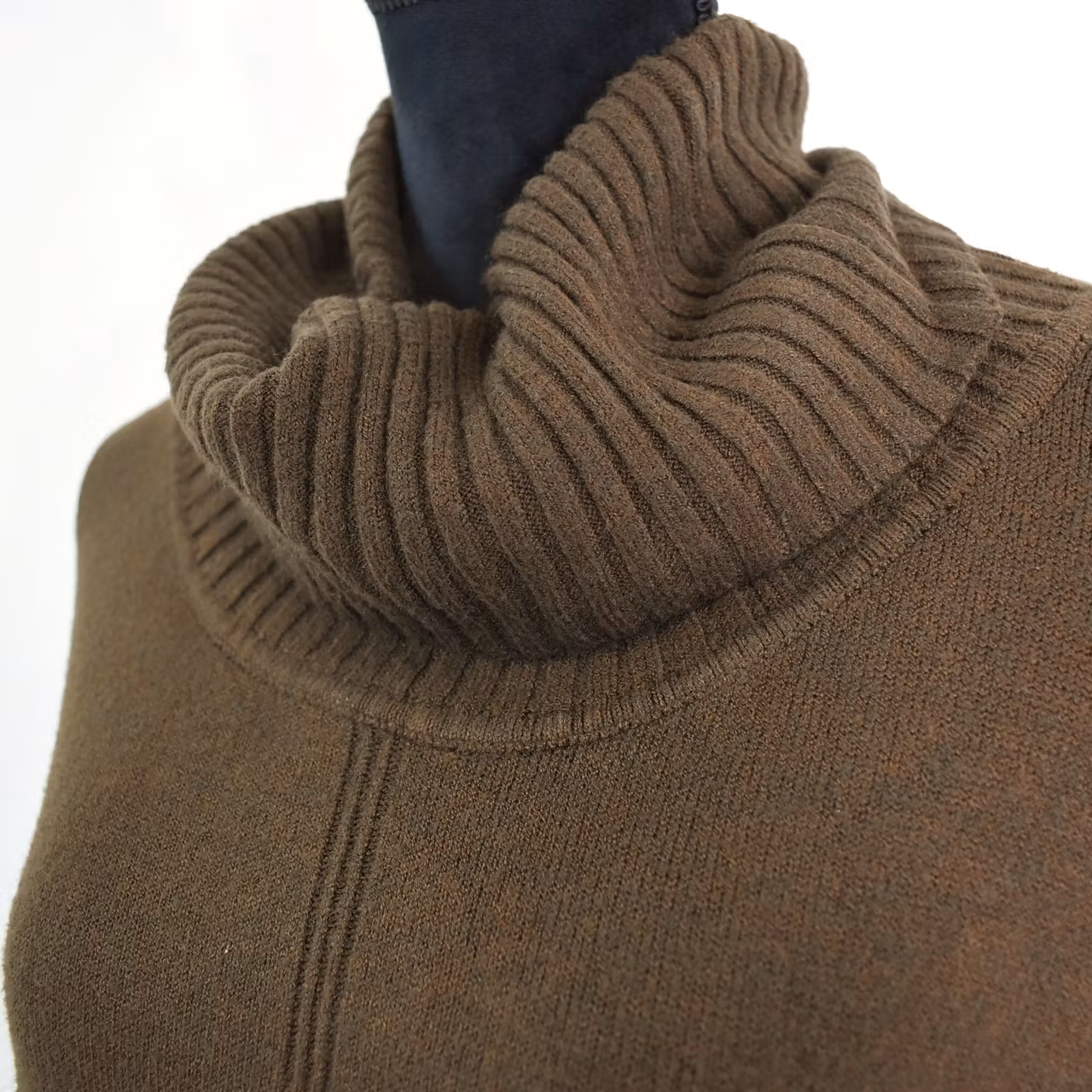Det här är en fin och mysig finstickad långtröja med lös polokrage. Ärmen är lång och axeln något nerhasad. Nertill på framsidan finns två fickor och i sidorna en liten slits. Kragen, ärmslutet och längst ner på tröjan är ribbstickade. Både fram och bak finns dekorativa lodrätta linjer. Tyget är supermjukt och följsamt. One Size - passar uppskattningsvis upp till XL (42). Då vi alla är olika formade rekommenderar vi att man tar hjälp av måtten nedan för att bedöma om plagget kan passa. Modellen har en bröstvidd på cirka 88cm, och är 163cm lång.
