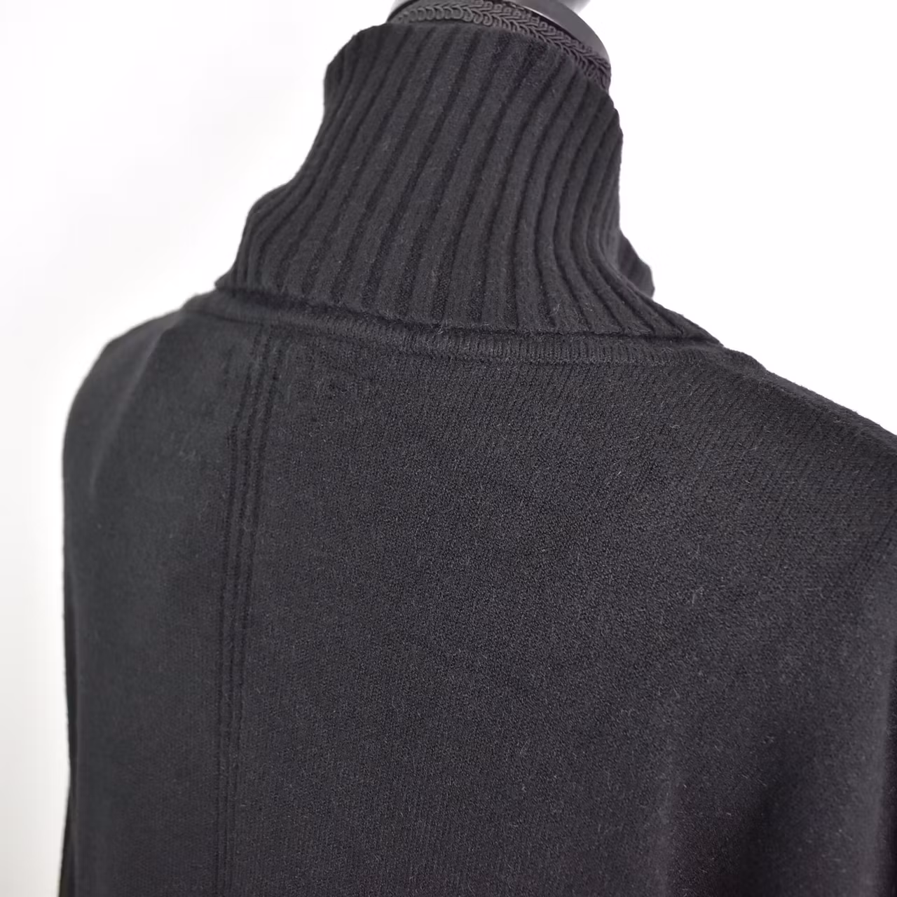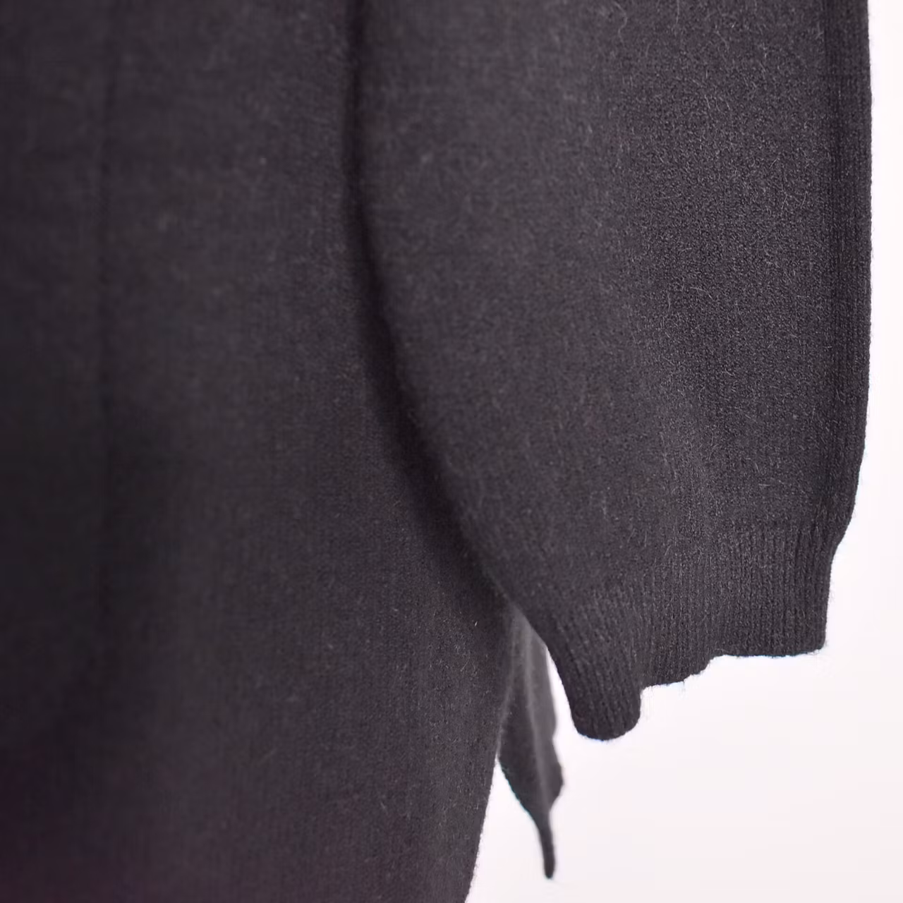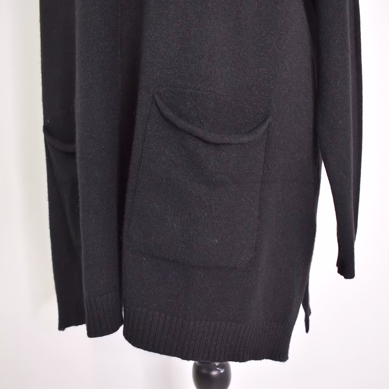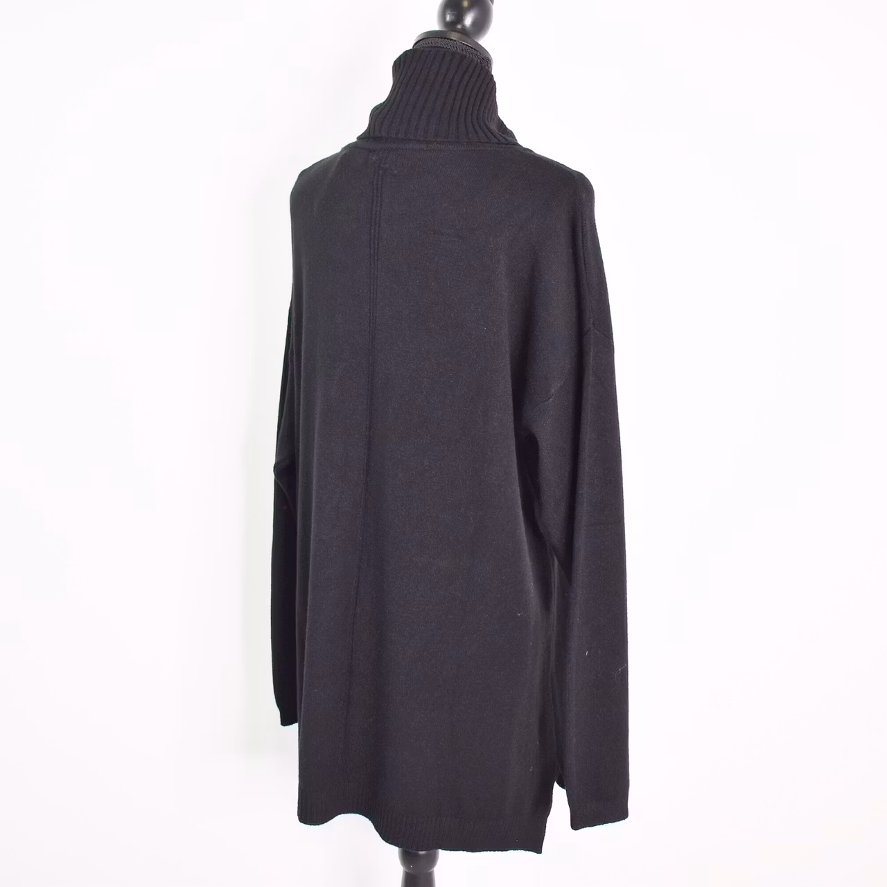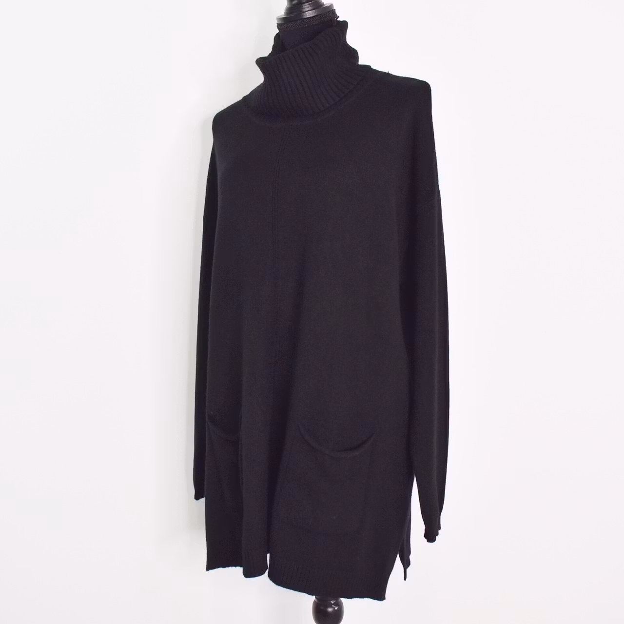 Det här är en fin och mysig finstickad långtröja med lös polokrage. Ärmen är lång och axeln något nerhasad. Nertill på framsidan finns två fickor och i sidorna en liten slits. Kragen, ärmslutet och längst ner på tröjan är ribbstickade. Både fram och bak finns dekorativa lodrätta linjer. Tyget är supermjukt och följsamt. One Size - passar uppskattningsvis upp till XL (42). Då vi alla är olika formade rekommenderar vi att man tar hjälp av måtten nedan för att bedöma om plagget kan passa. Modellen har en bröstvidd på cirka 88cm, och är 163cm lång.