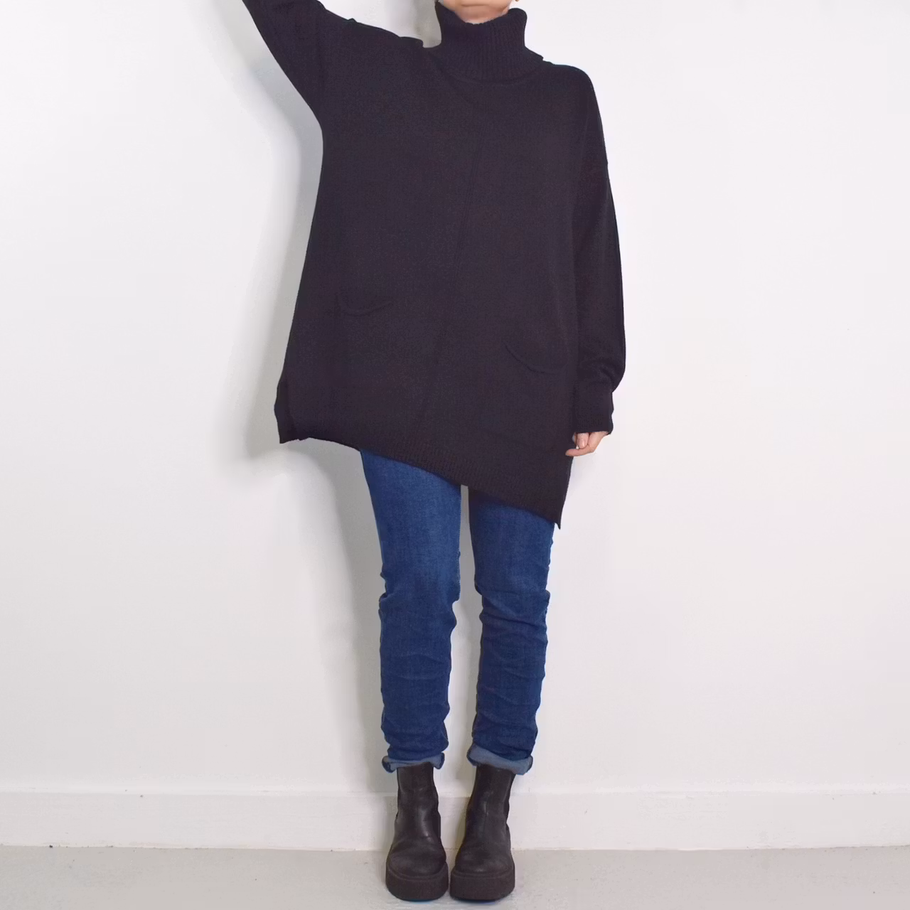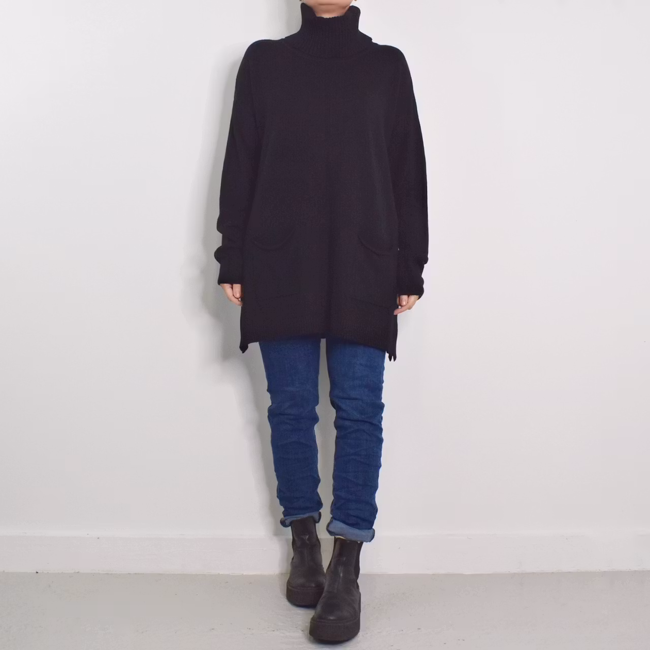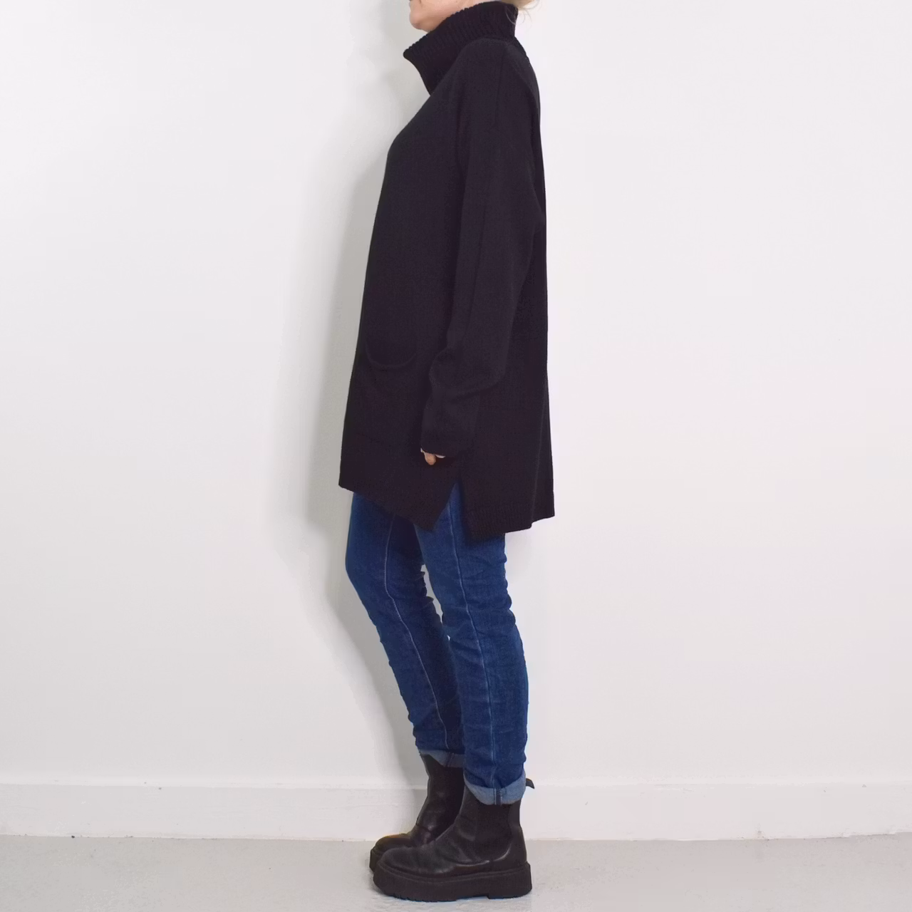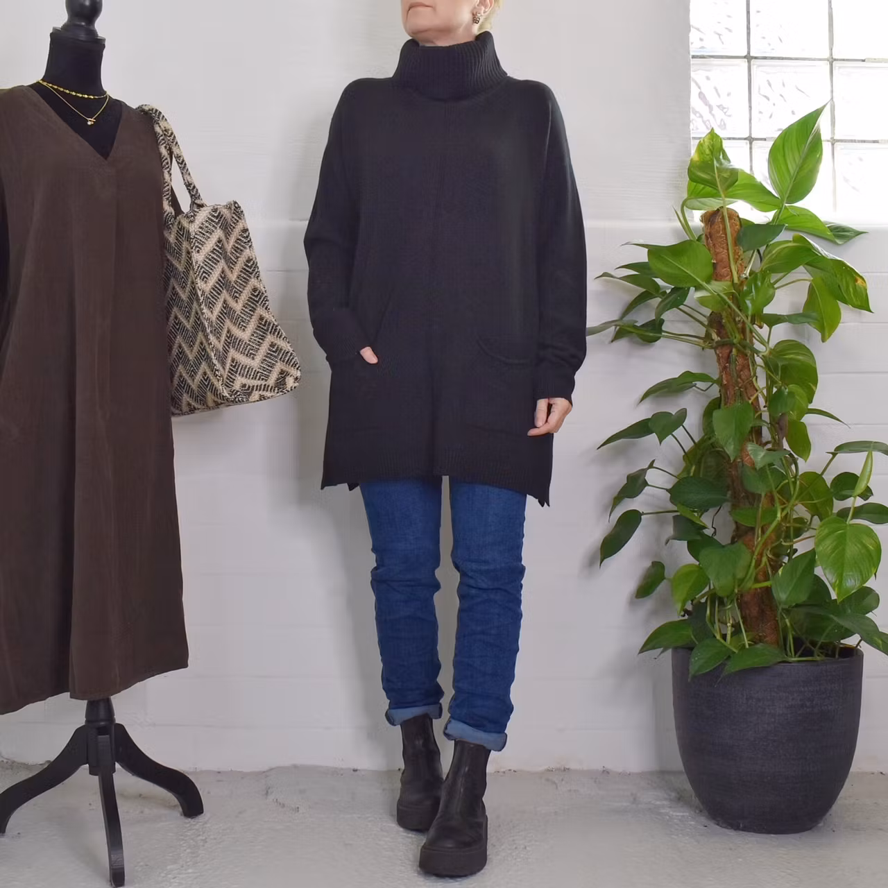 Bra att veta: Supermjukt tyg. Lös polokrage och nerhasad axel. Fickor fram och liten slits i sidorna.