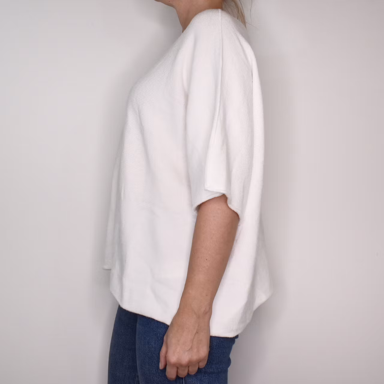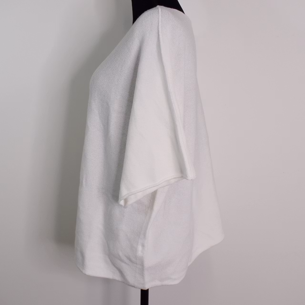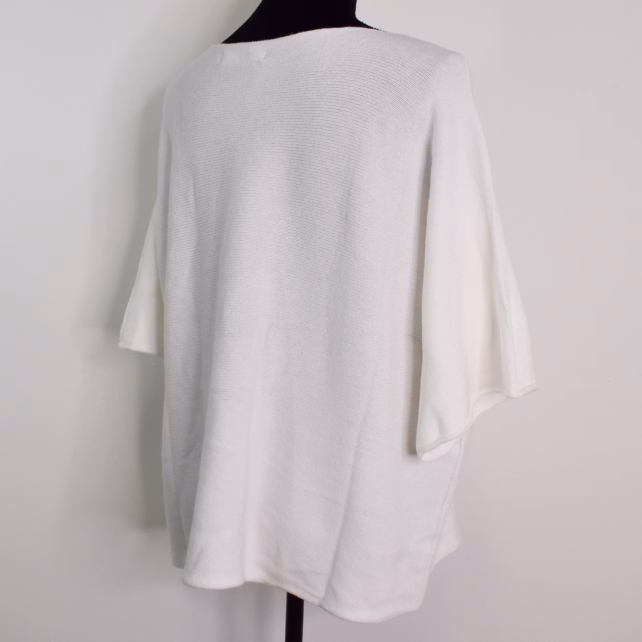 Det här är en härlig finstickad ponchotröja i mjukt och skönt material. Ponchotröjan är kort och vid och har kort ärm. Halsen är tjusigt rundad. Materialet är mjukt och följsamt. Avslappnad passform. Modellen har en bröstvidd på cirka 88cm och är 163cm lång.