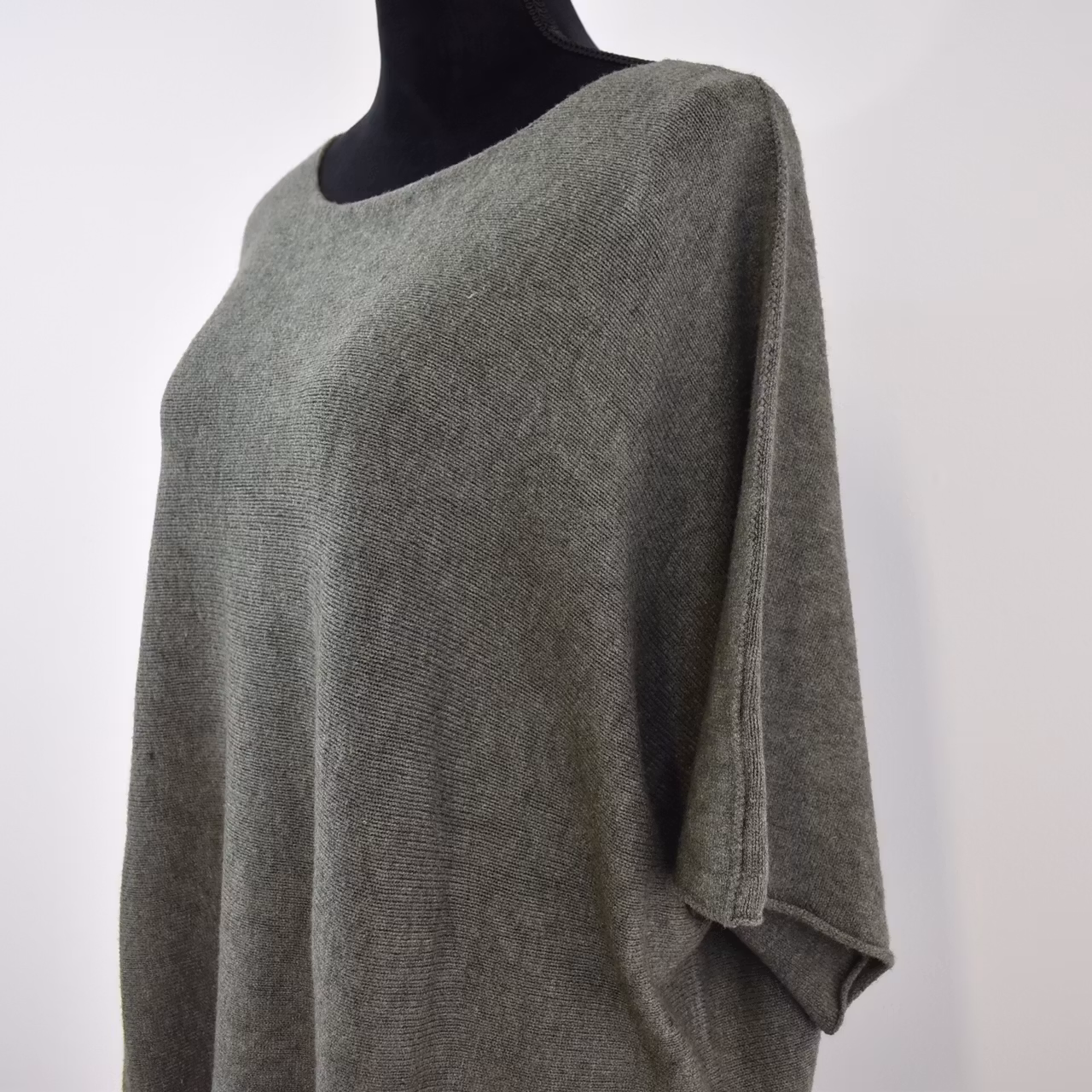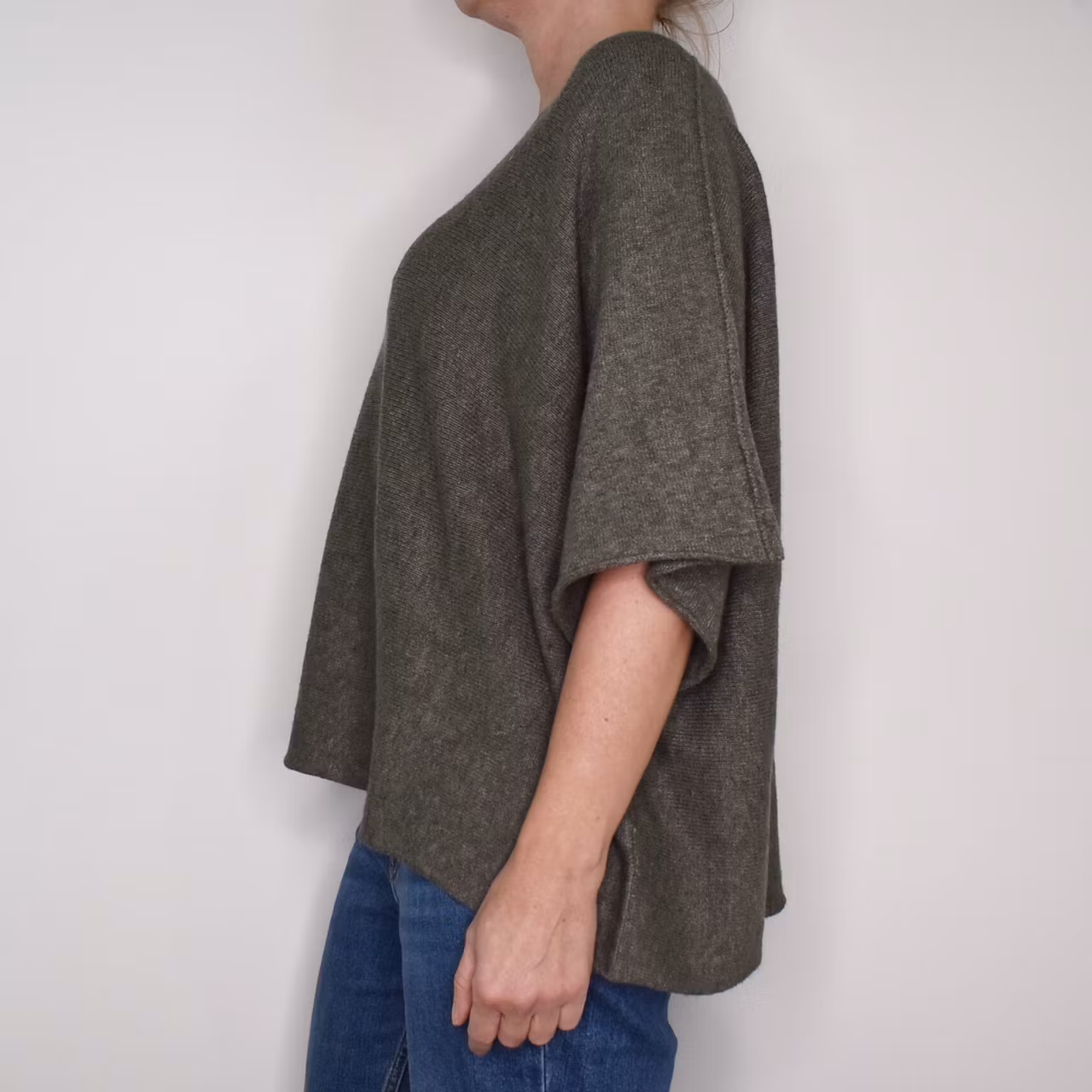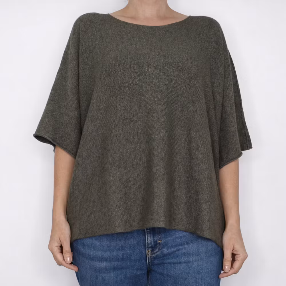 Det här är en härlig finstickad ponchotröja i skönt material. Ponchotröjan är kort och mycket vid, samt har kort ärm. Halsen är tjusigt rundad. Materialet är mjukt och följsamt. Rymlig passform! Modellen har en bröstvidd på cirka 88cm och är 163cm lång.