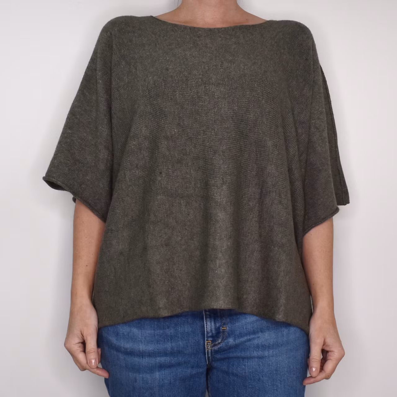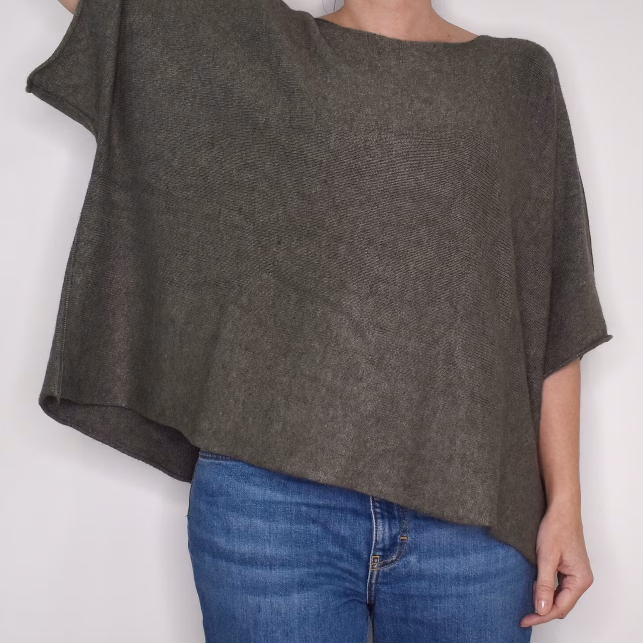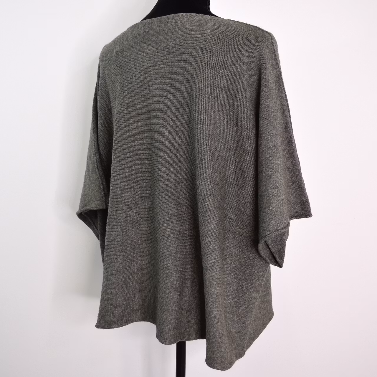 Det här är en härlig finstickad ponchotröja i skönt material. Ponchotröjan är kort och mycket vid, samt har kort ärm. Halsen är tjusigt rundad. Materialet är mjukt och följsamt. Rymlig passform! Modellen har en bröstvidd på cirka 88cm och är 163cm lång.