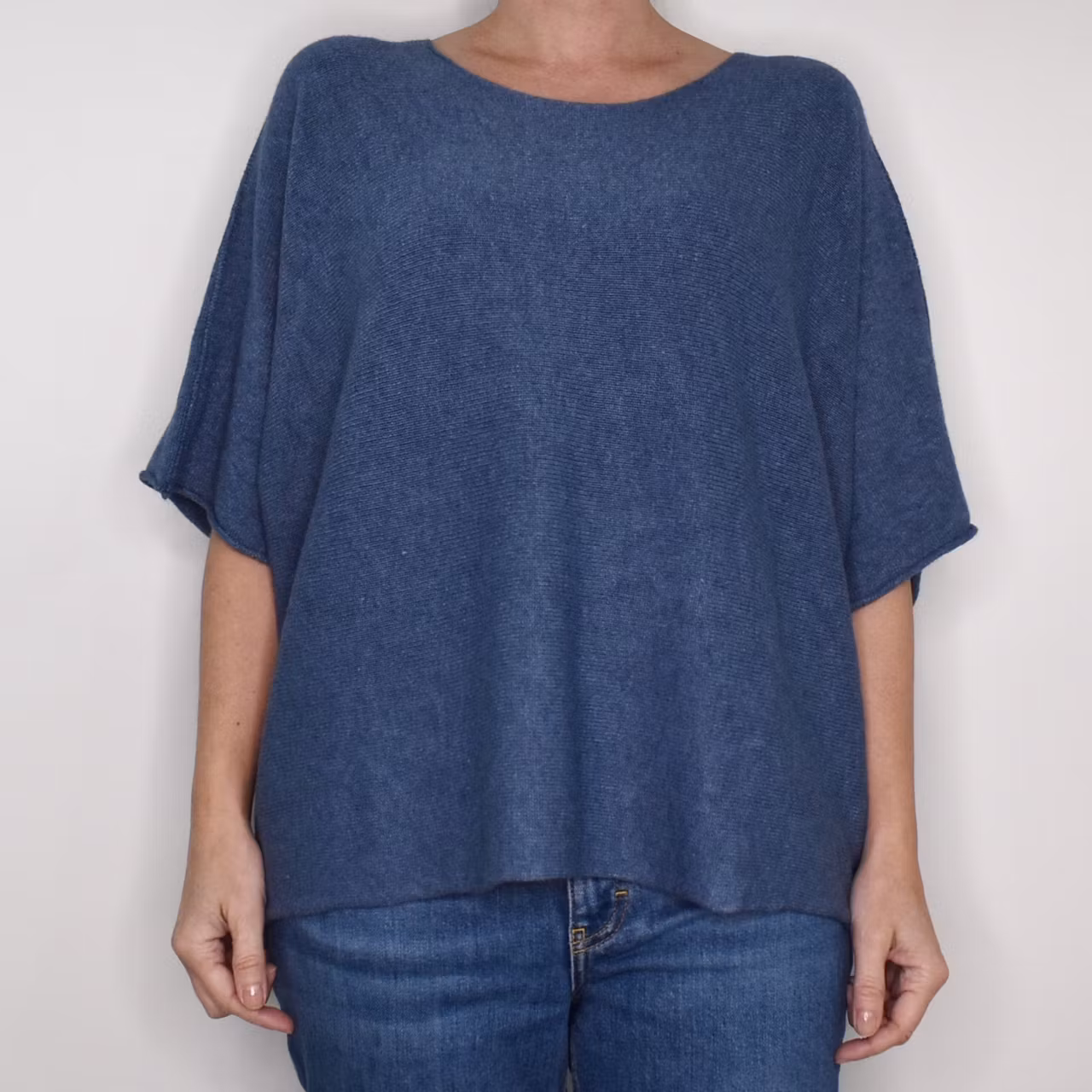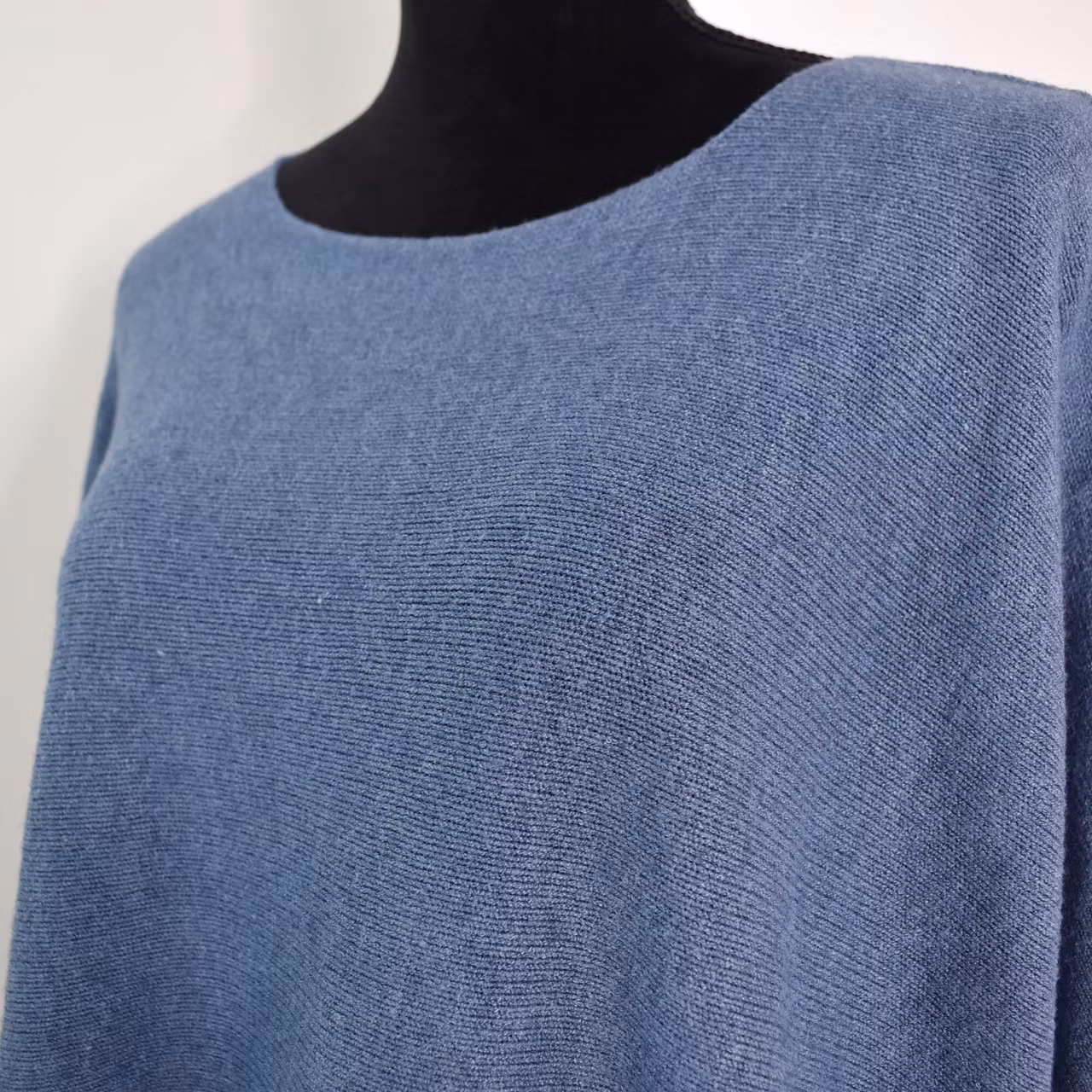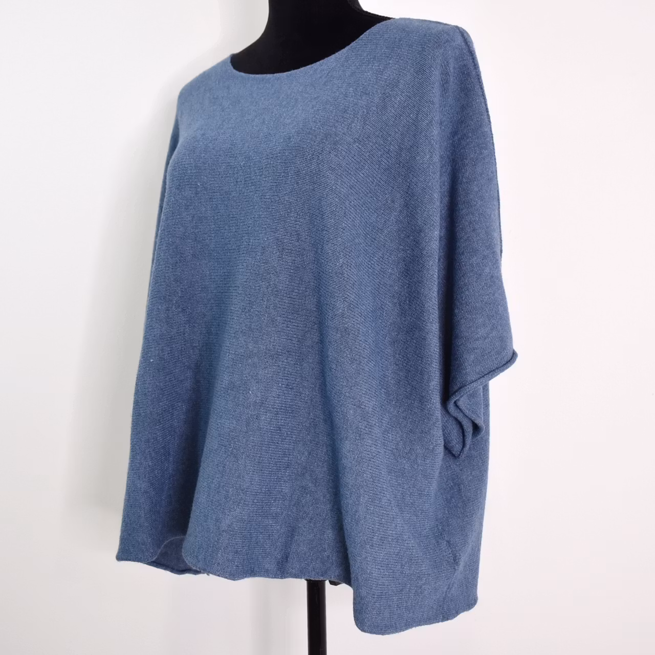 Det här är en härlig finstickad ponchotröja i skönt material. Ponchotröjan är kort och mycket vid, samt har kort ärm. Halsen är tjusigt rundad. Materialet är mjukt och följsamt. Rymlig passform! Modellen har en bröstvidd på cirka 88cm och är 163cm lång.