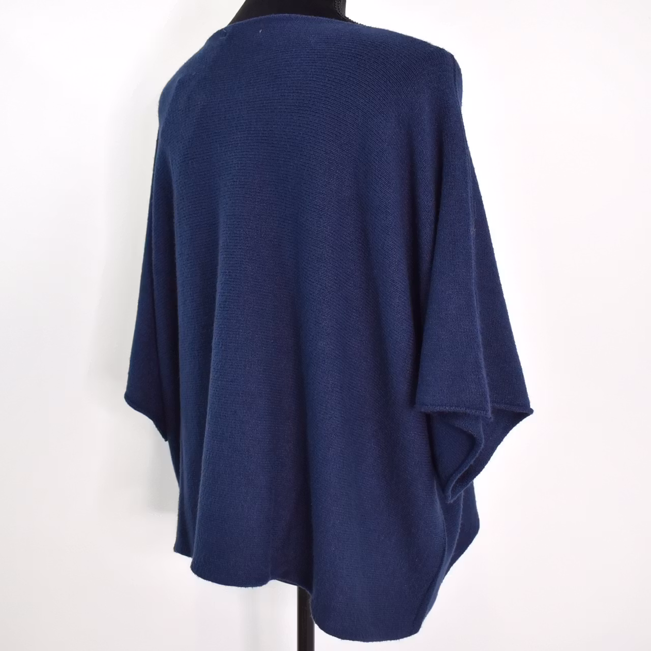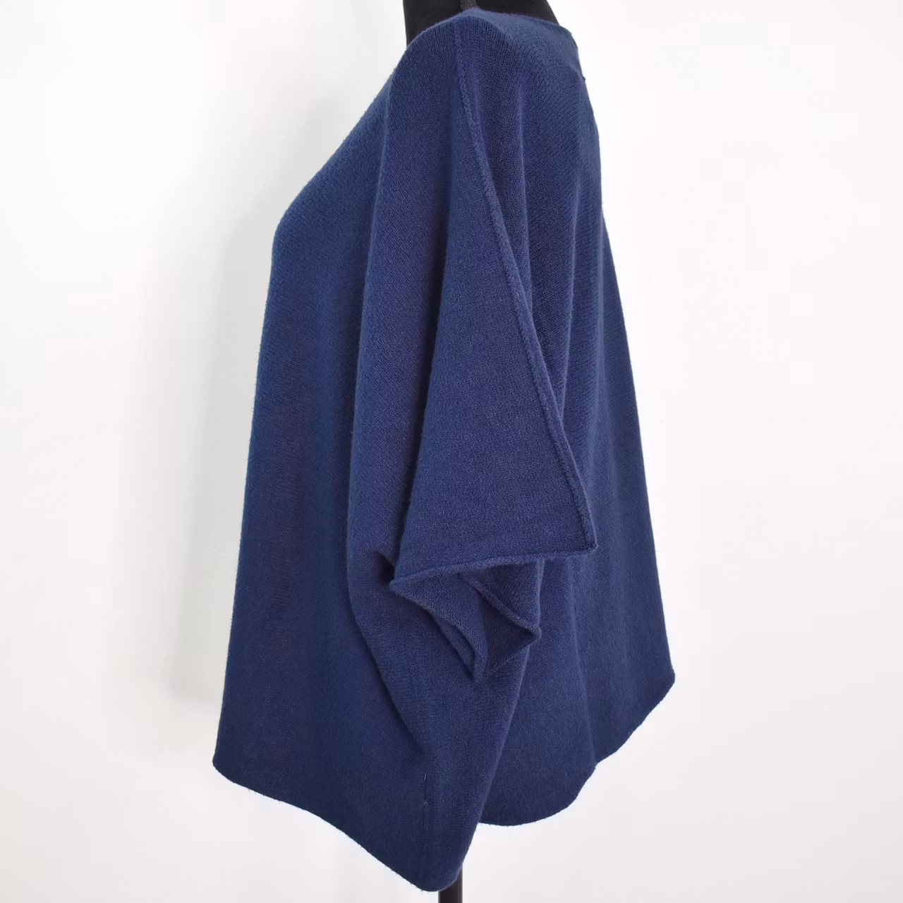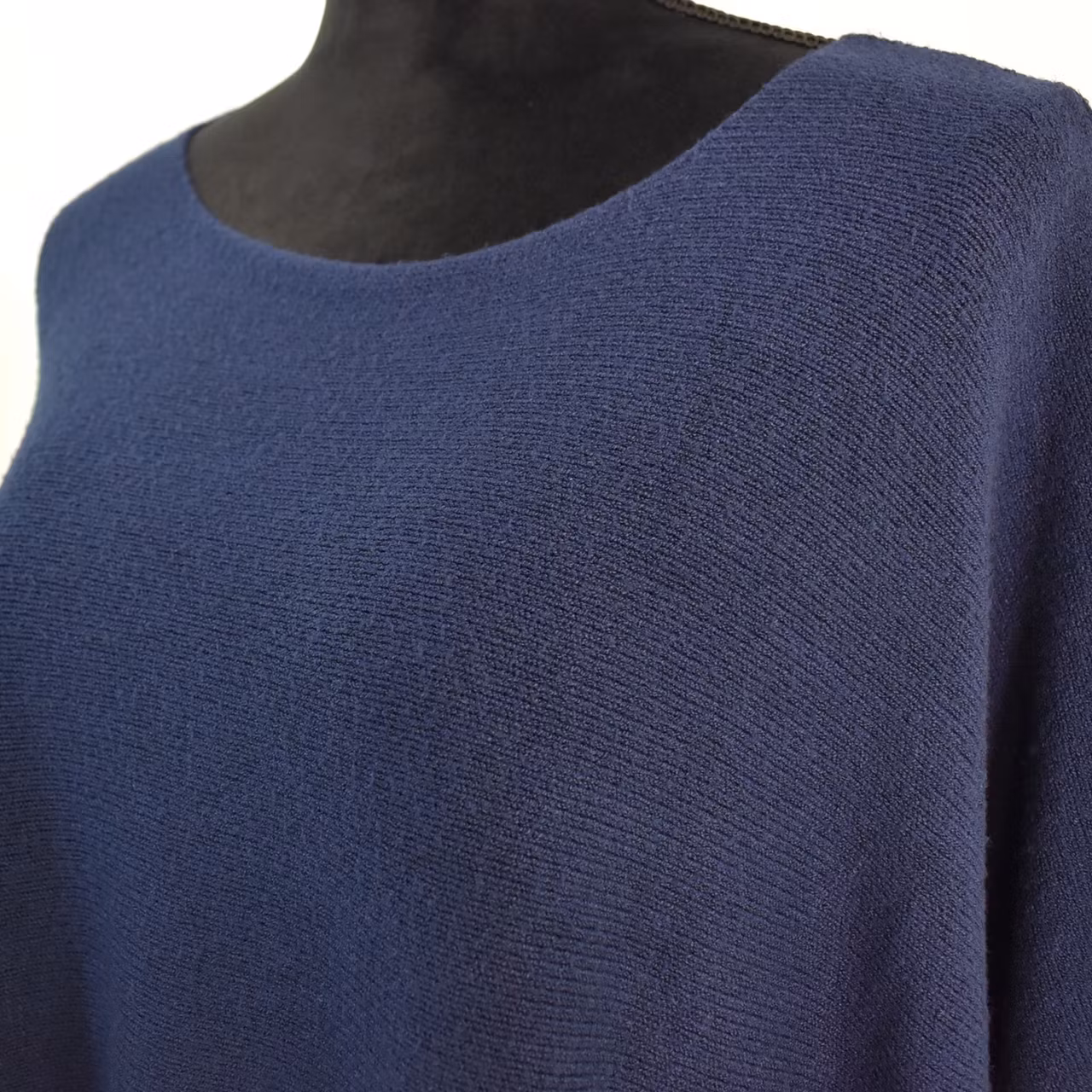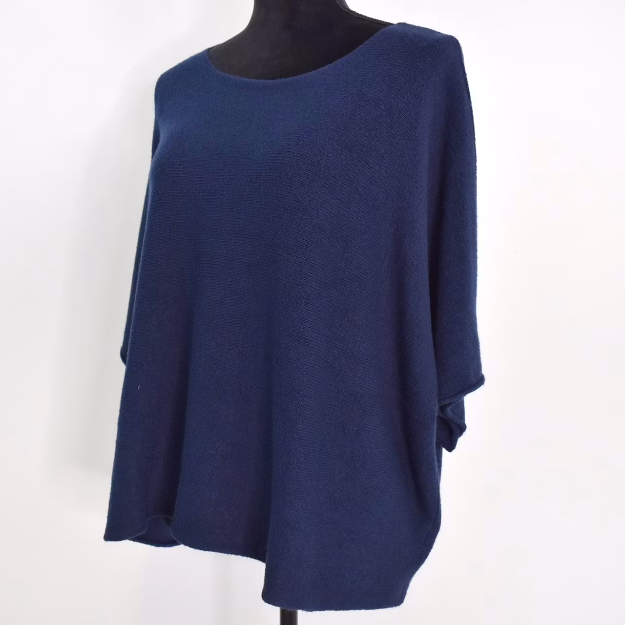 Det här är en härlig finstickad ponchotröja i skönt material. Ponchotröjan är kort och mycket vid, samt har kort ärm. Halsen är tjusigt rundad. Materialet är mjukt och följsamt. Rymlig passform! Då vi alla är olika formade rekommenderar vi att man tar hjälp av måtten nedan för att bedöma om plagget kan passa.