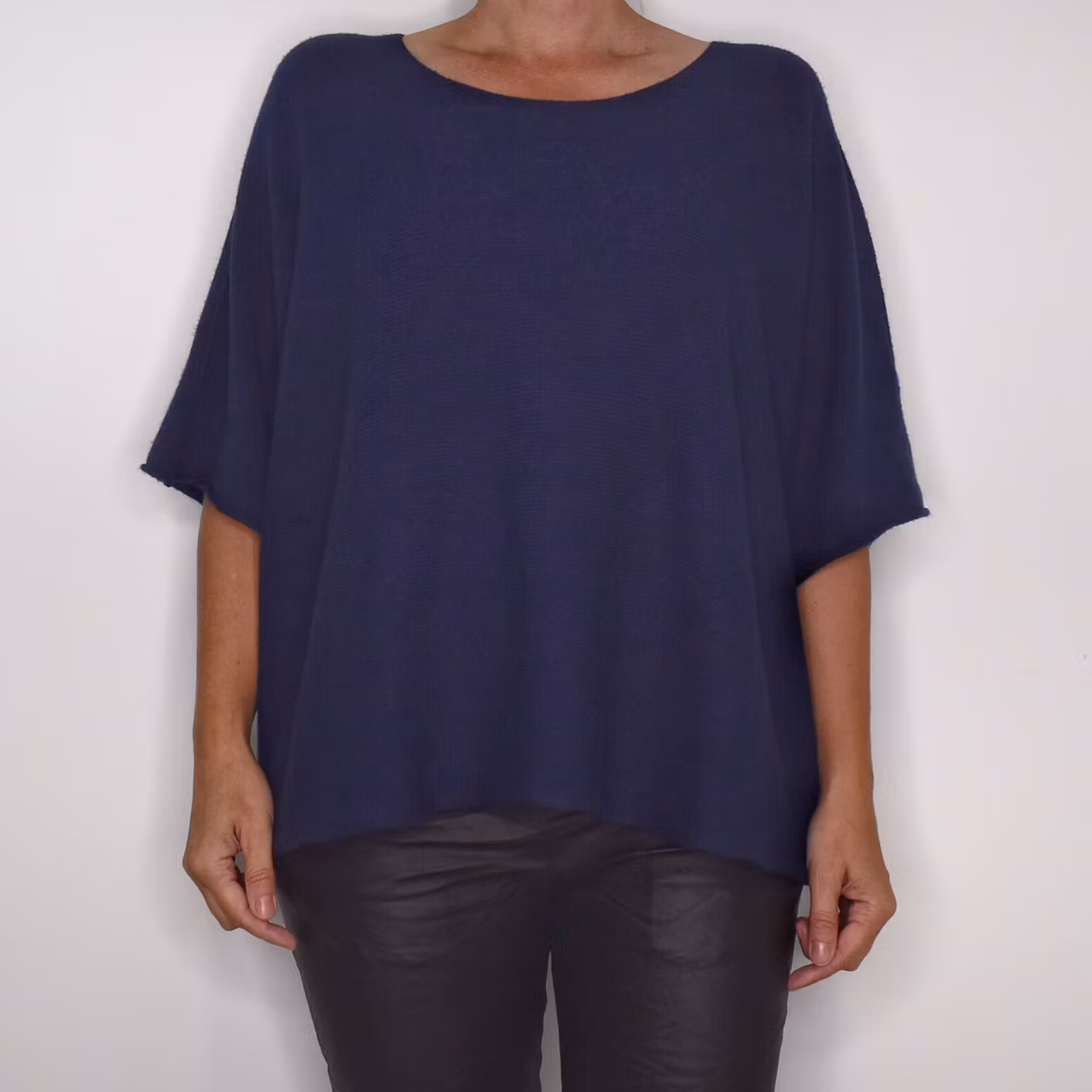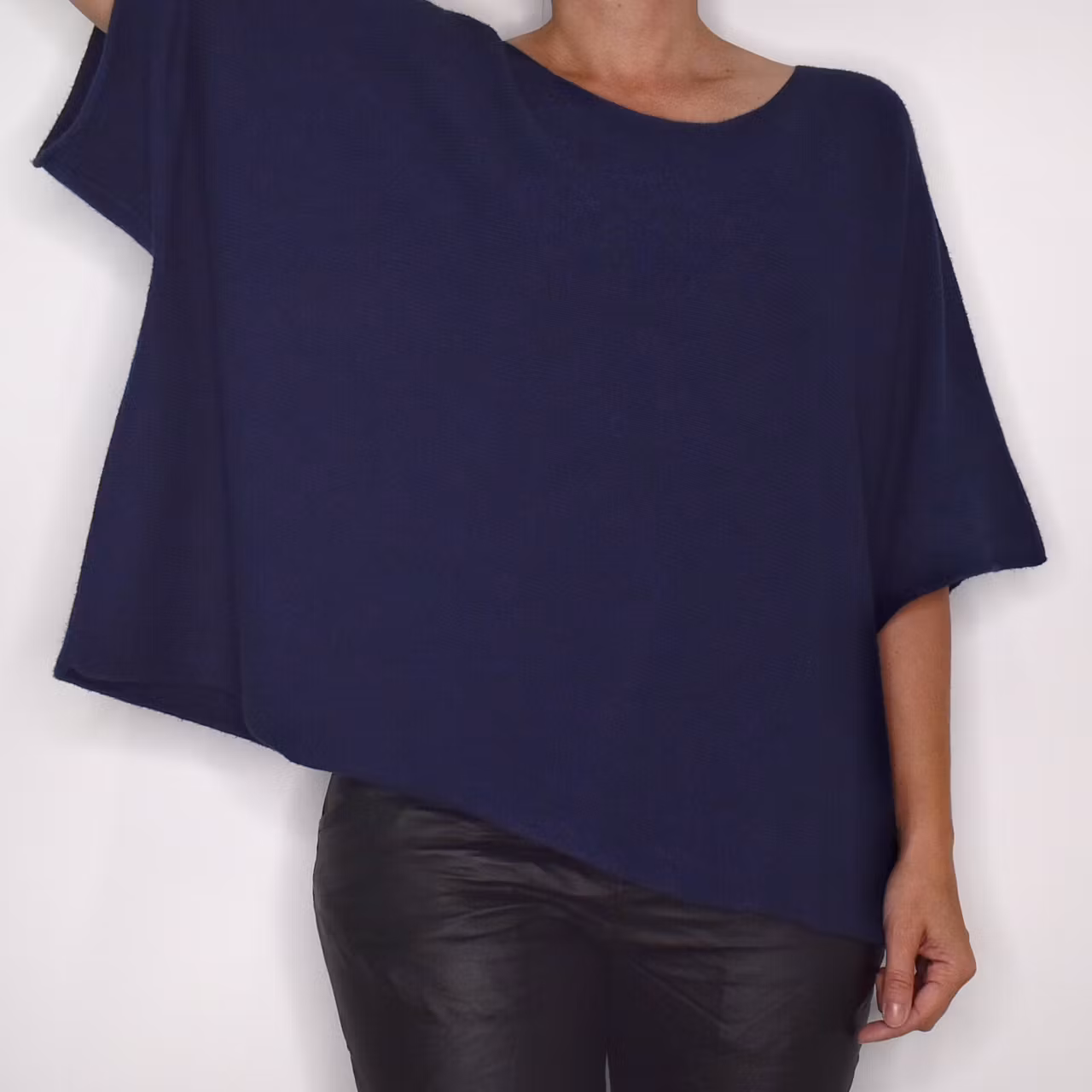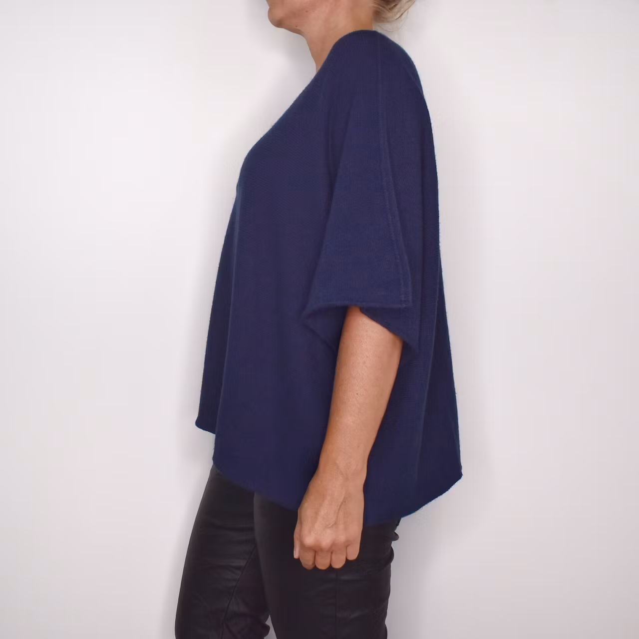 Det här är en härlig finstickad ponchotröja i skönt material. Ponchotröjan är kort och mycket vid, samt har kort ärm. Halsen är tjusigt rundad. Materialet är mjukt och följsamt. Rymlig passform! Då vi alla är olika formade rekommenderar vi att man tar hjälp av måtten nedan för att bedöma om plagget kan passa.