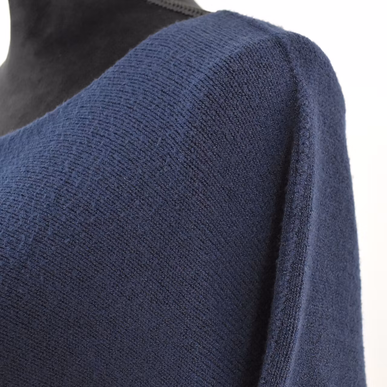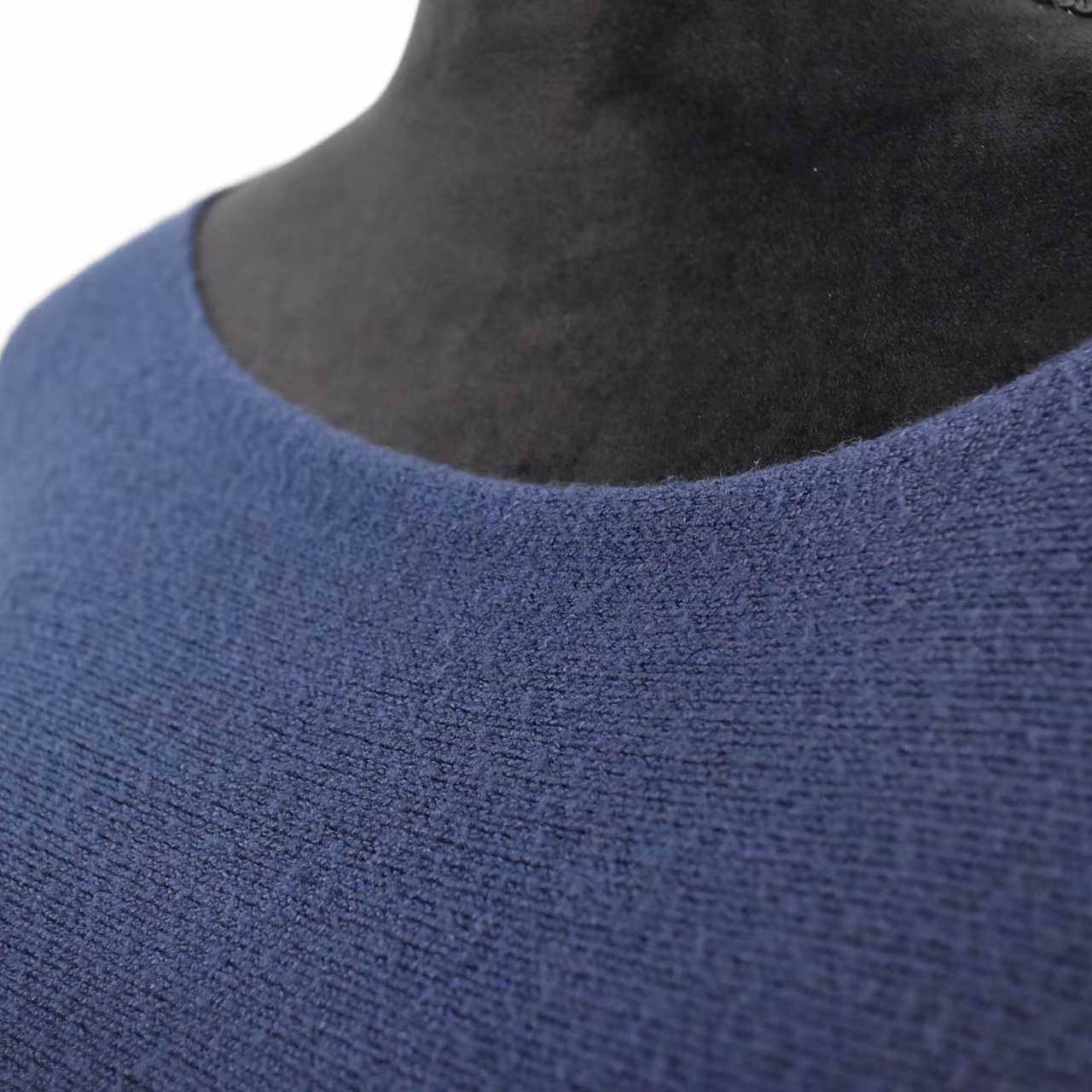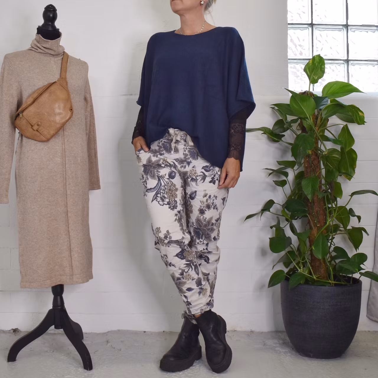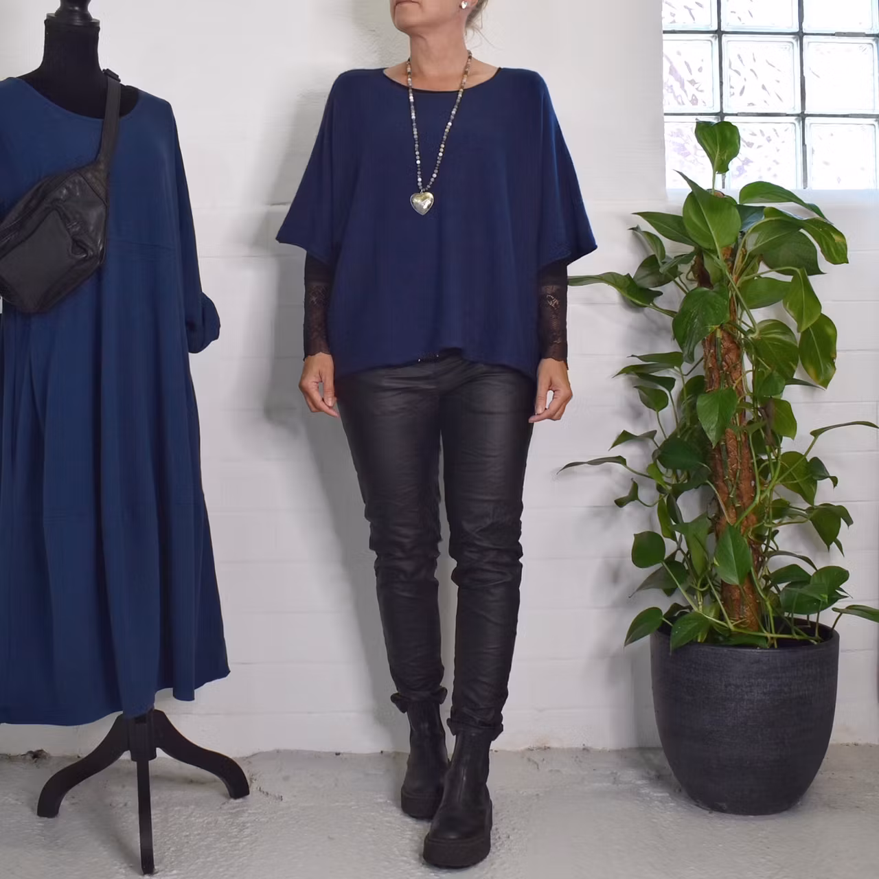 Det här är en härlig finstickad ponchotröja i skönt material. Ponchotröjan är kort och mycket vid, samt har kort ärm. Halsen är tjusigt rundad. Materialet är mjukt och följsamt. Rymlig passform! Då vi alla är olika formade rekommenderar vi att man tar hjälp av måtten nedan för att bedöma om plagget kan passa.