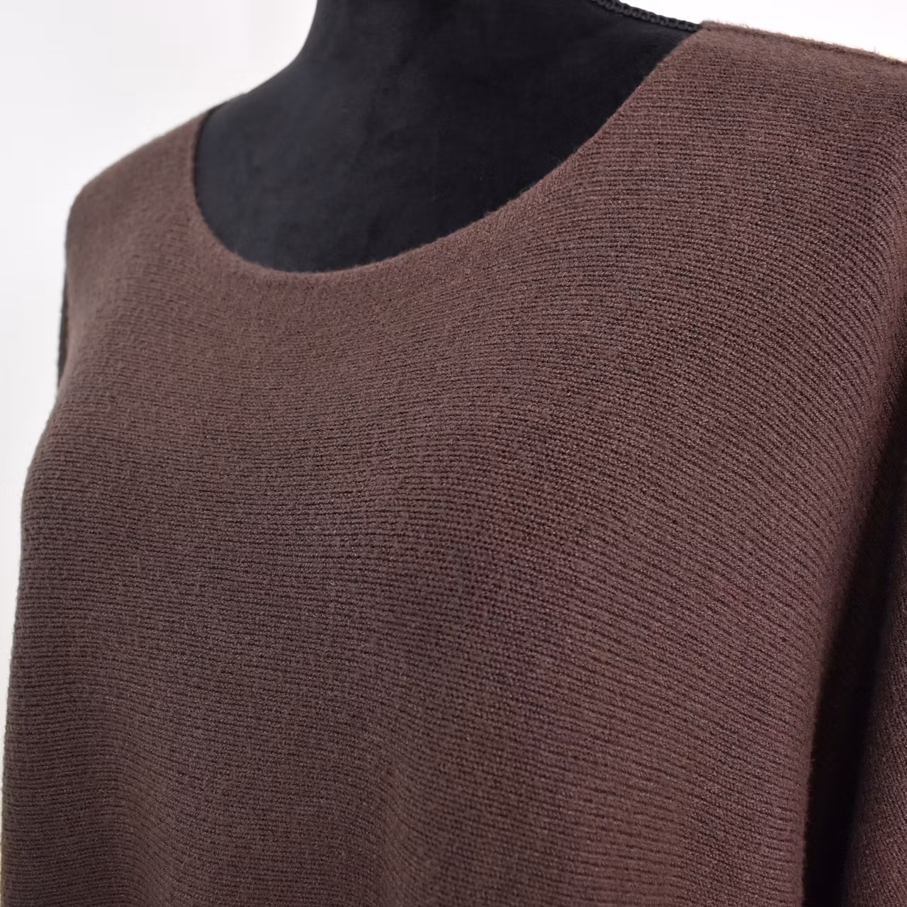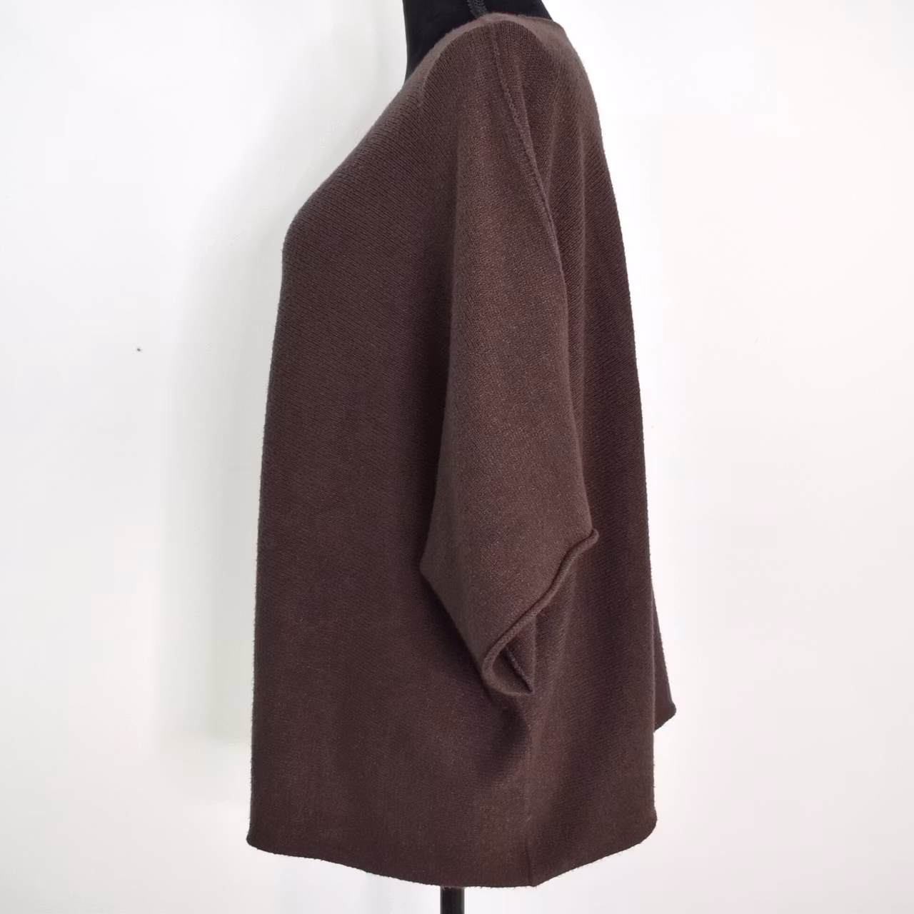 Det här är en härlig finstickad ponchotröja i skönt material. Ponchotröjan är kort och mycket vid, samt har kort ärm. Halsen är tjusigt rundad. Materialet är mjukt och följsamt. Rymlig passform! Då vi alla är olika formade rekommenderar vi att man tar hjälp av måtten nedan för att bedöma om plagget kan passa. Rymlig One Size - passar uppskattningsvis upp till XXL. Modellen har en bröstvidd på cirka 88cm och är 163cm lång.