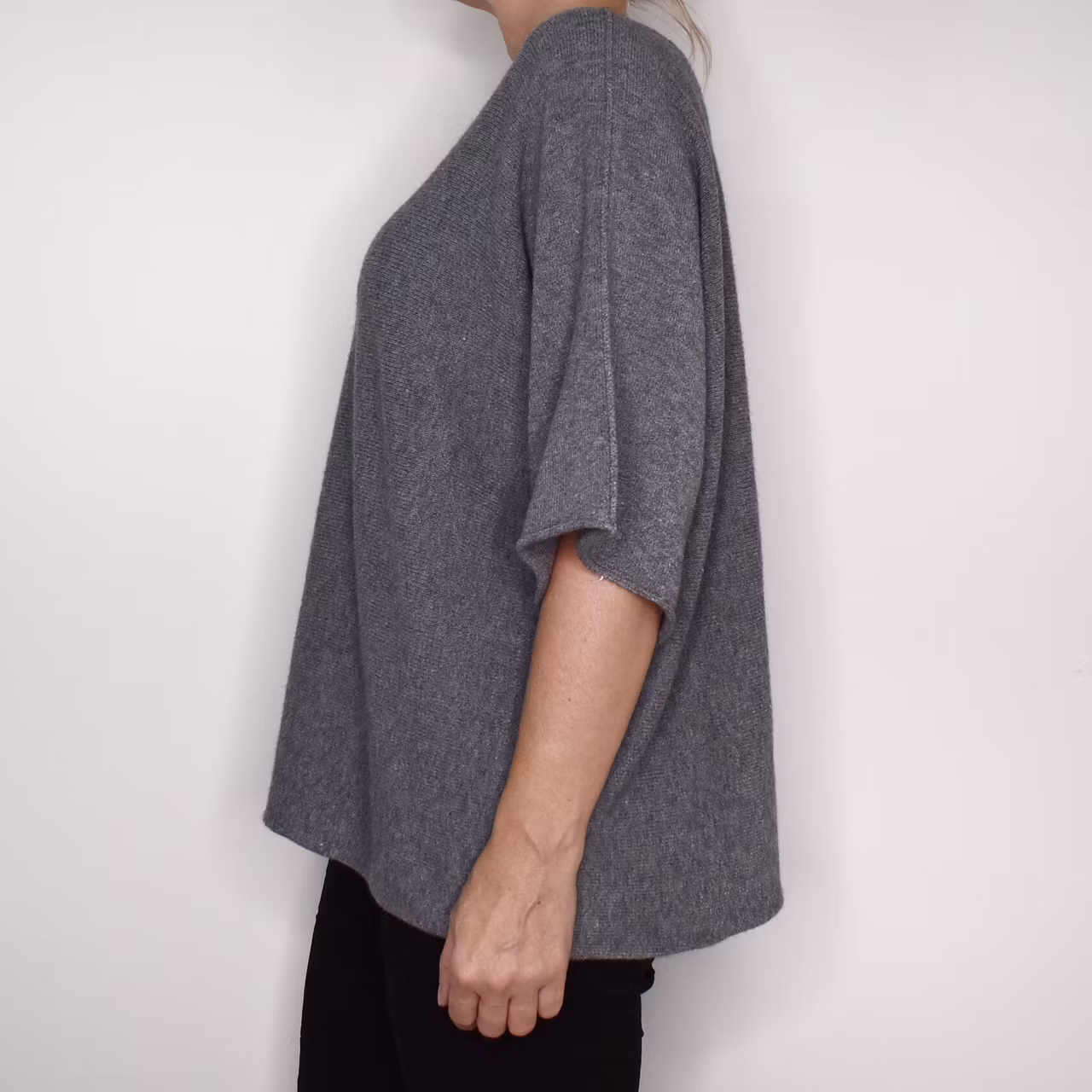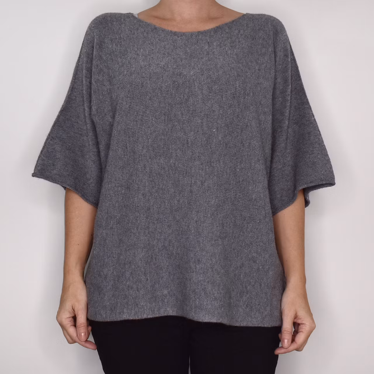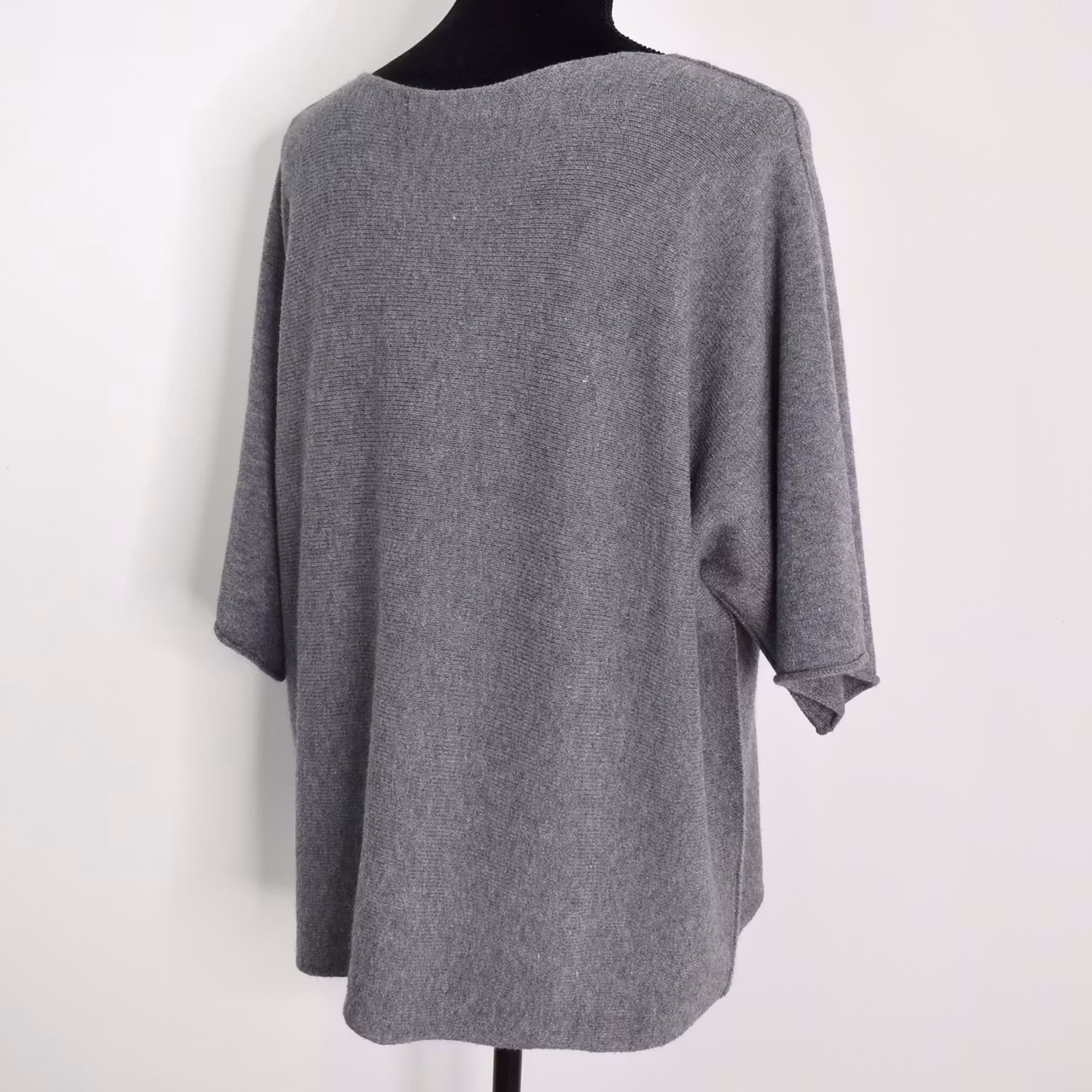 Det här är en härlig finstickad ponchotröja i mjukt och skönt material. Ponchotröjan är kort och vid och har kort ärm. Halsen är tjusigt rundad. Materialet är mjukt och följsamt. Avslappnad passform. Då vi alla är olika formade rekommenderar vi att man tar hjälp av måtten nedan för att bedöma om plagget kan passa. One Size - passar uppskattningsvis upp till L/XL. Modellen har en bröstvidd på cirka 88cm och är 163cm lång.