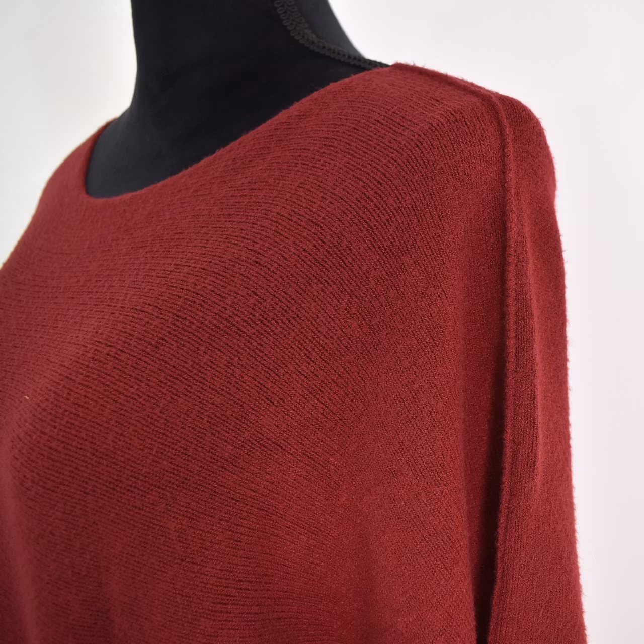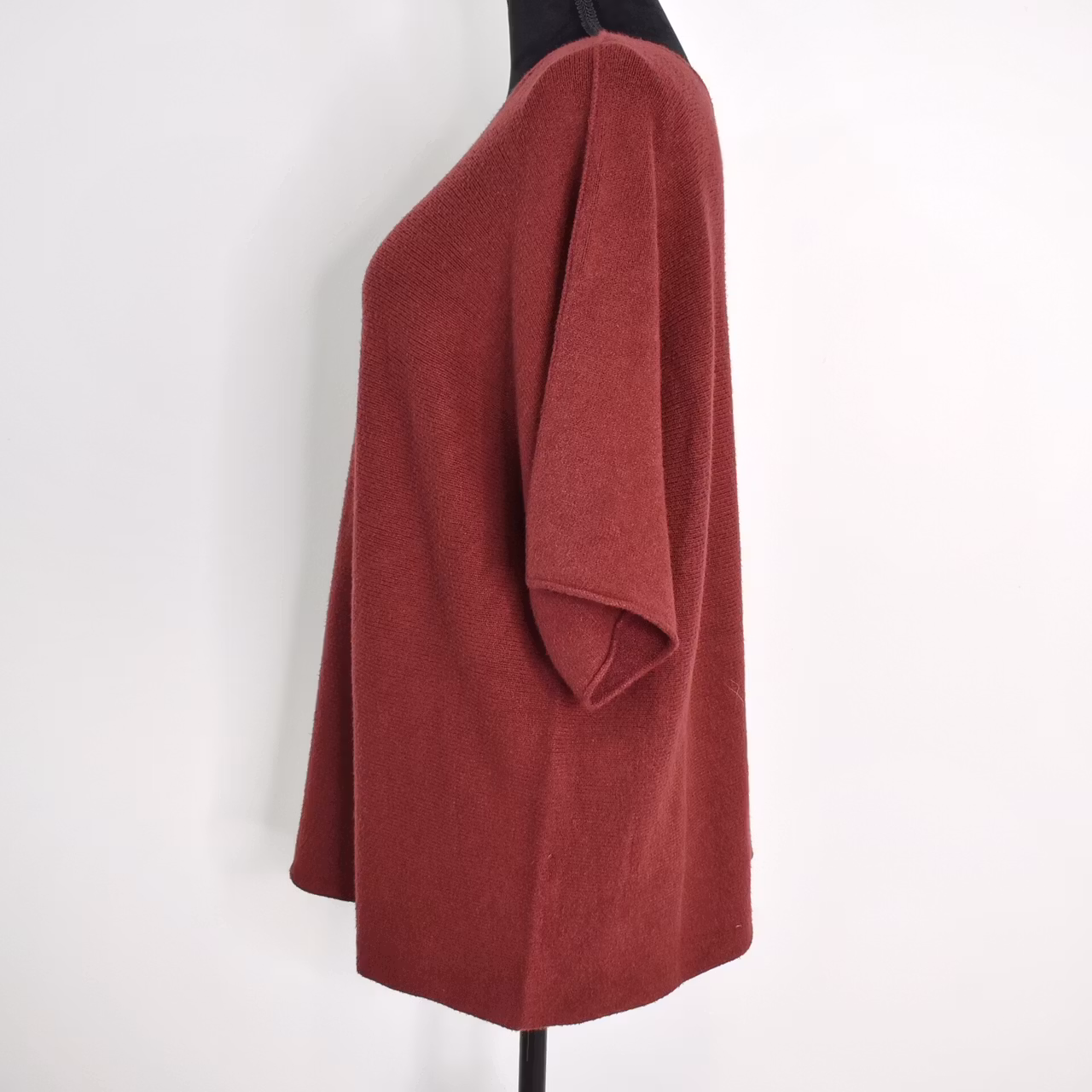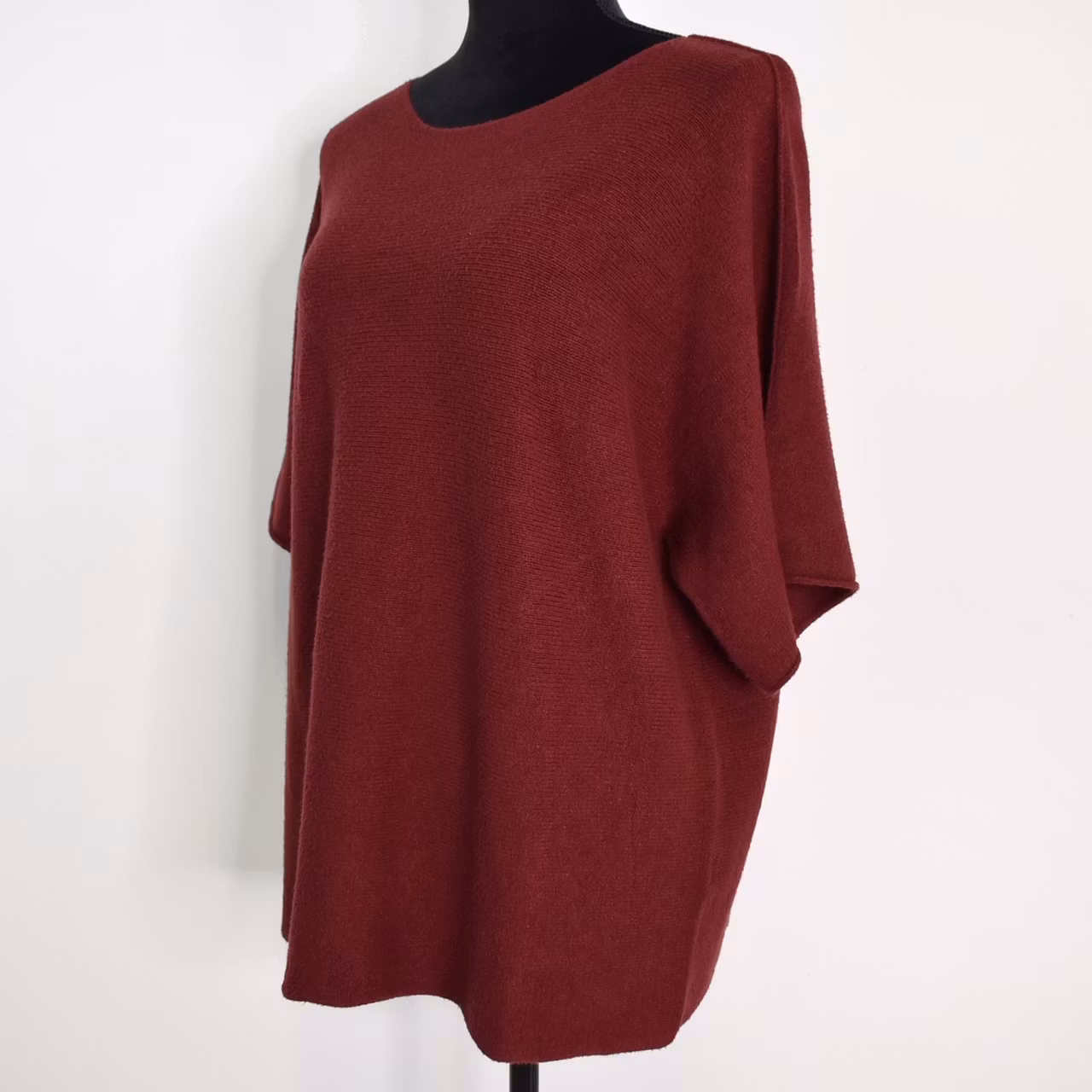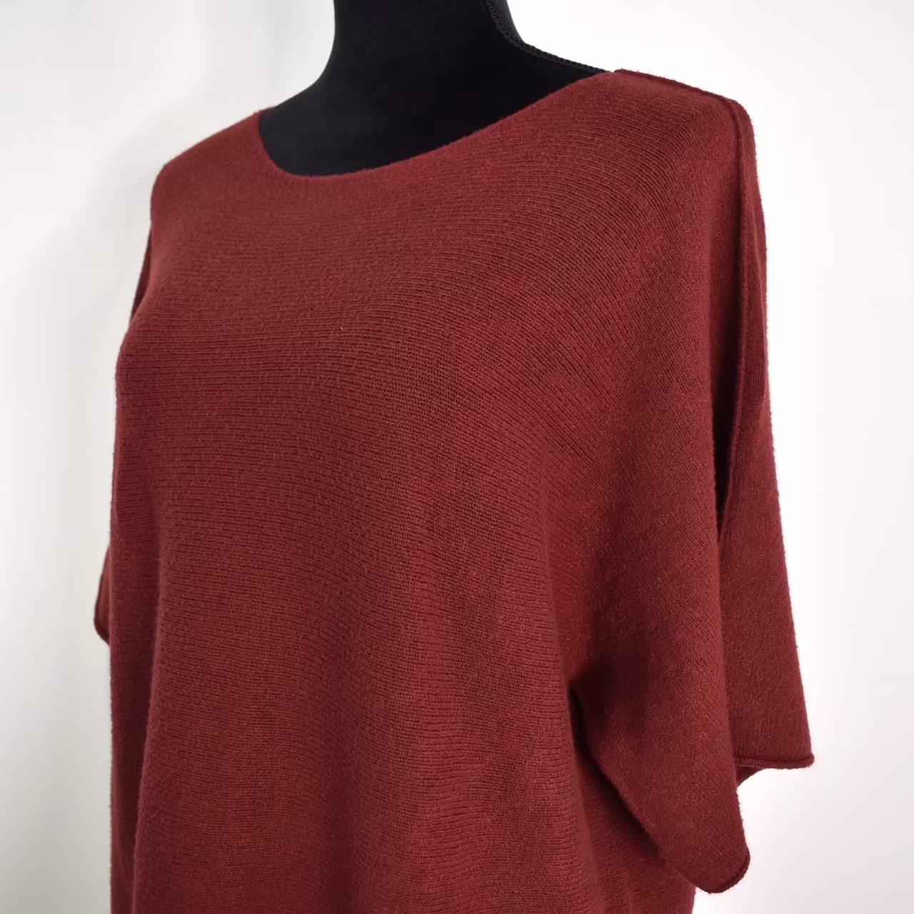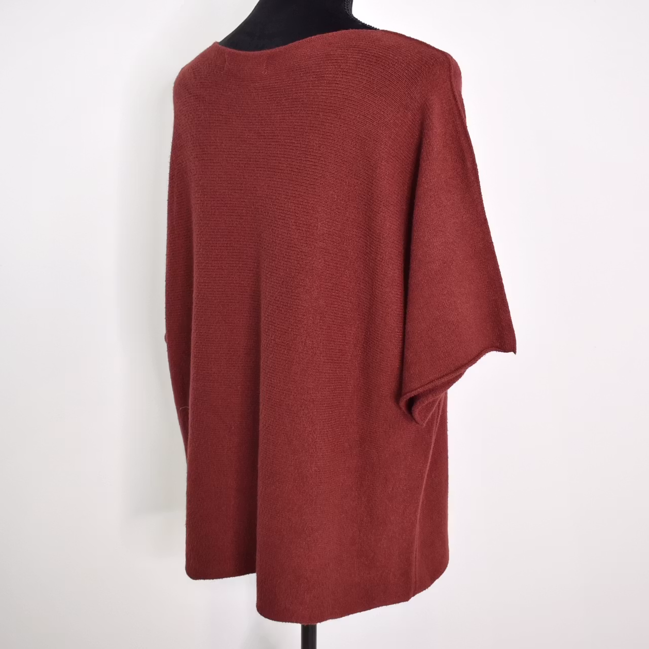 Det här är en härlig finstickad ponchotröja i mjukt och skönt material. Ponchotröjan är kort och vid och har kort ärm. Halsen är tjusigt rundad. Materialet är mjukt och följsamt. Avslappnad passform. Då vi alla är olika formade rekommenderar vi att man tar hjälp av måtten nedan för att bedöma om plagget kan passa. One Size - passar uppskattningsvis upp till L/XL. Modellen har en bröstvidd på cirka 88cm och är 163cm lång.