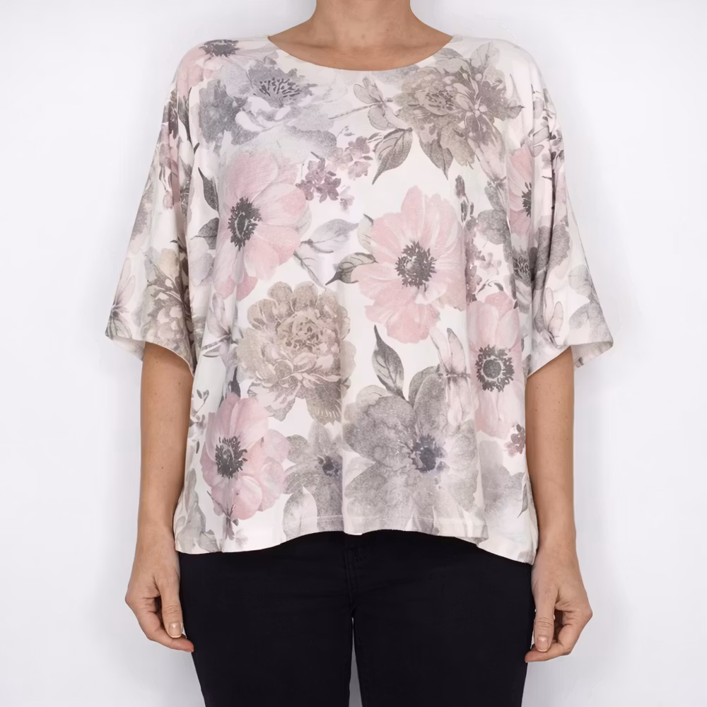 Det här är en vacker finstickad ponchotröja i mjukt material och blommigt mönster. Ponchotröjan är kort och vid samt har en kort ärm. Halsen är tjusigt rundad.. Då vi alla är olika formade rekommenderar vi att man tar hjälp av måtten nedan för att bedöma om plagget kan passa. Rymlig One Size - passar uppskattningsvis upp till storlek 42. Modellen har en bröstvidd på cirka 88cm och är 163cm lång.
