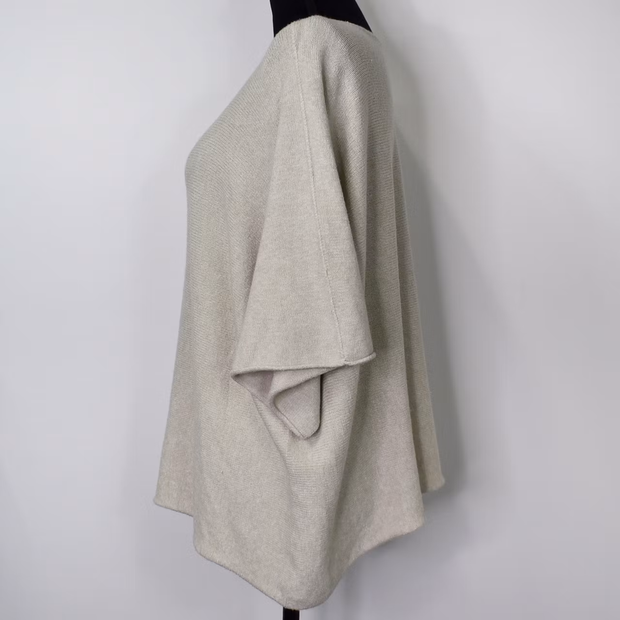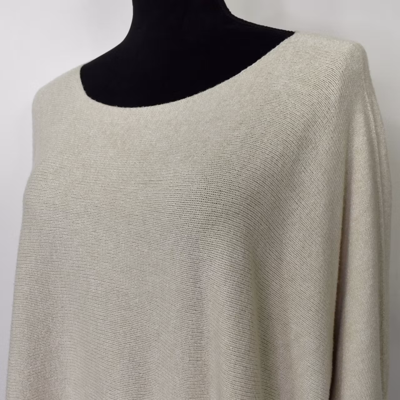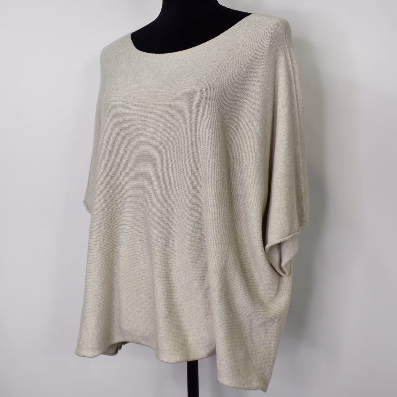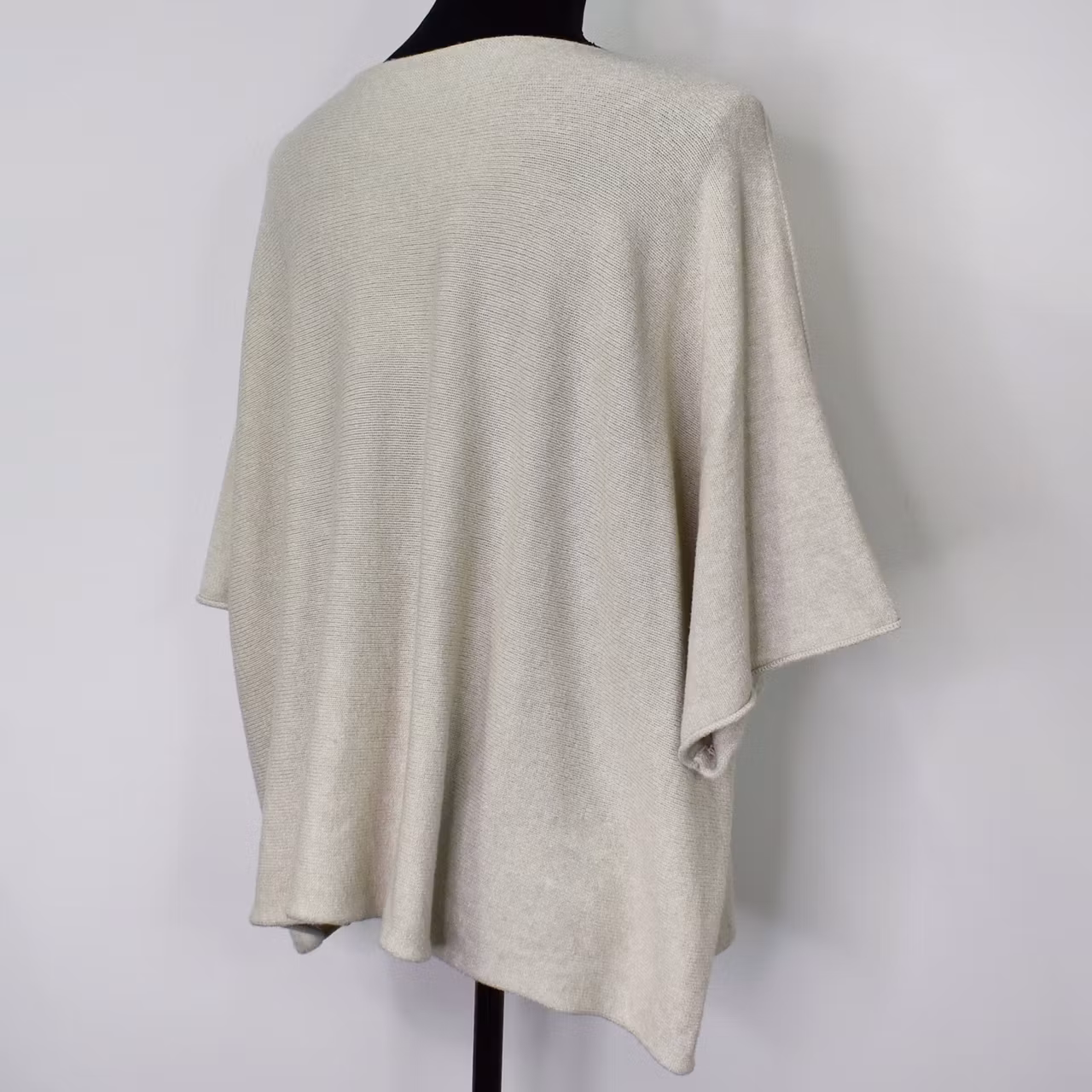 Det här är en härlig finstickad ponchotröja i supermjukt och skönt material. Ponchotröjan är kort och vid och har kort ärm. Halsen är tjusigt rundad. Materialet är mjukt och följsamt. Rymlig passform. Observera att färgen är svår att fånga rättvist på bild och den kan upplevas som varmare på bilderna än vad den är i verkligheten. Färgen är melerad och mörkare partier förekommer. Rymlig One Size - passar uppskattningsvis upp till XL. Då vi alla är olika formade rekommenderar vi att man tar hjälp av måtten nedan för att bedöma om plagget kan passa. Modellen har en bröstvidd på cirka 88cm och är 163cm lång.