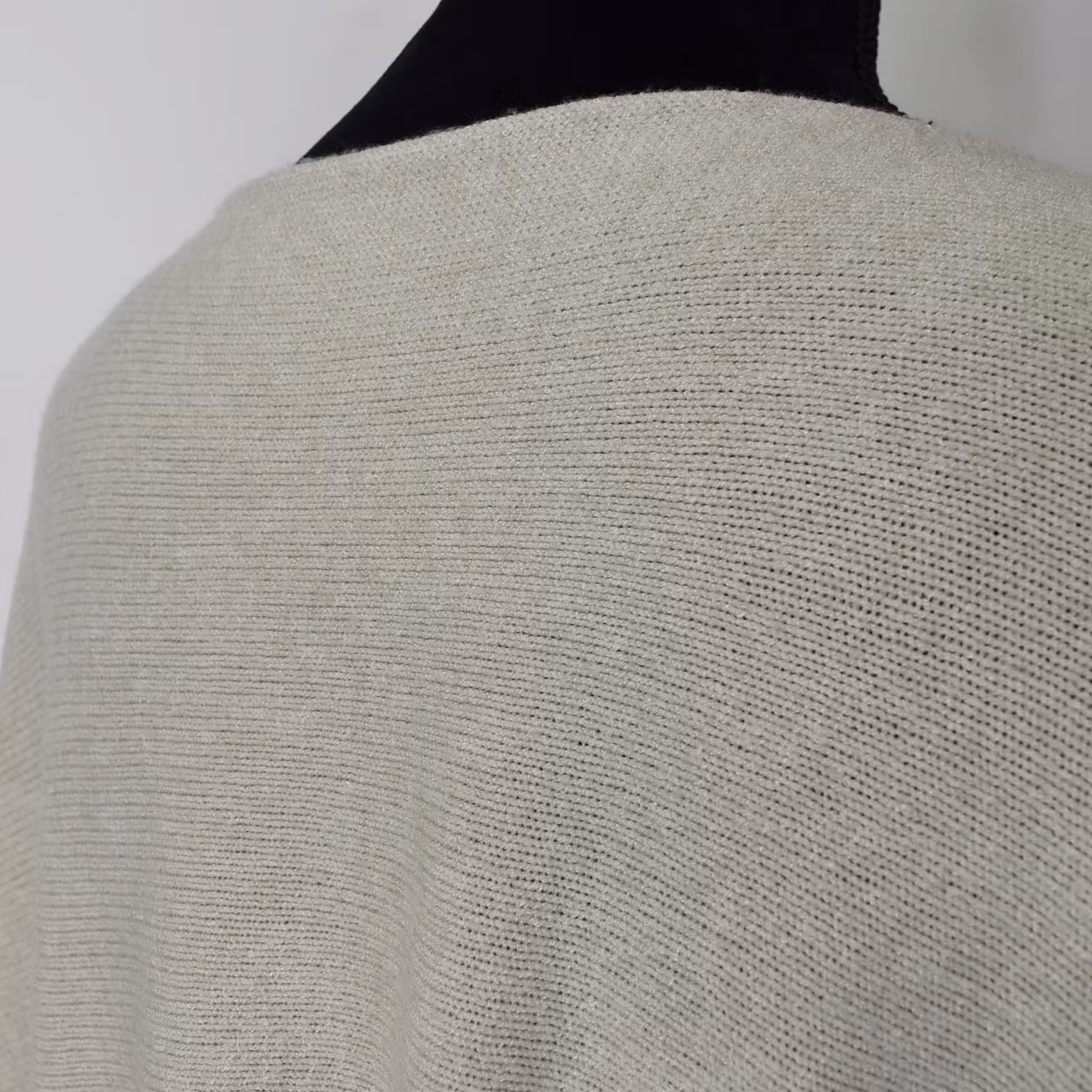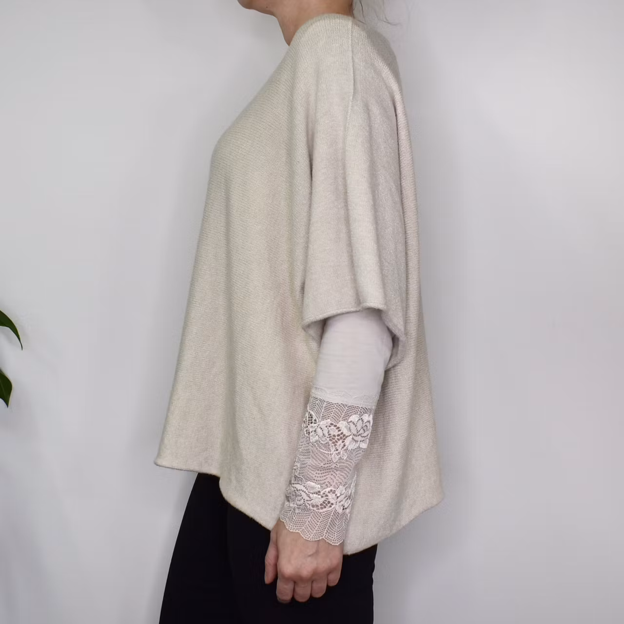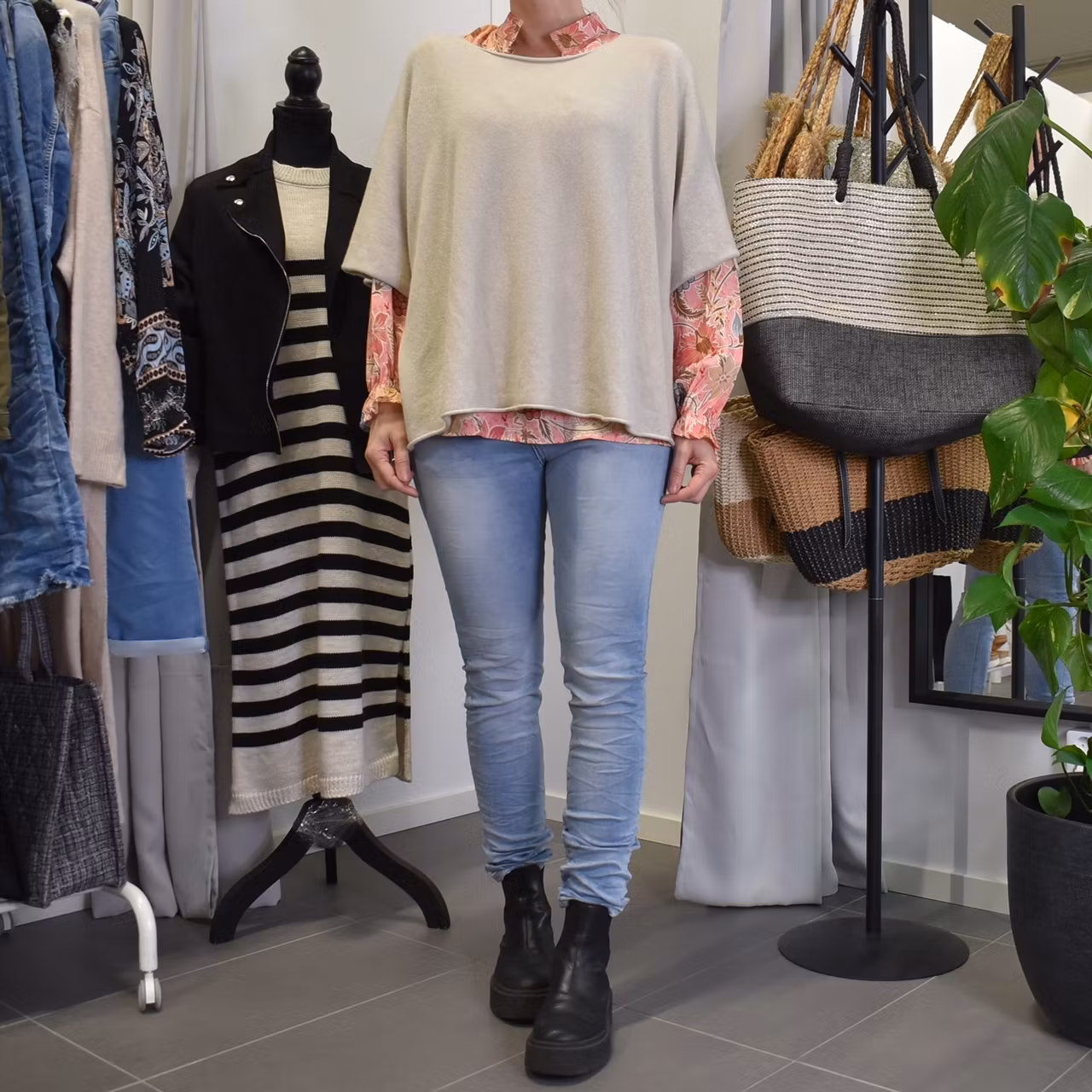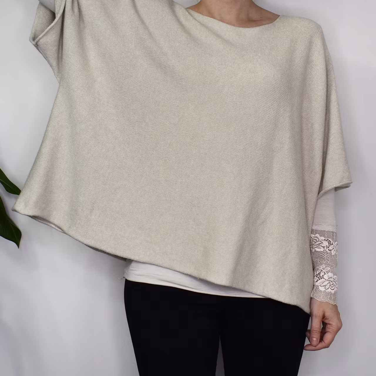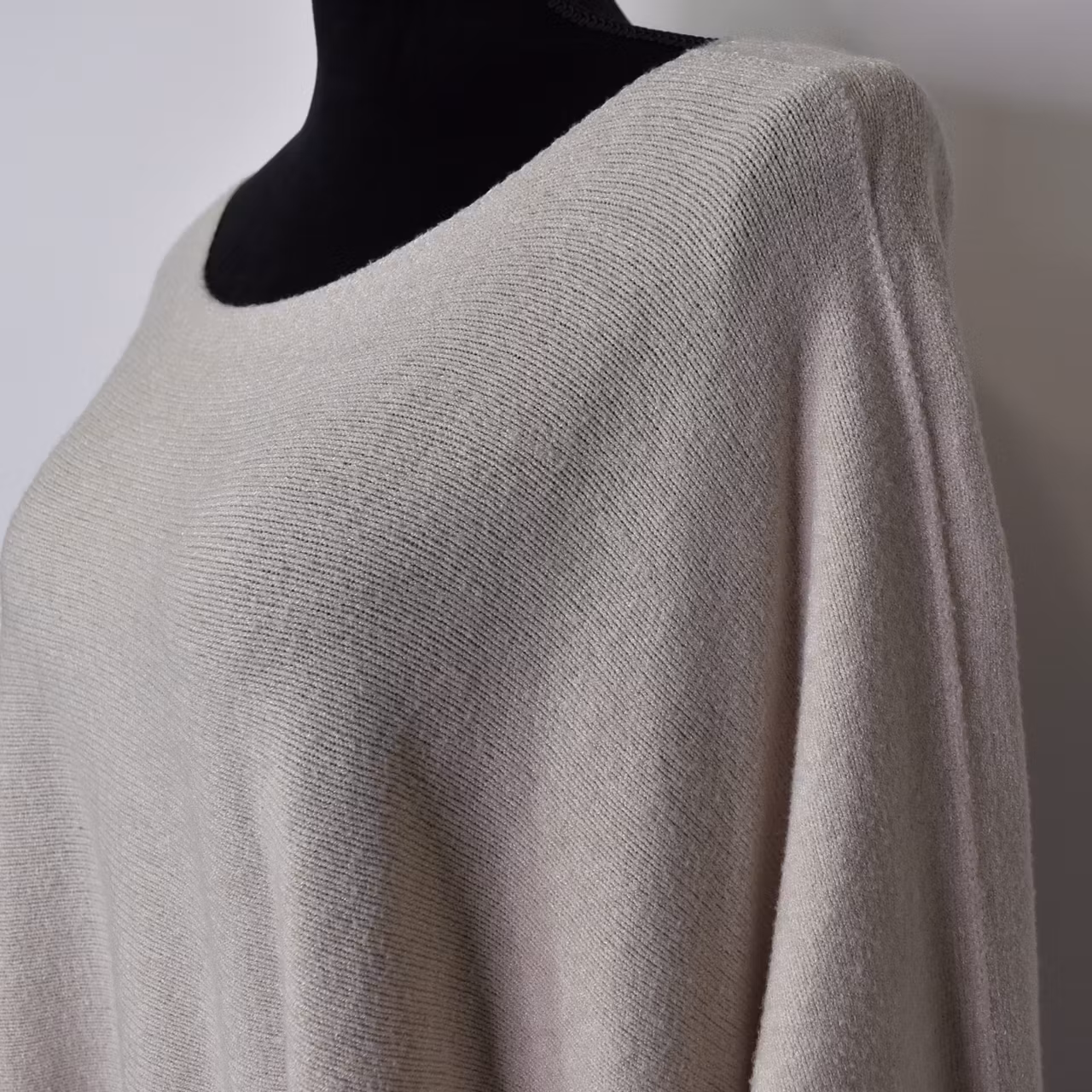Det här är en härlig finstickad ponchotröja i supermjukt och skönt material. Ponchotröjan är kort och vid och har kort ärm. Halsen är tjusigt rundad. Materialet är mjukt och följsamt. Rymlig passform. Observera att färgen är svår att fånga rättvist på bild och den kan upplevas som varmare på bilderna än vad den är i verkligheten. Färgen är melerad och mörkare partier förekommer. Rymlig One Size - passar uppskattningsvis upp till XL. Då vi alla är olika formade rekommenderar vi att man tar hjälp av måtten nedan för att bedöma om plagget kan passa. Modellen har en bröstvidd på cirka 88cm och är 163cm lång.