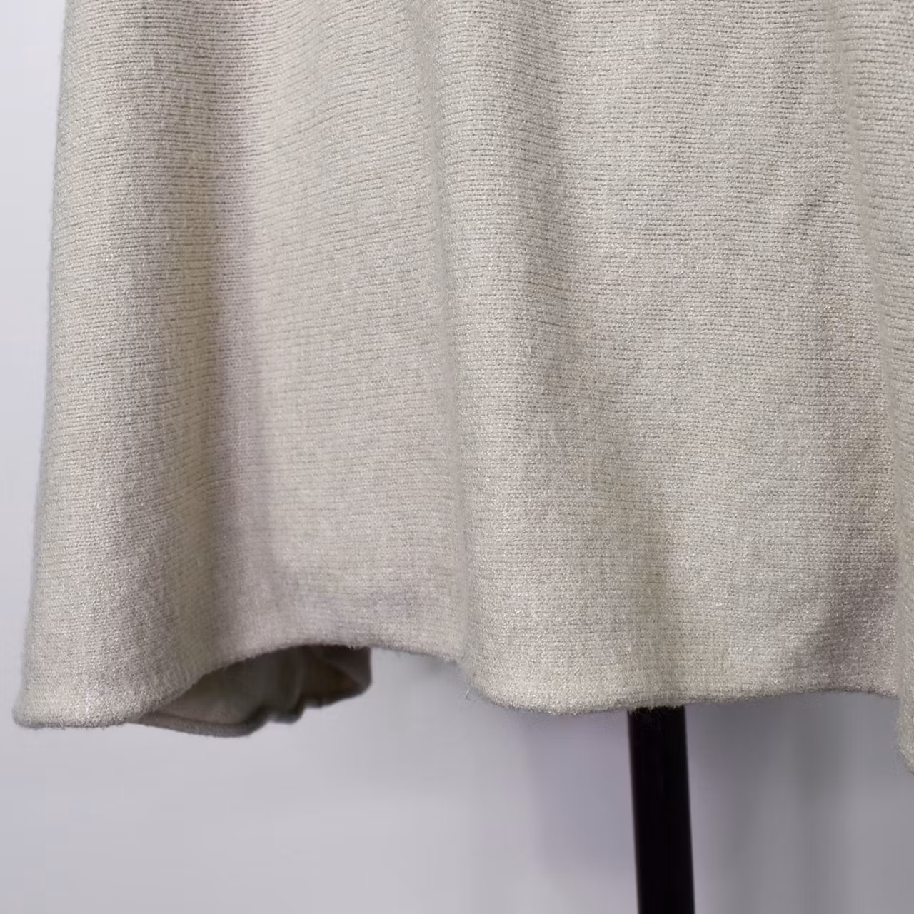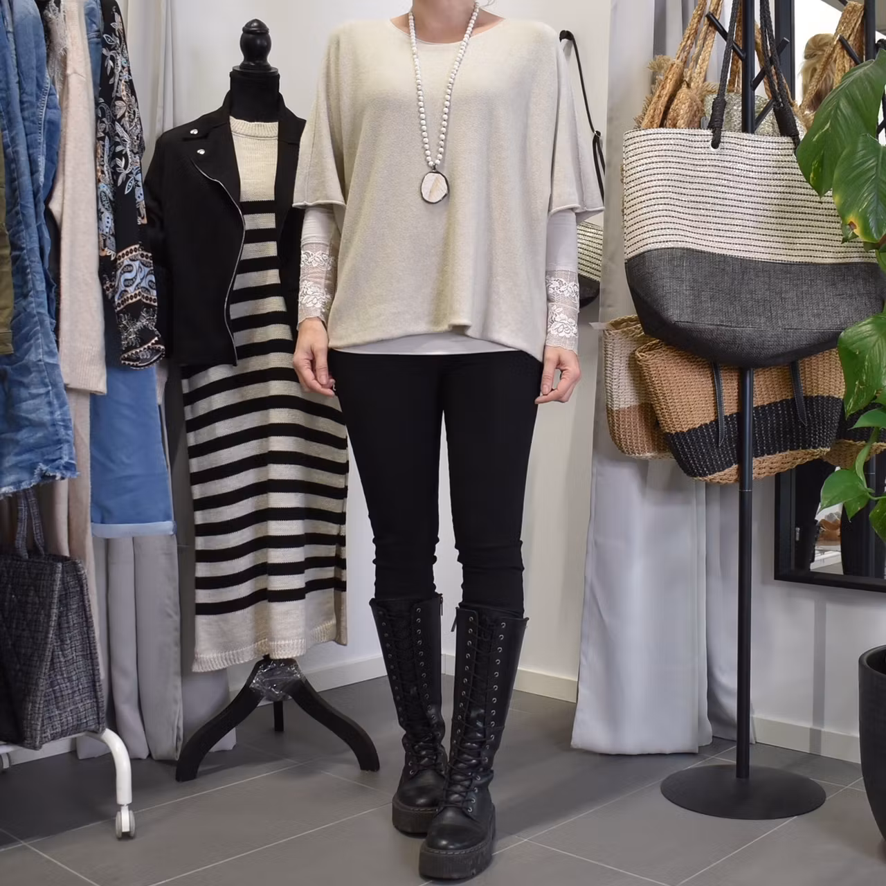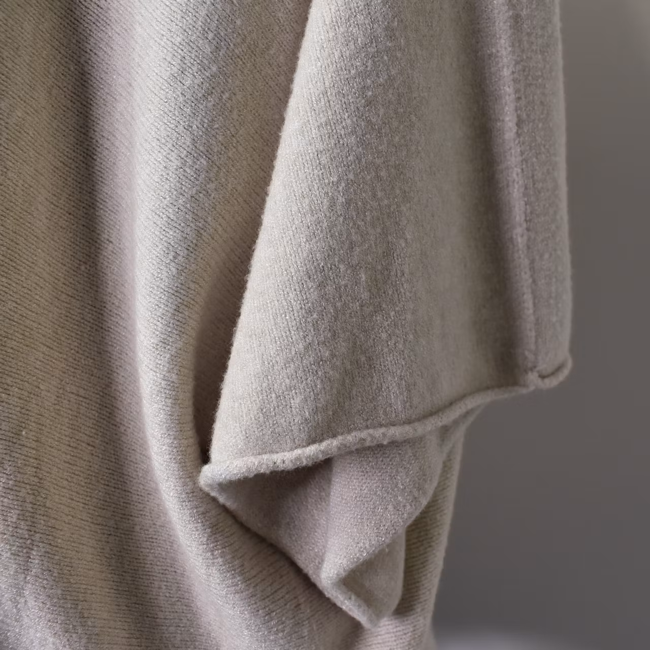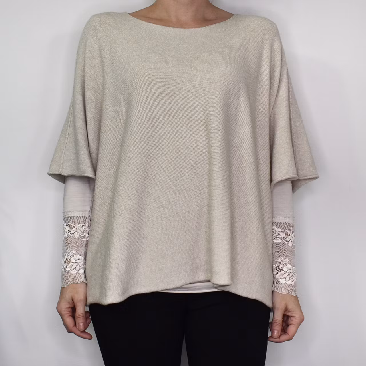 Det här är en härlig finstickad ponchotröja i supermjukt och skönt material. Ponchotröjan är kort och vid och har kort ärm. Halsen är tjusigt rundad. Materialet är mjukt och följsamt. Rymlig passform. Observera att färgen är svår att fånga rättvist på bild och den kan upplevas som varmare på bilderna än vad den är i verkligheten. Färgen är melerad och mörkare partier förekommer. Rymlig One Size - passar uppskattningsvis upp till XL. Då vi alla är olika formade rekommenderar vi att man tar hjälp av måtten nedan för att bedöma om plagget kan passa. Modellen har en bröstvidd på cirka 88cm och är 163cm lång.