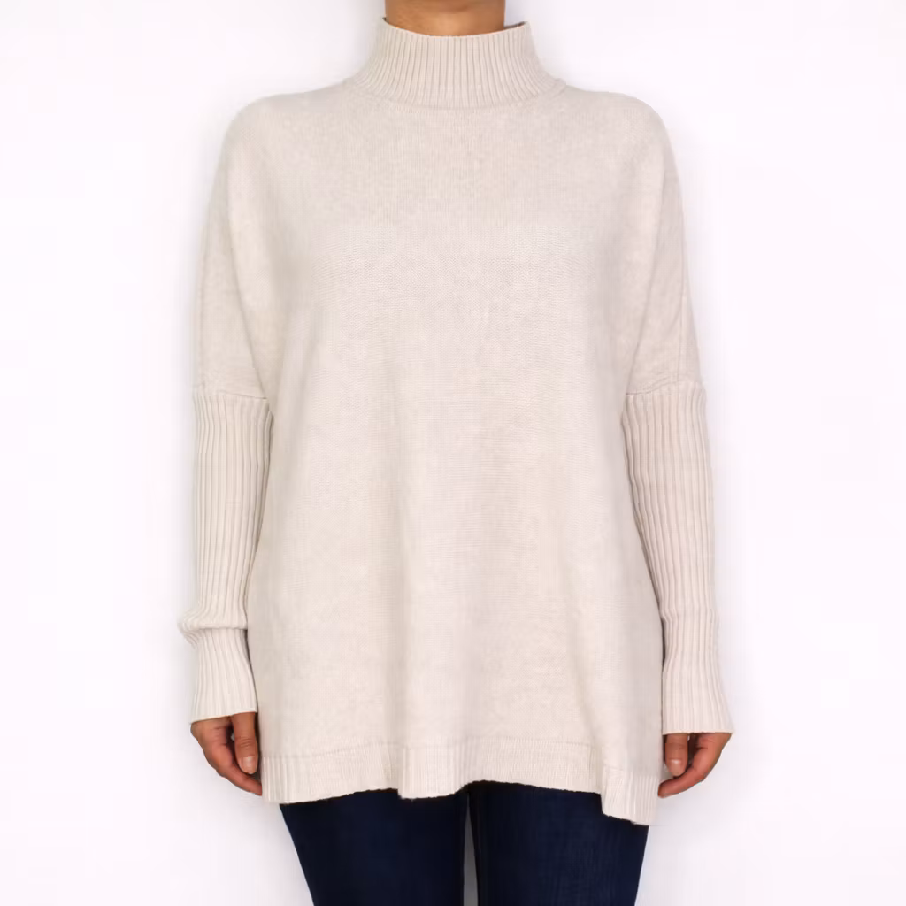 Det här är en underbar finstickad tröja med snygg ribbad ståkrage och rymlig passform. Axeln är kraftigt nerhasad och ärmen är tajt med ribbstickat mönster, vilket även finns nertill på tröjan. Materialet är supermjukt och stretchigt. Rymlig One Size - passar uppskattningsvis upp till XL (42). Då vi alla är olika formade rekommenderar vi att man tar hjälp av måtten nedan för att bedöma om plagget kan passa. Modellen har en bröstvidd på cirka 88cm och är 163cm lång.