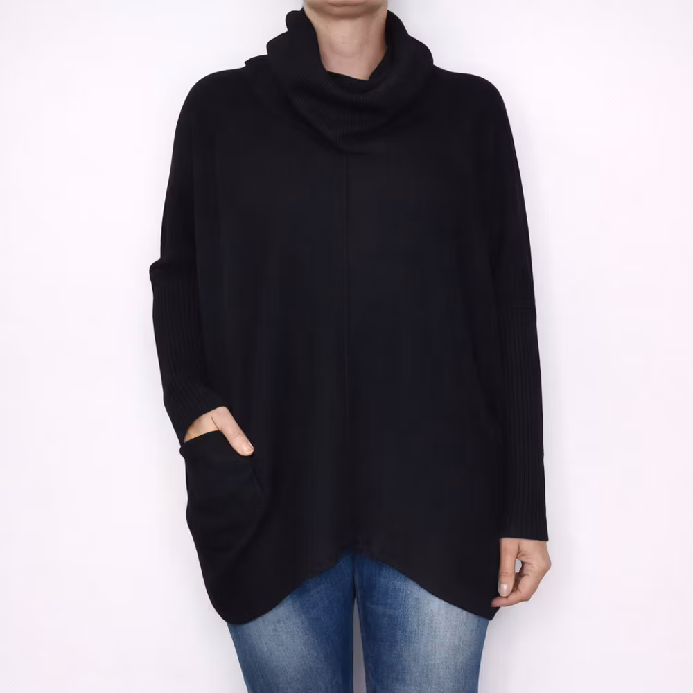 Det här är en härlig finstickad over size-tröja med snygg lös polokrage och två sneda fickor fram. Axeln är kraftigt nerhasad och ärmen är tajt med ribbstickat mönster, liksom på polokragen. Tröjan är längre baktill och det går en dekorativ söm fram. Materialet är mjukt och stretchigt. Rymlig One Size - passar uppskattningsvis upp till XL. Då vi alla är olika formade rekommenderar vi att man tar hjälp av måtten nedan för att bedöma om plagget kan passa. Modellen har en bröstvidd på cirka 88cm och är 163cm lång.