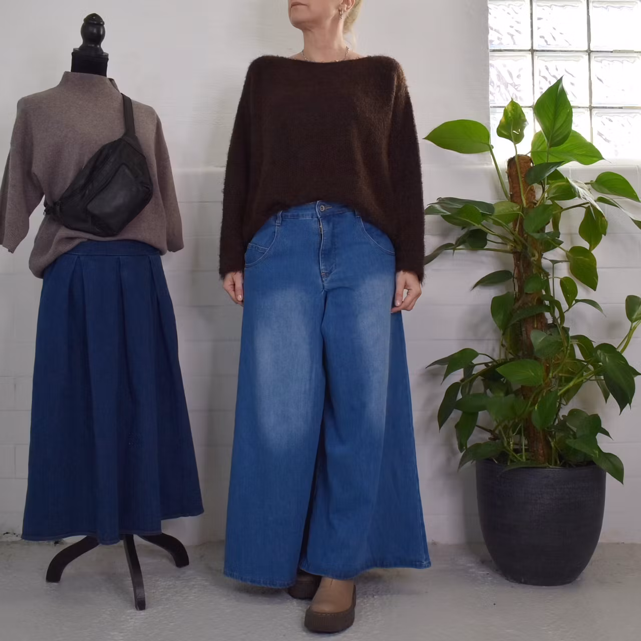 Det här är en underbar stickad tröja med enkel rundad halsringning och ribbstickning nertill, baktill vid halsen samt i ärmslutet. Garnet är supermjukt och luddigt. Tröjan har en lös och avslappnad over sized-passform med rymliga mått. Modellen har en bröstvidd på cirka 88cm, är 163cm lång och bär S/M.