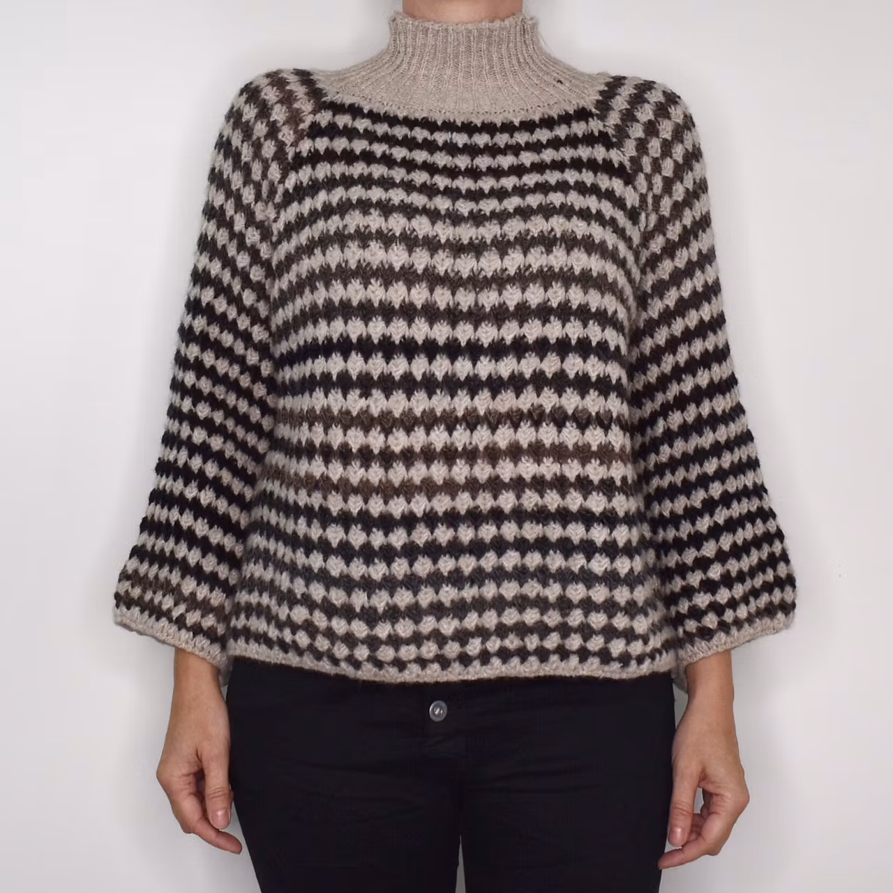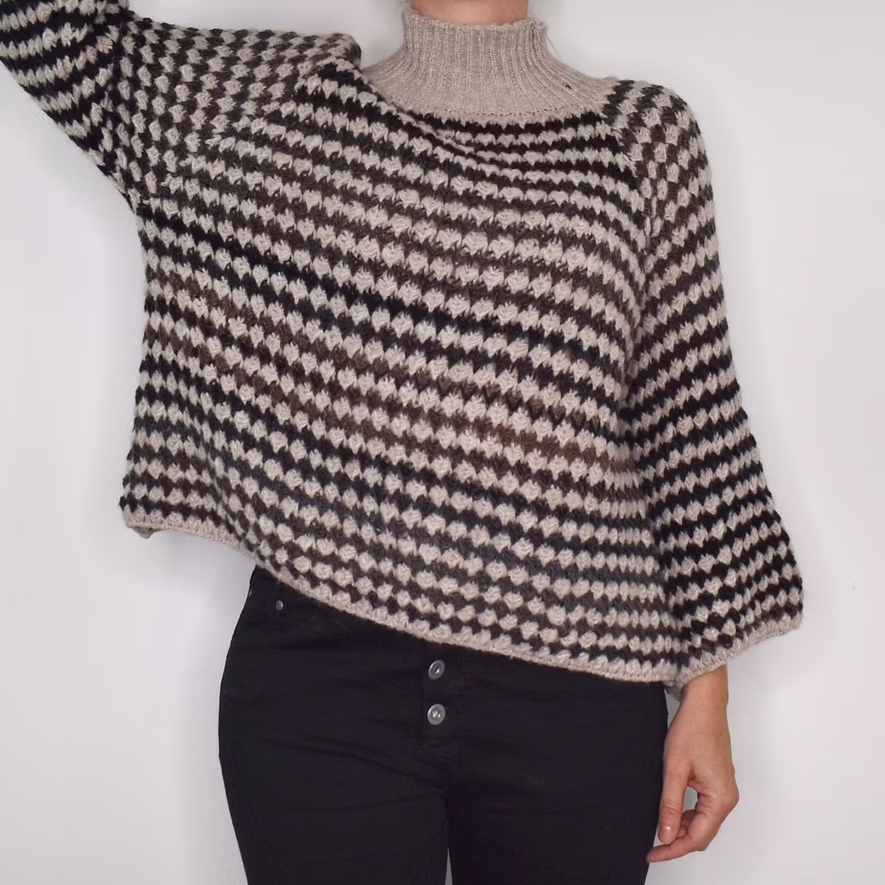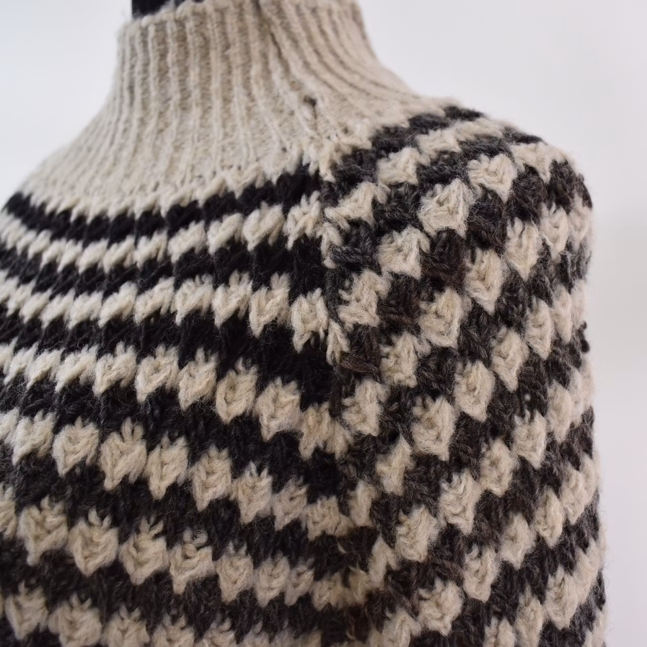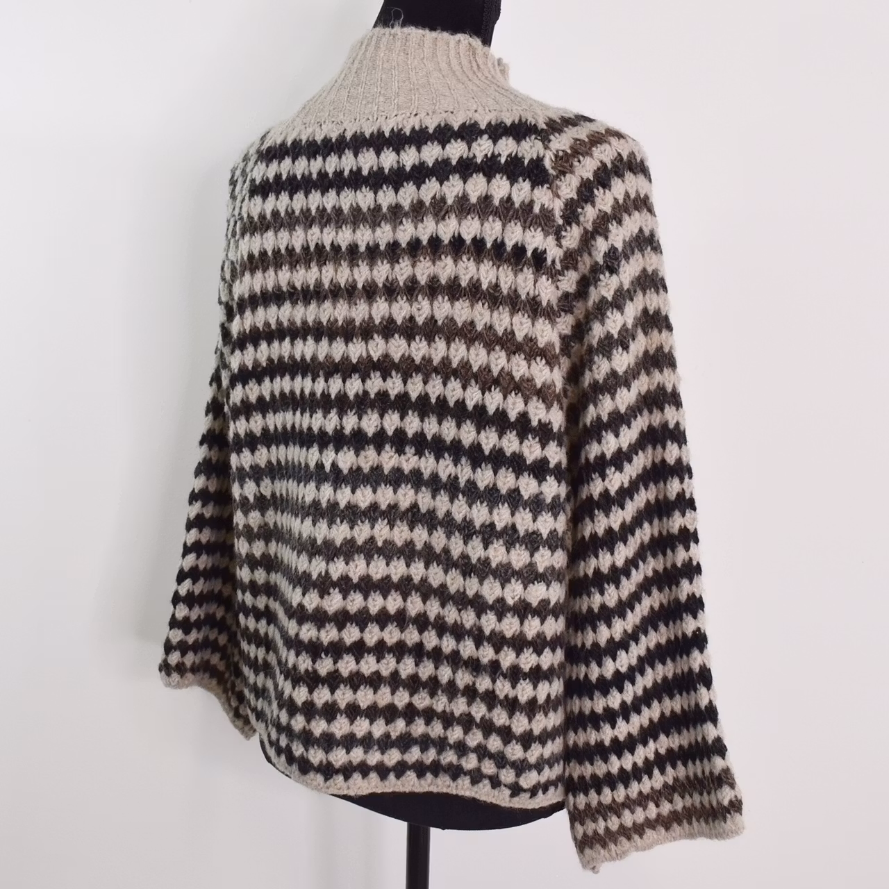 Det här är en underbar mönsterstickad tröja med hög hals och vid, trekvartslång ärm. Tröjan är kort och har en avslappnad passform. One Size - passar uppskattningsvis upp L (40). Då vi alla är olika formade rekommenderar vi att man tar hjälp av måtten nedan för att bedöma om plagget kan passa. Modellen har en bröstvidd på cirka 88cm och är 163cm lång.