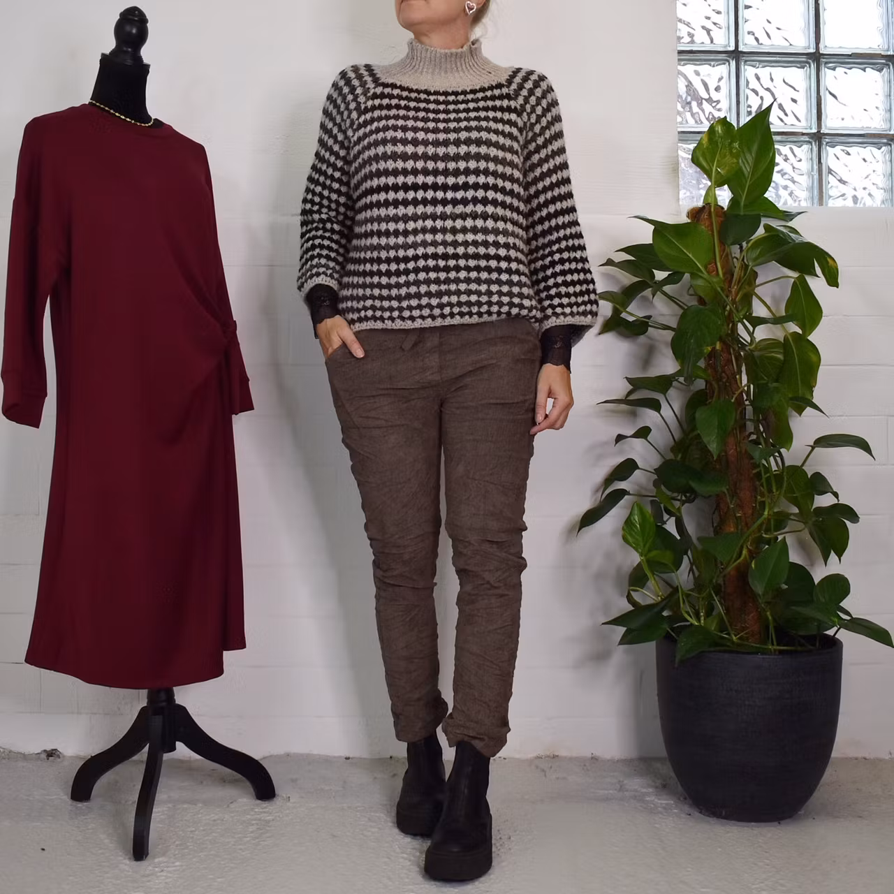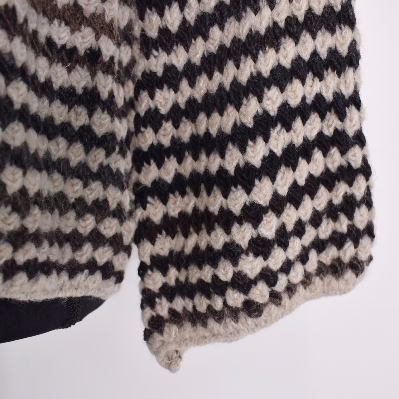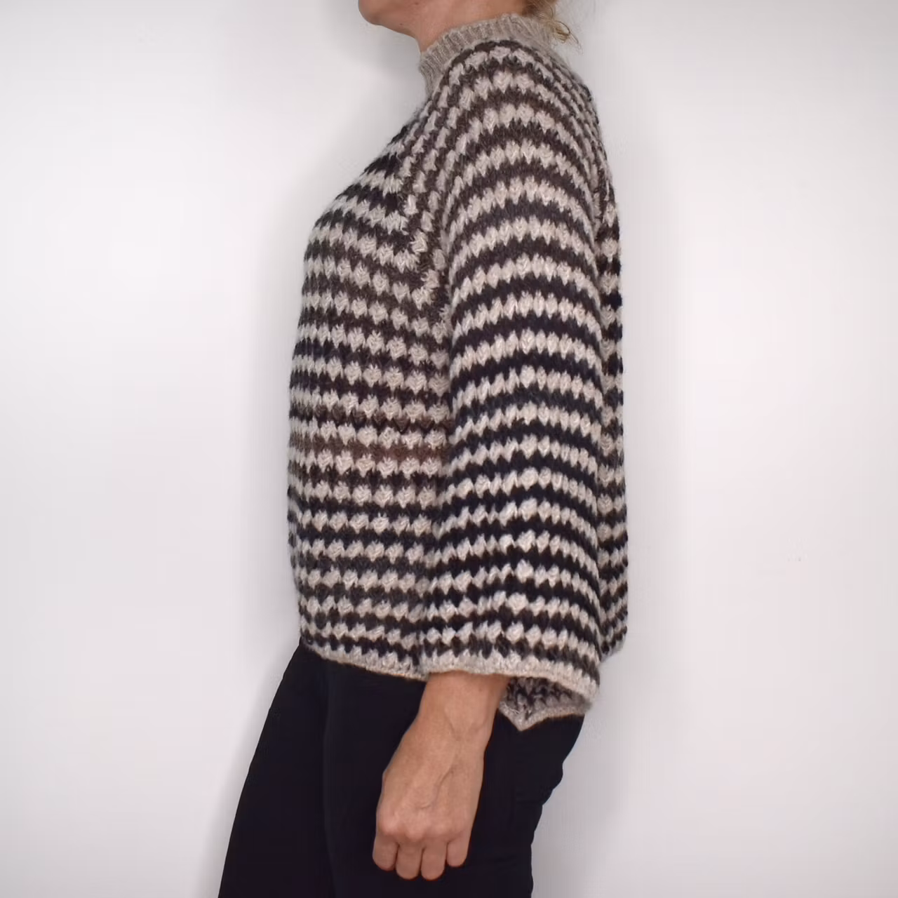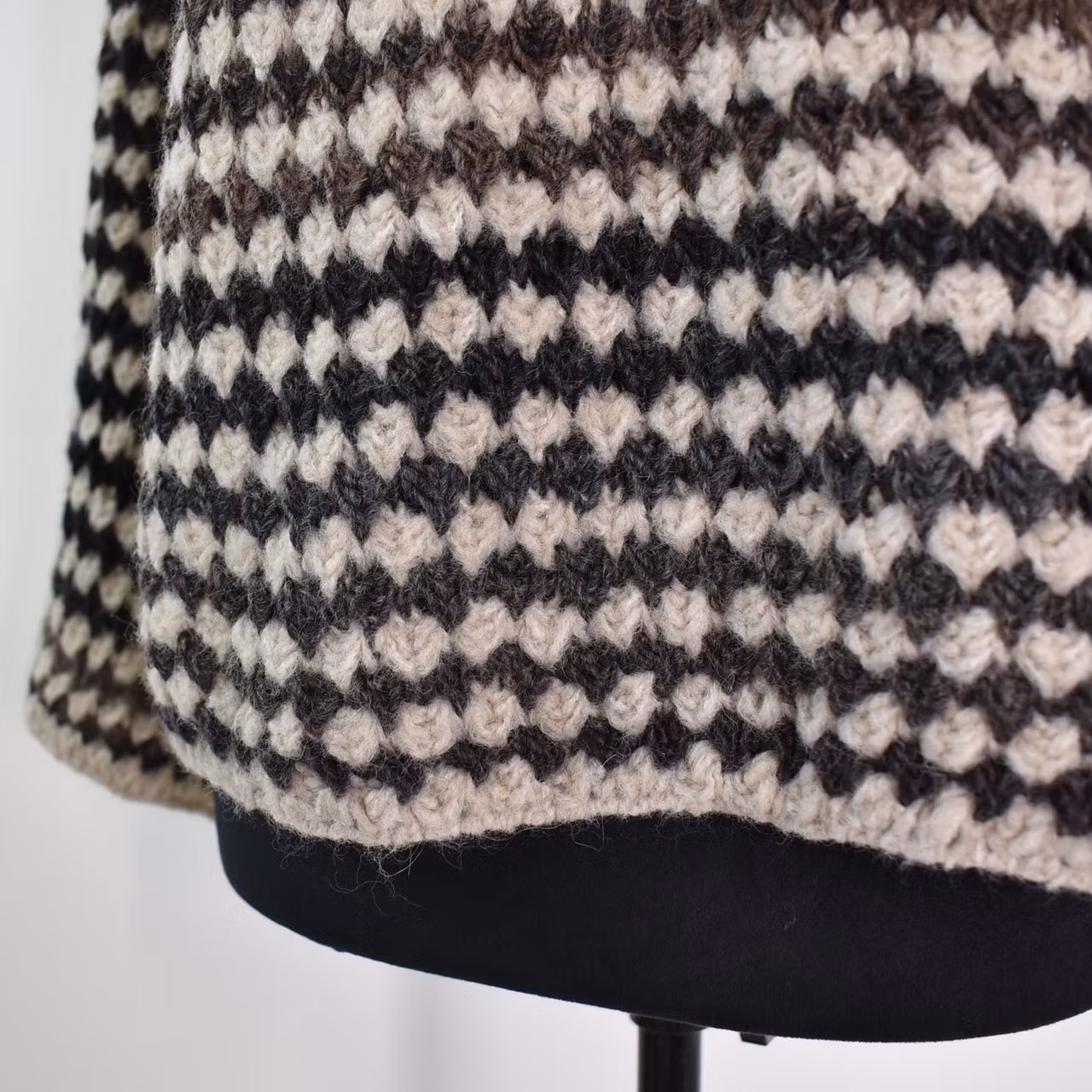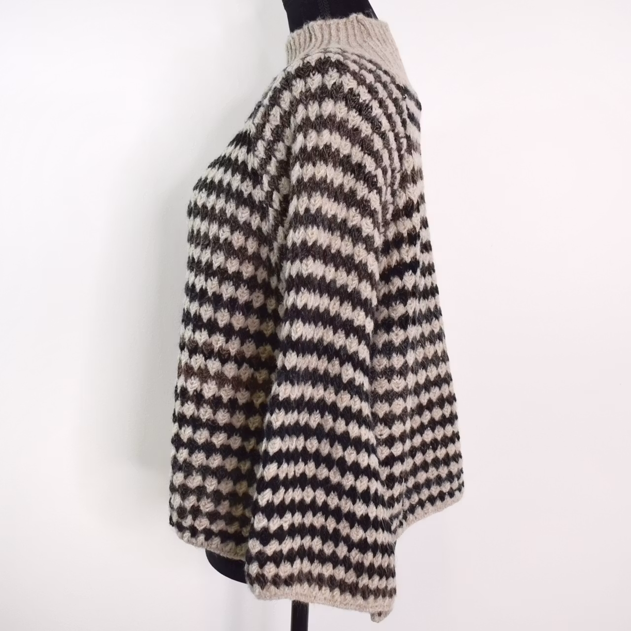 Det här är en underbar mönsterstickad tröja med hög hals och vid, trekvartslång ärm. Tröjan är kort och har en avslappnad passform. One Size - passar uppskattningsvis upp L (40). Då vi alla är olika formade rekommenderar vi att man tar hjälp av måtten nedan för att bedöma om plagget kan passa. Modellen har en bröstvidd på cirka 88cm och är 163cm lång.