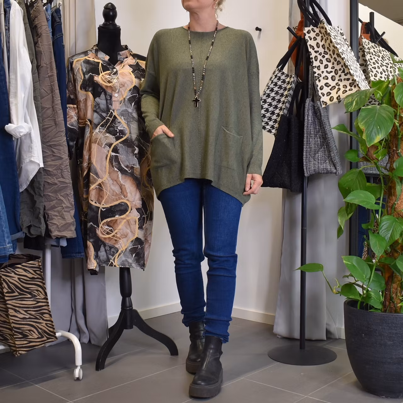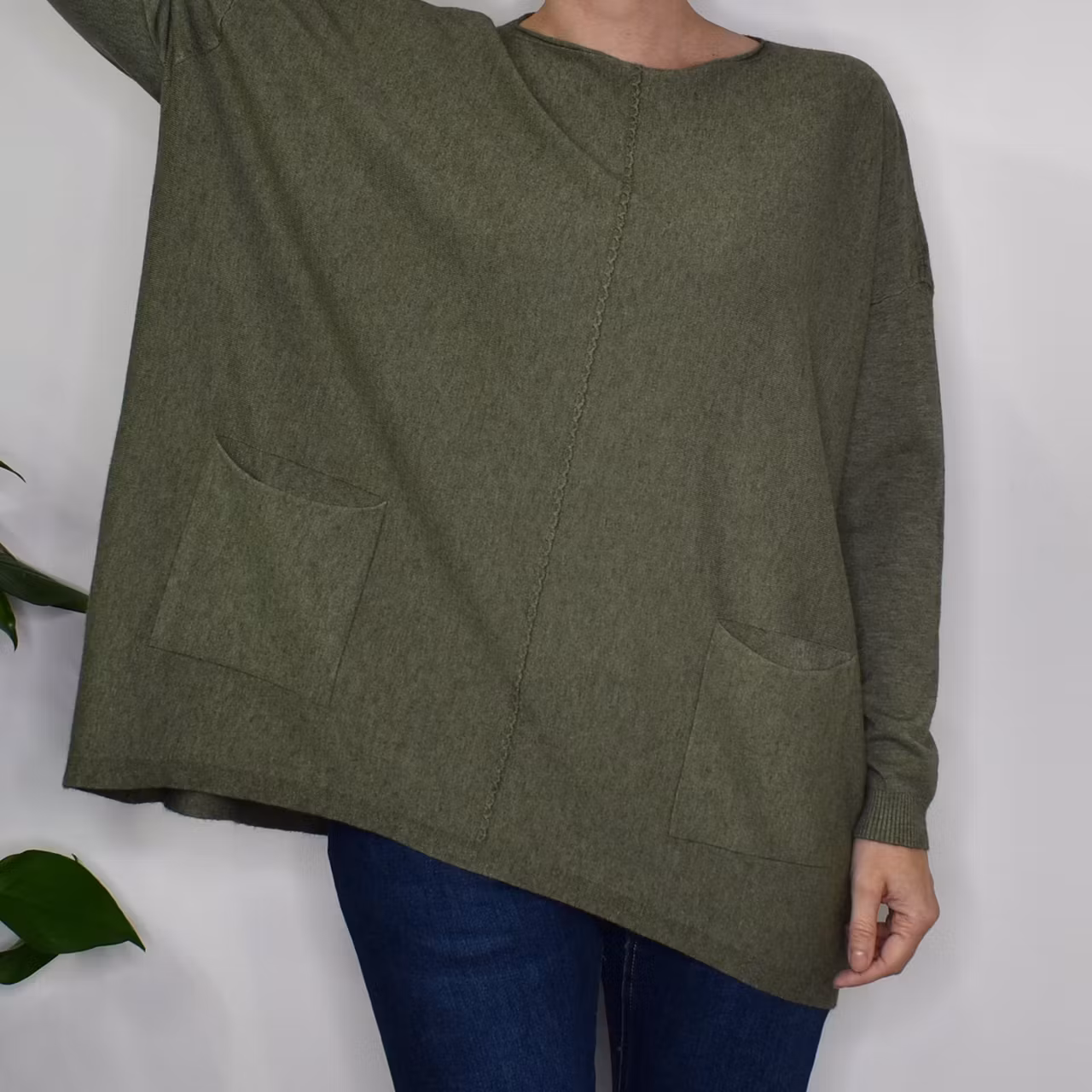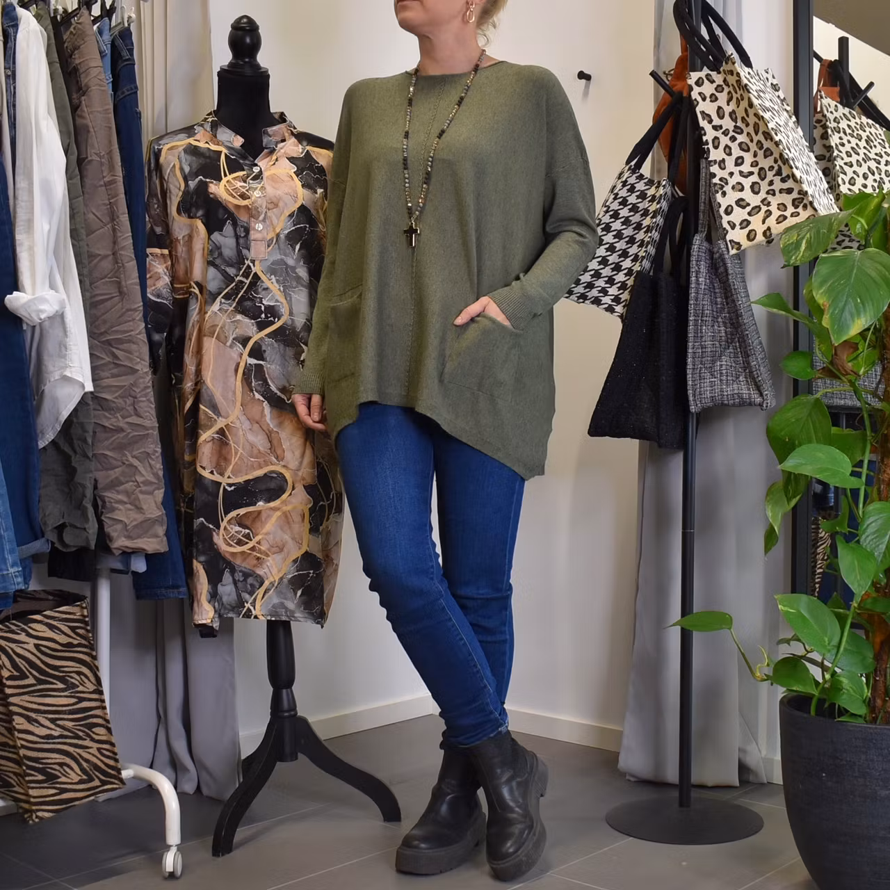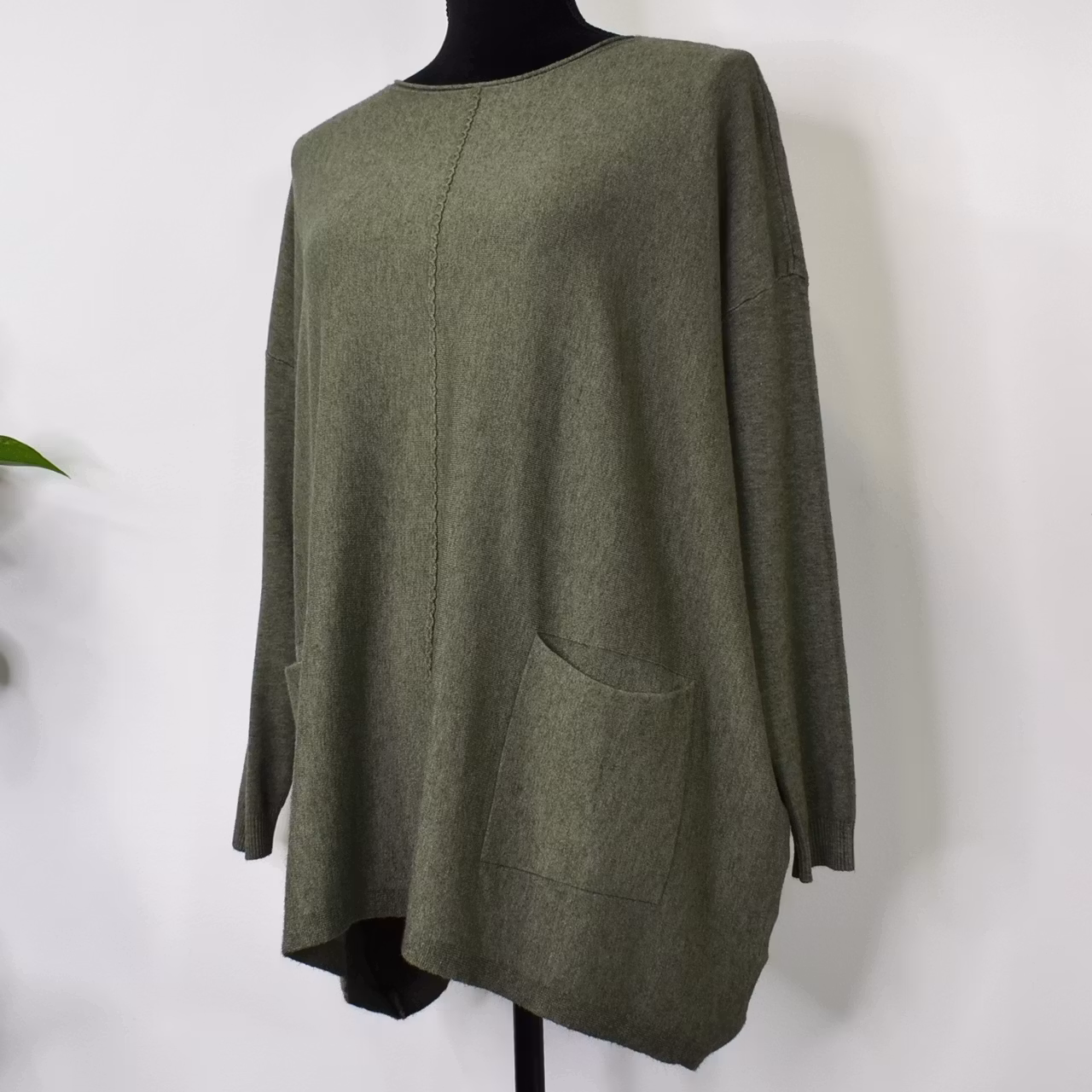 Det här är en härlig finstickad tröja med fickor fram och en fin vågformad söm hela vägen framtill. Ärmslutet är ribbstickat och axeln är nerhasad. Passformen är rymlig och tröjan är något vidare nertill. Tyget är ganska tunt och väldigt mjukt. Då vi alla är olika formade rekommenderar vi att man alltid tar hjälp av måtten längre ner i beskrivningen för att bedöma om plagget kan passa. Rymlig One Size - passar uppskattningsvis upp till XL. Modellen har en bröstvidd på cirka 88cm, och är 163cm lång.