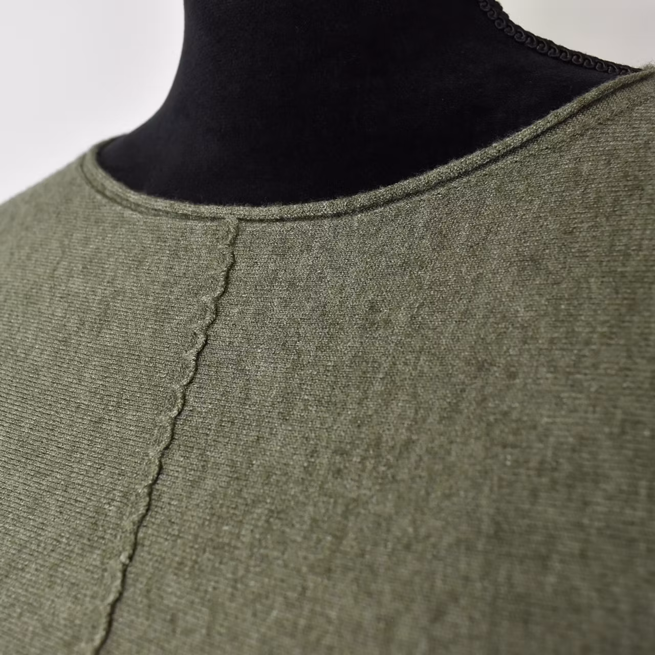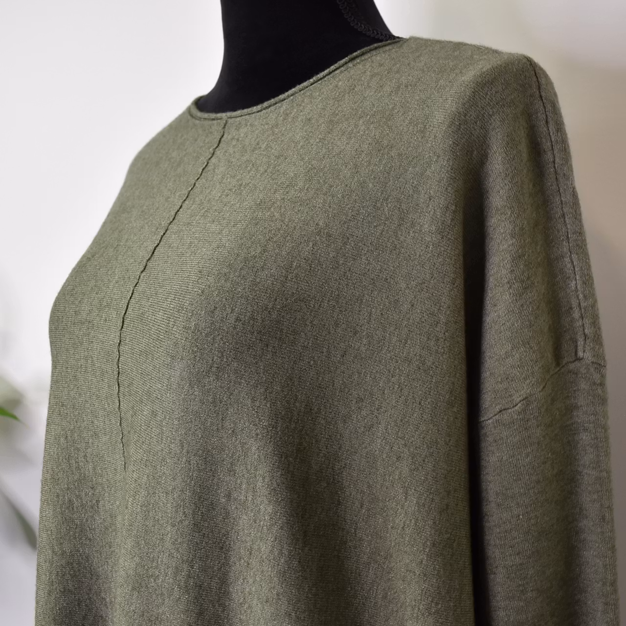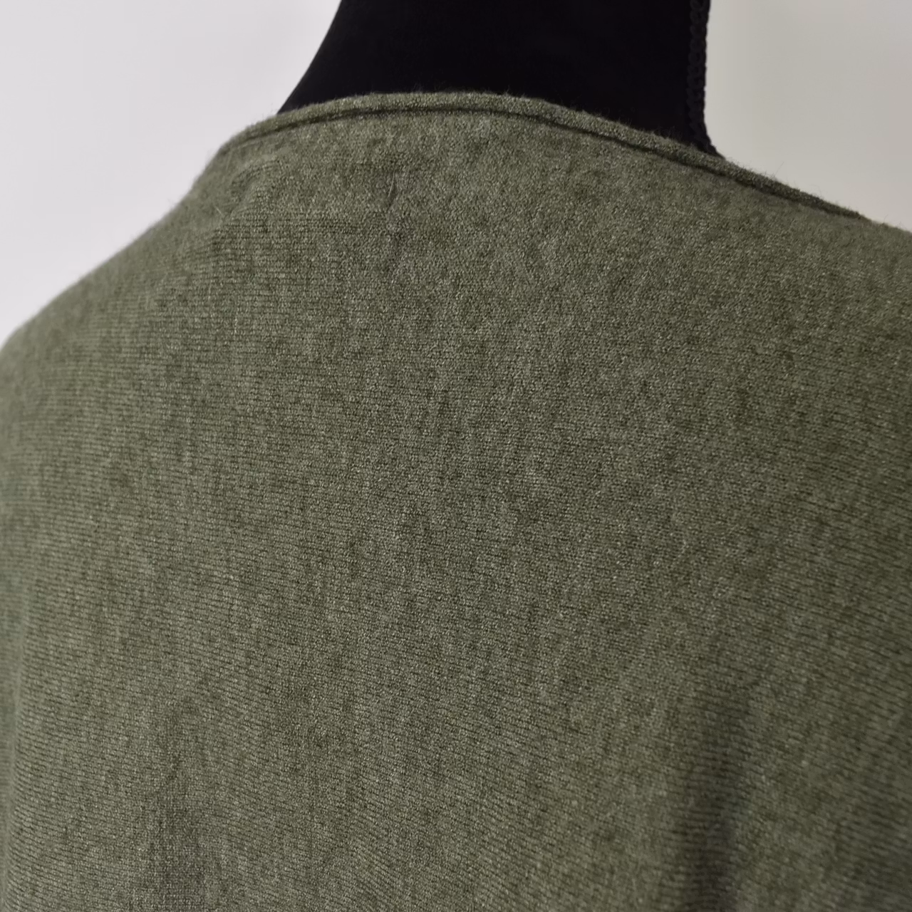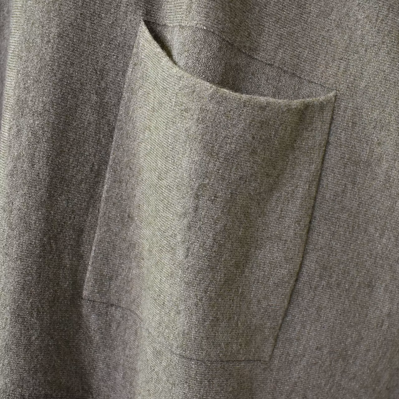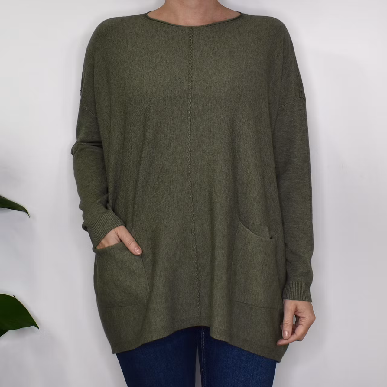 Det här är en härlig finstickad tröja med fickor fram och en fin vågformad söm hela vägen framtill. Ärmslutet är ribbstickat och axeln är nerhasad. Passformen är rymlig och tröjan är något vidare nertill. Tyget är ganska tunt och väldigt mjukt. Då vi alla är olika formade rekommenderar vi att man alltid tar hjälp av måtten längre ner i beskrivningen för att bedöma om plagget kan passa. Rymlig One Size - passar uppskattningsvis upp till XL. Modellen har en bröstvidd på cirka 88cm, och är 163cm lång.