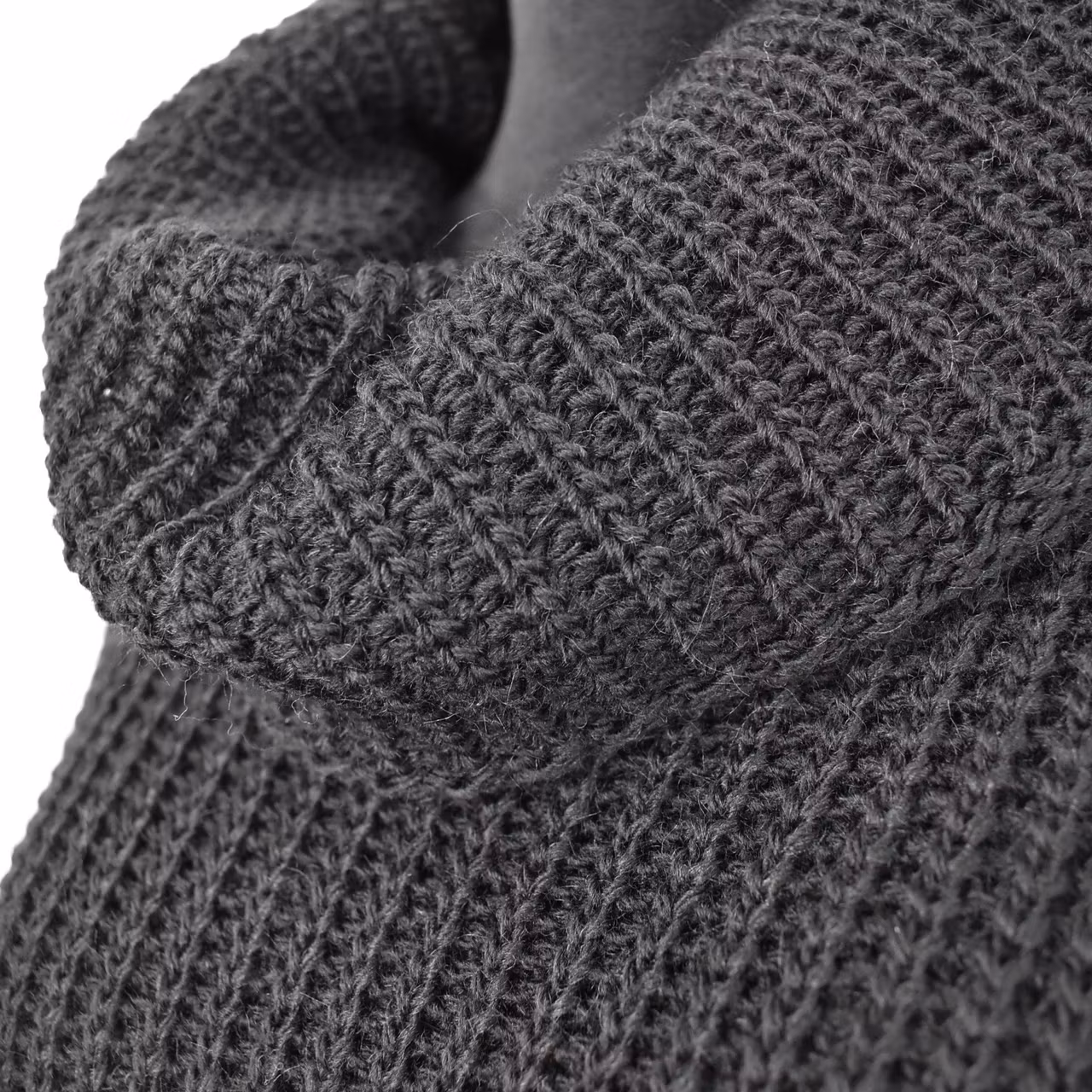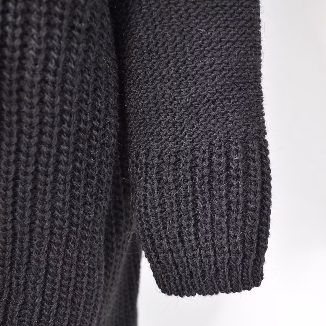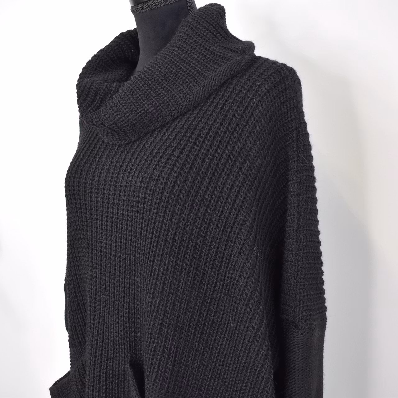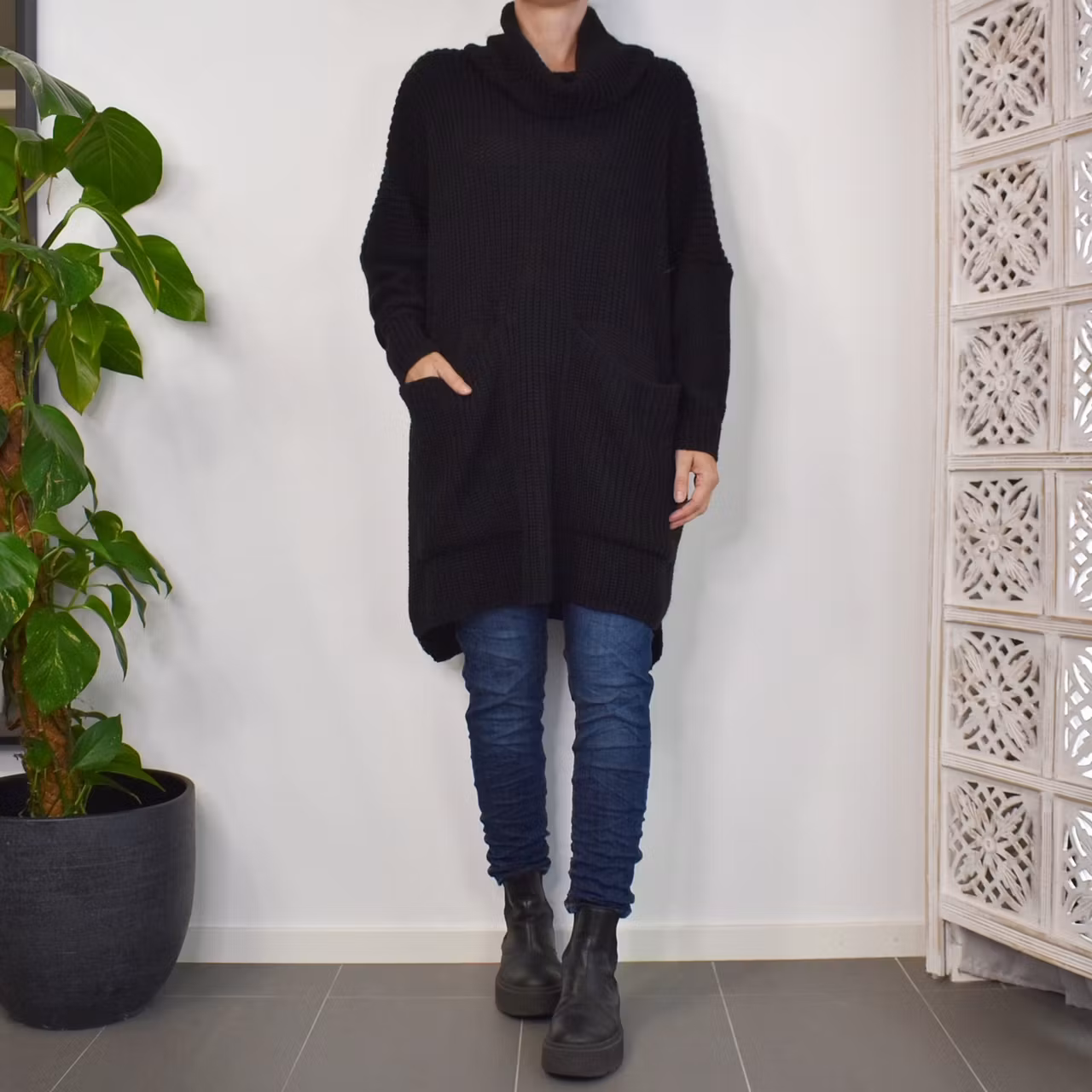 Det här är en underbar stickad tröja med lös polo-krage och stora fickor framtill. Tröjan har kraftigt nerhasad axel och är rymligt over sized i passformen. Baktill är tröjan längre och det finns en liten slits i sidan. Ärmen är kort och en fin detalj är att stickningen mitt på ärmen skiljer sig från resten av tröjan. Observera att fickorna inte kan sitta exakt lika höjdmässigt. Rymlig One Size - passar uppskattningsvis upp till XL. Då vi alla är olika formade rekommenderar vi att man tar hjälp av måtten längre ner i beskrivningen för att bedöma om plagget kan passa. Modellen har en bröstvidd på cirka 88cm och är 163cm lång.