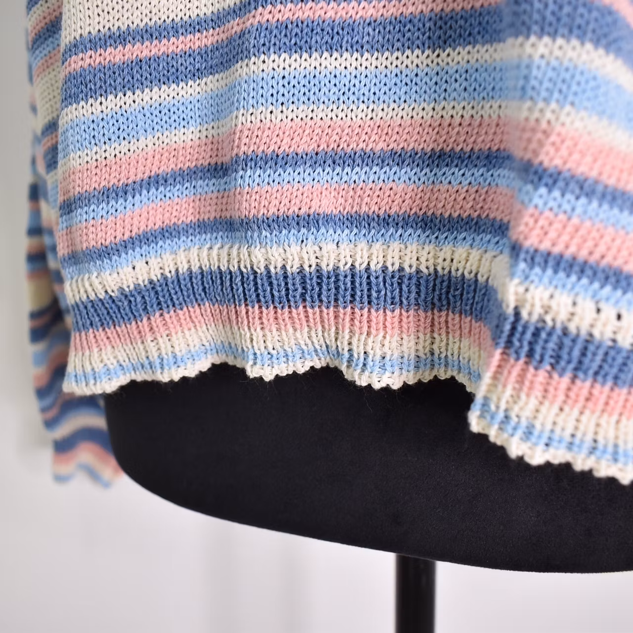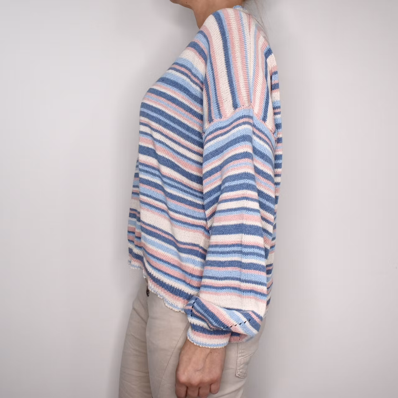 Det här är en fin randig finstickad tröja i fräscha färger. Halsen är rundringad och i ärmslutet är garnet vackert mönsterstickat. Axeln är nerhasad. Materialet innehåller inte stretch men är följsamt. Modellen har en bröstvidd på cirka 88cm, är 163cm lång och bär S/M.