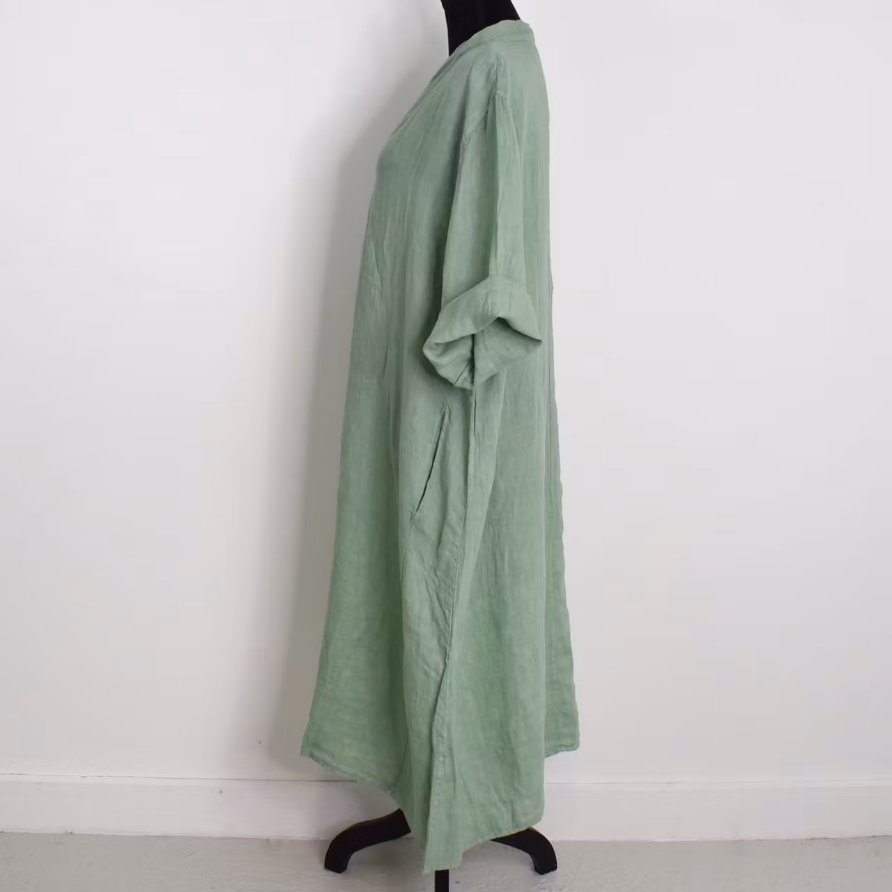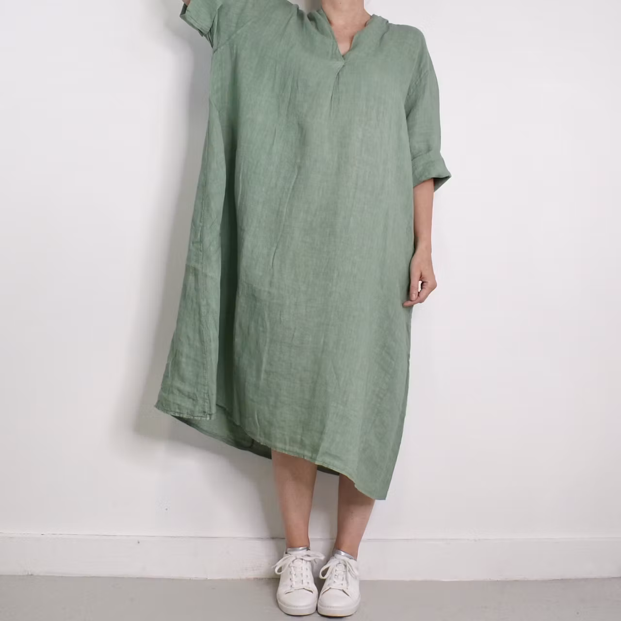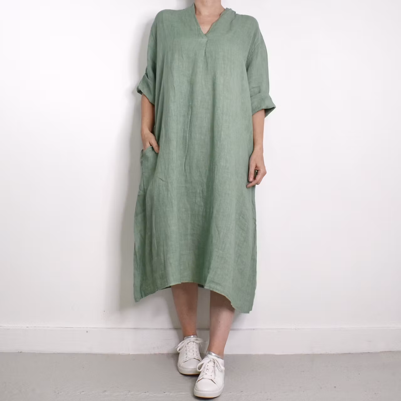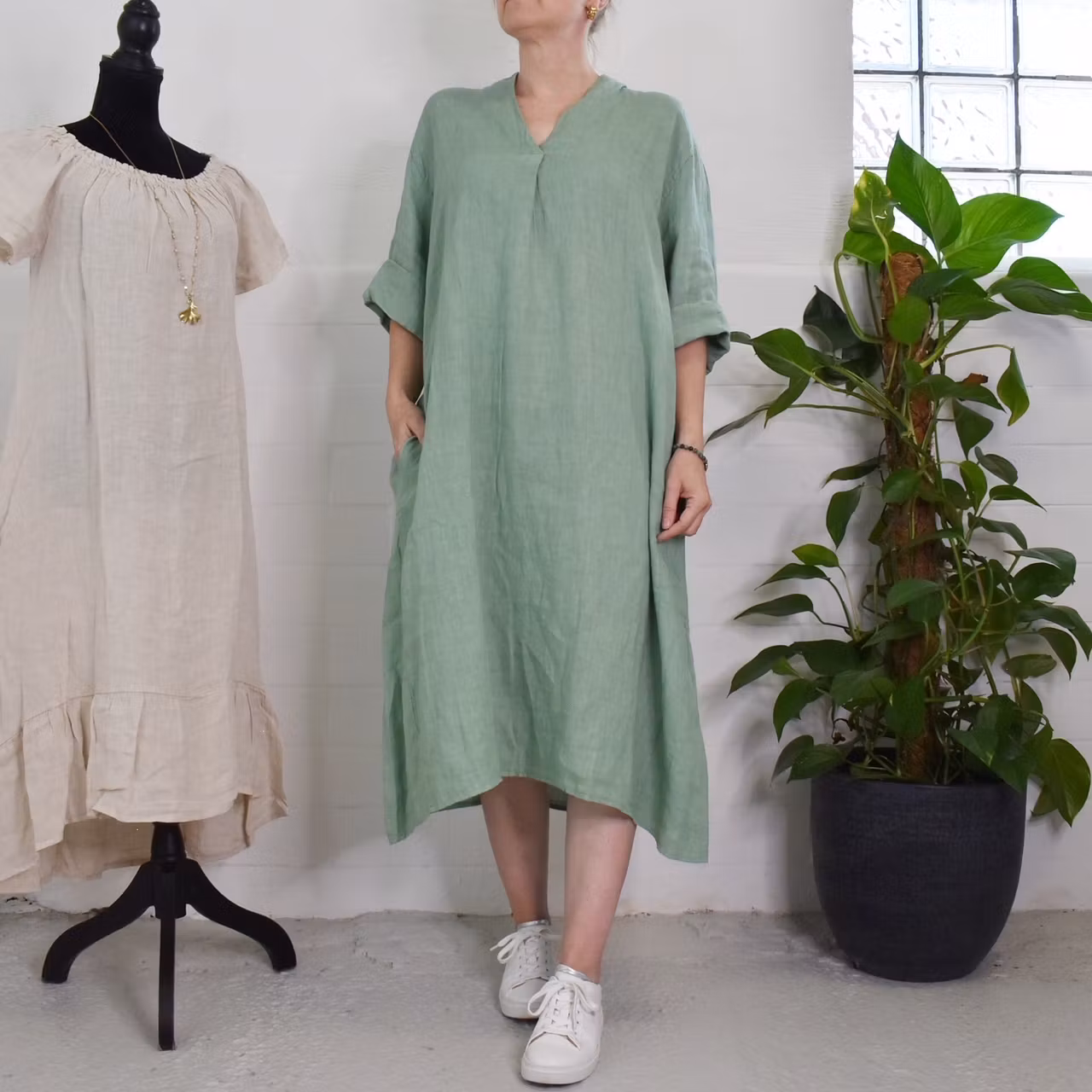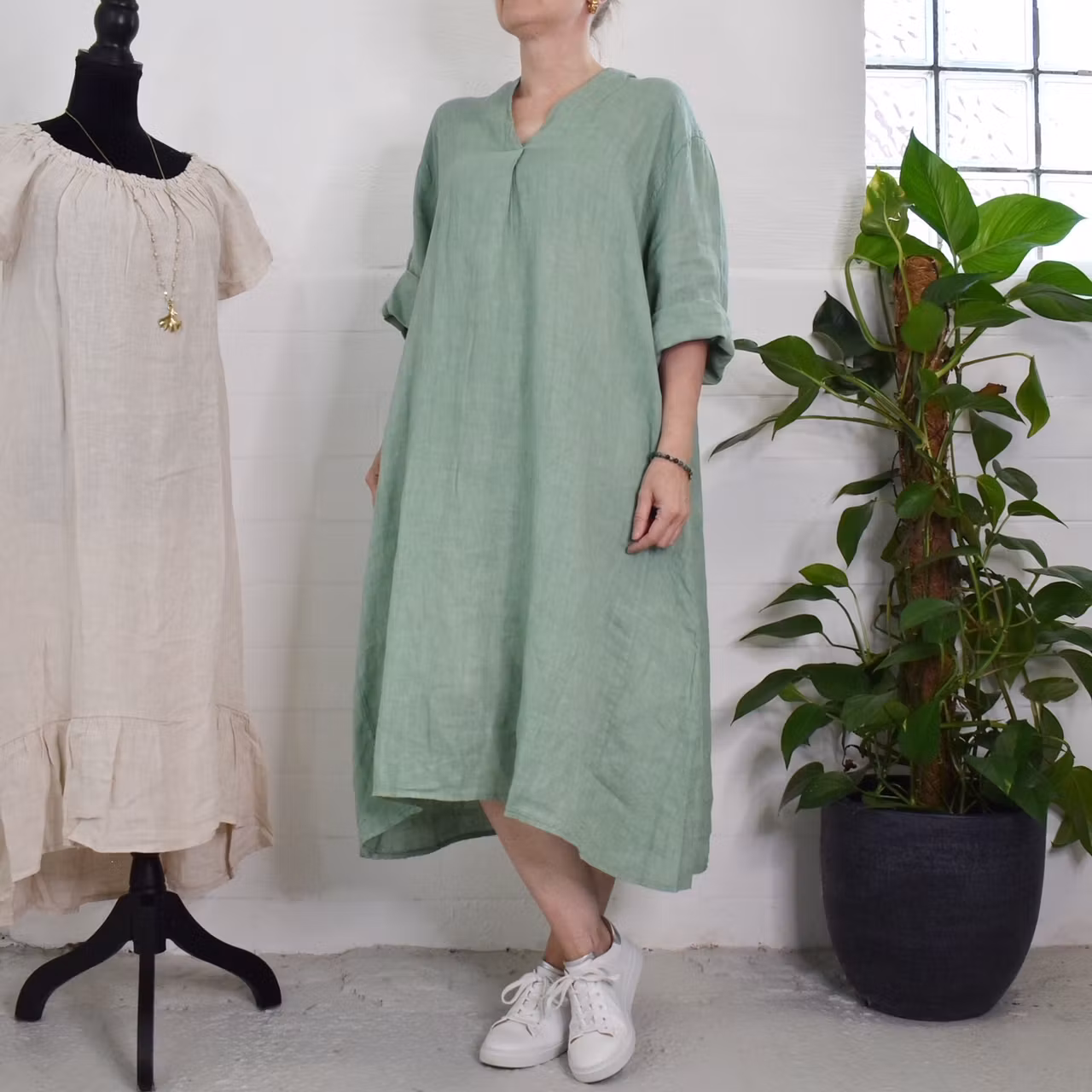 Det här är en snygg rymlig linneklänning med v-ringning och dekorativt sprund fram. Ärmen är trekvartslång och kan vikas upp. I sidorna finns gömda fickor. Observera att materialet inte innehåller stretch och att tyget är tunt. Modellen har en bröstvidd på cirka 88cm och är 163cm lång. Observera att förekomsten av streck, färgskiftningar etc. inte är defekter utan en del av det som gör tyget vackert.