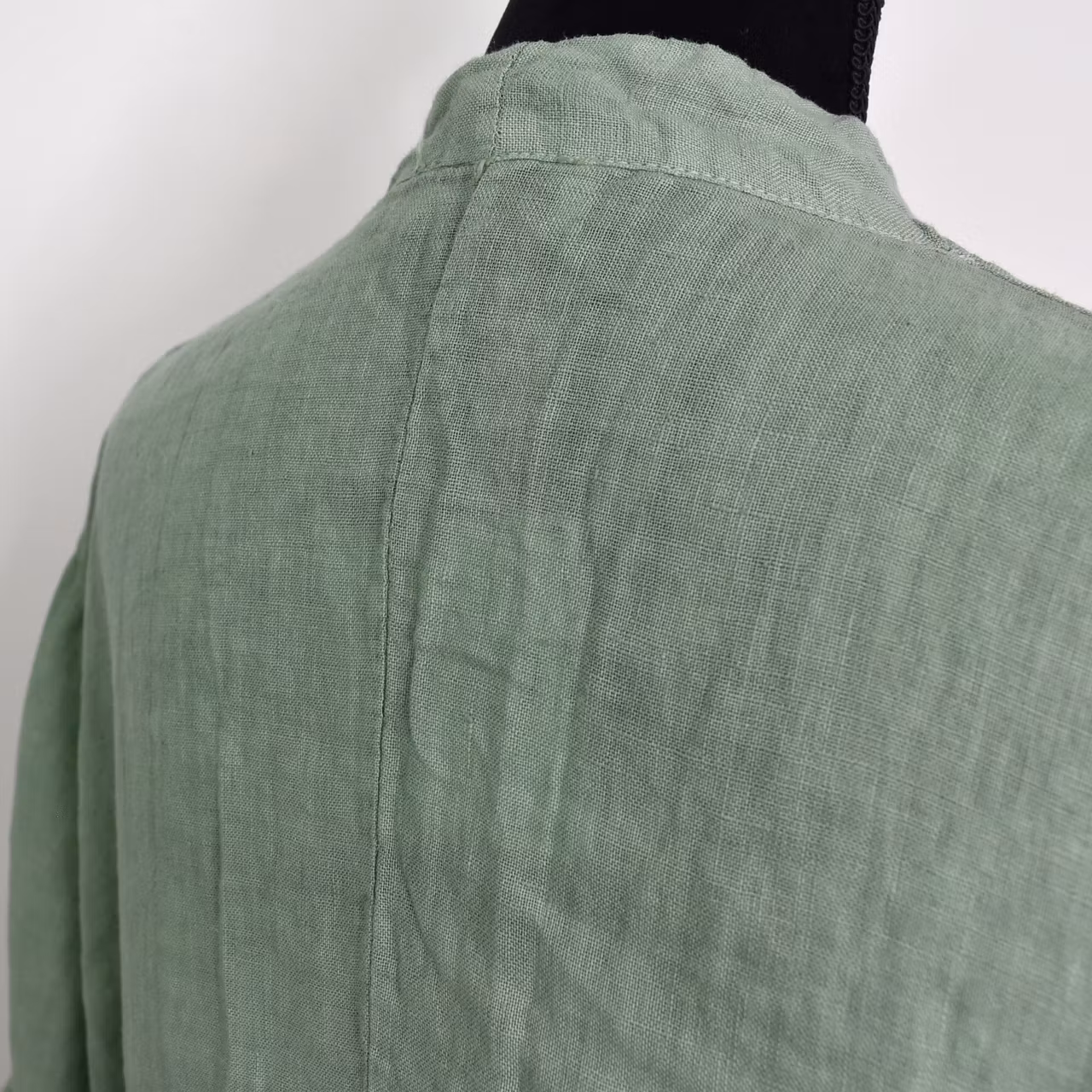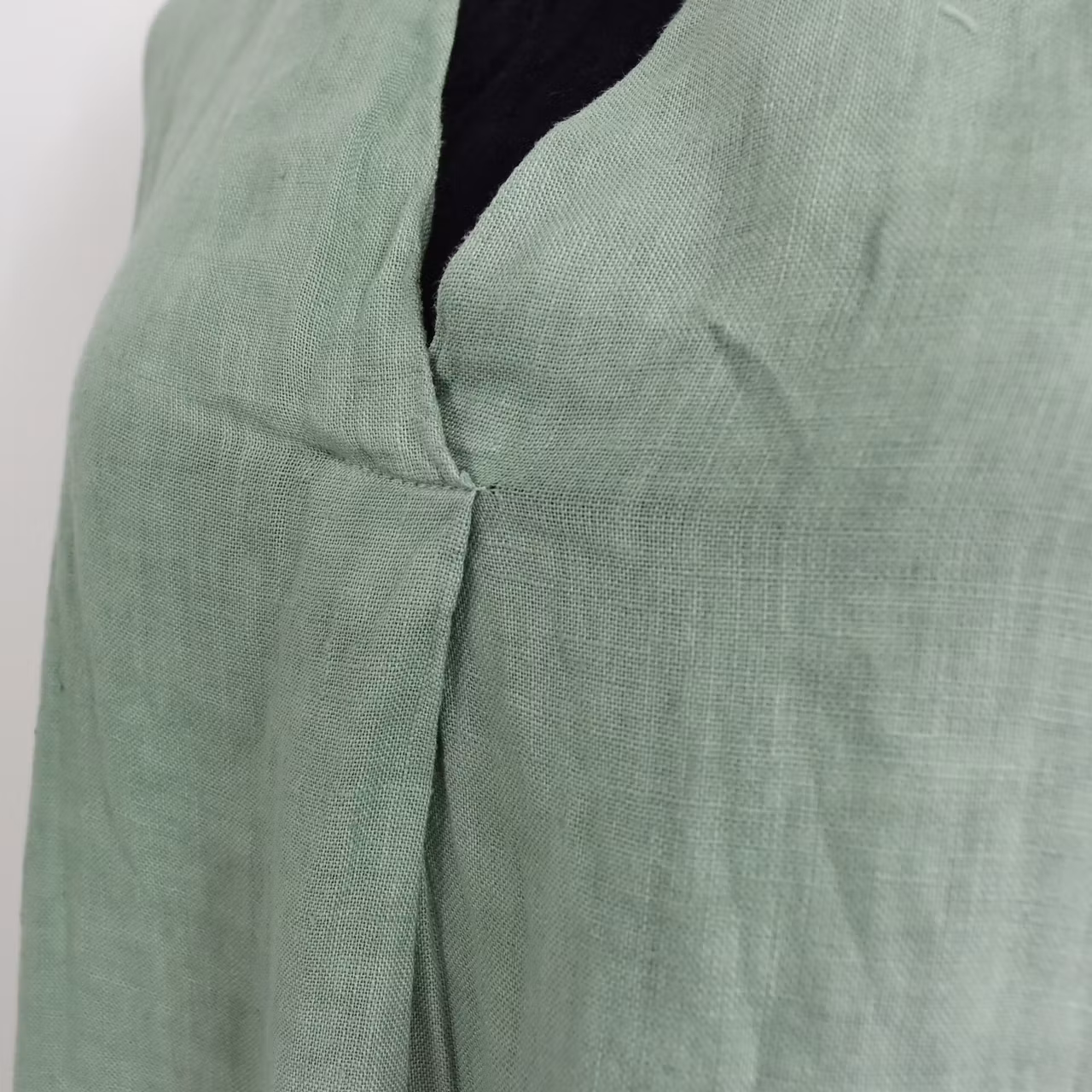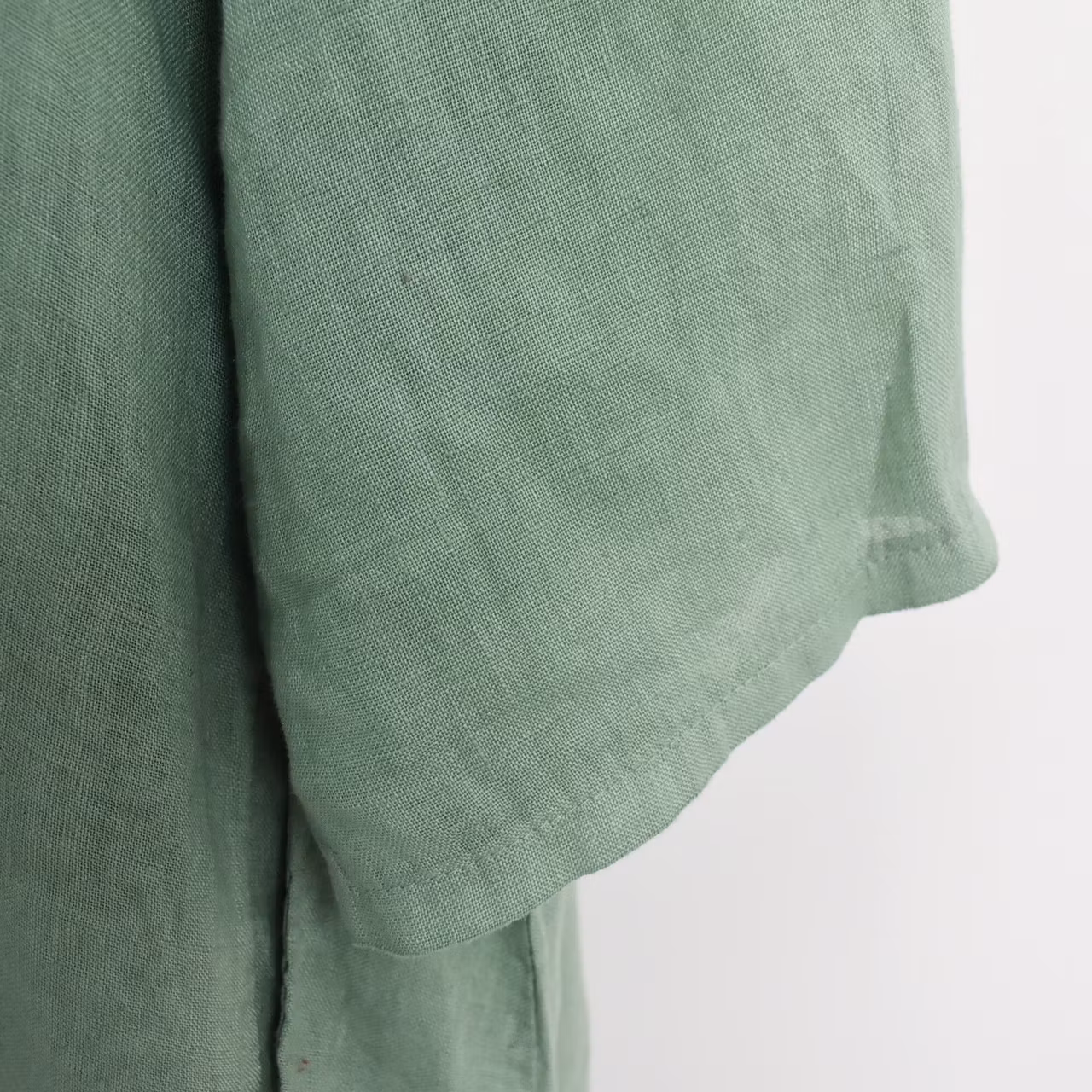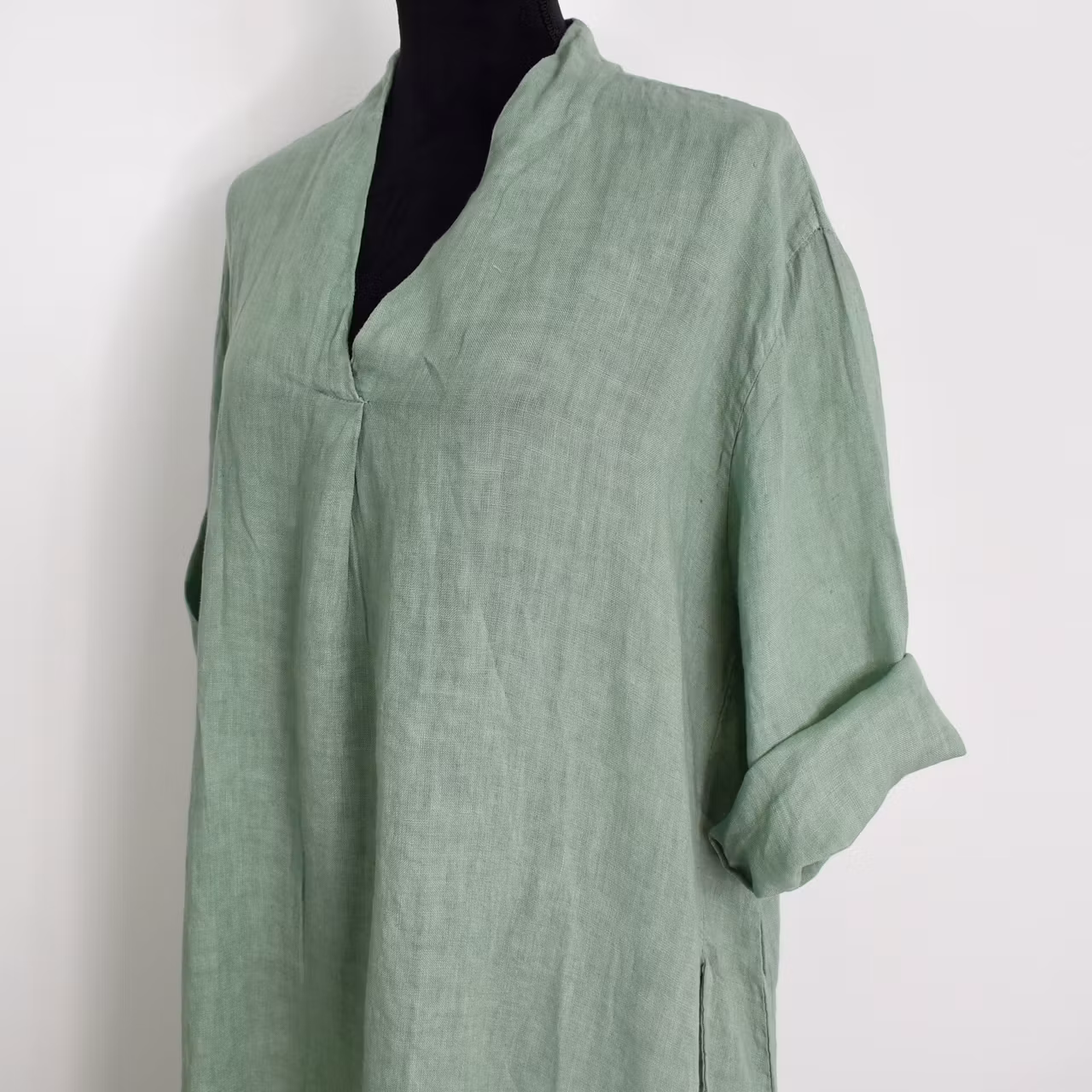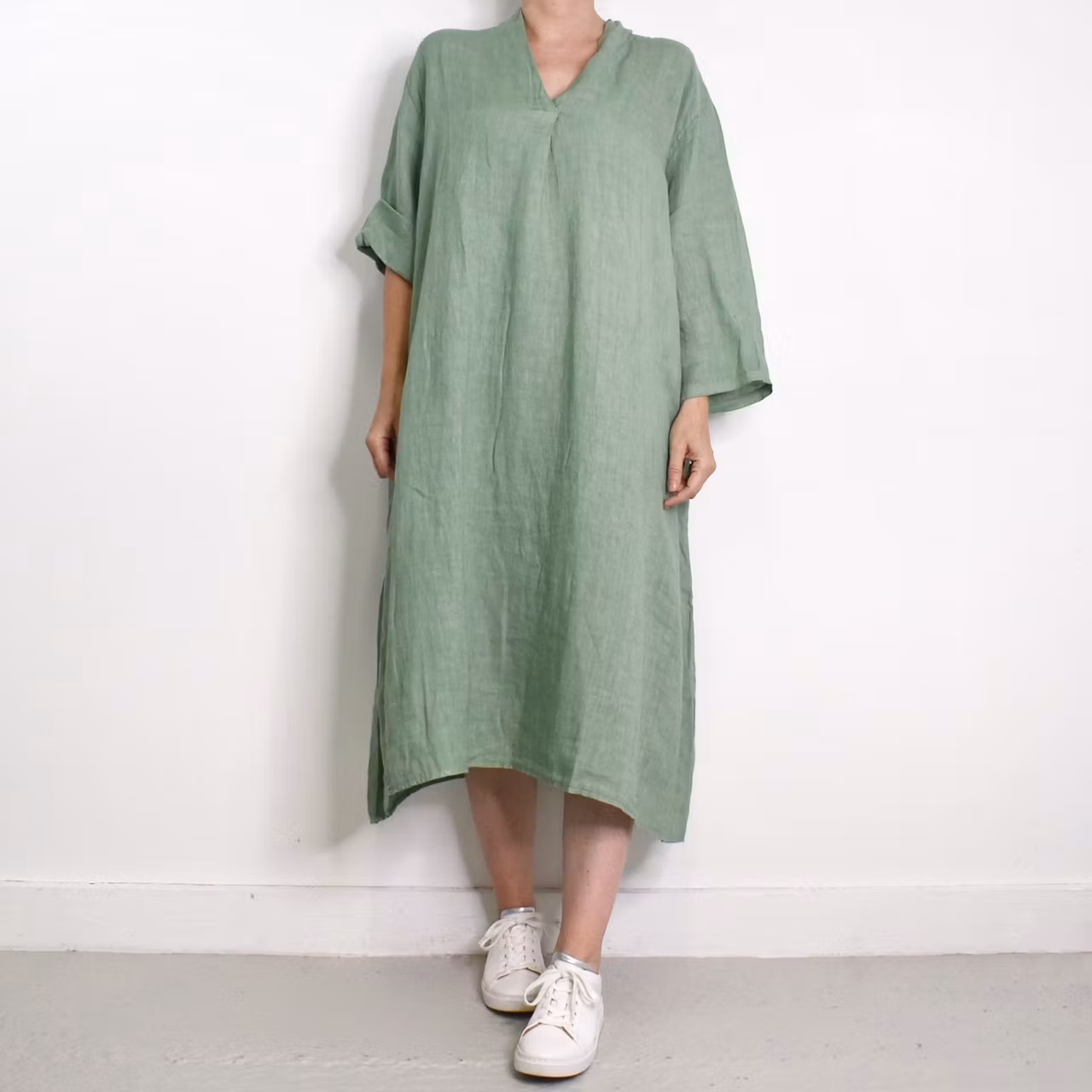 Det här är en snygg rymlig linneklänning med v-ringning och dekorativt sprund fram. Ärmen är trekvartslång och kan vikas upp. I sidorna finns gömda fickor. Observera att materialet inte innehåller stretch och att tyget är tunt. Modellen har en bröstvidd på cirka 88cm och är 163cm lång. Observera att förekomsten av streck, färgskiftningar etc. inte är defekter utan en del av det som gör tyget vackert.