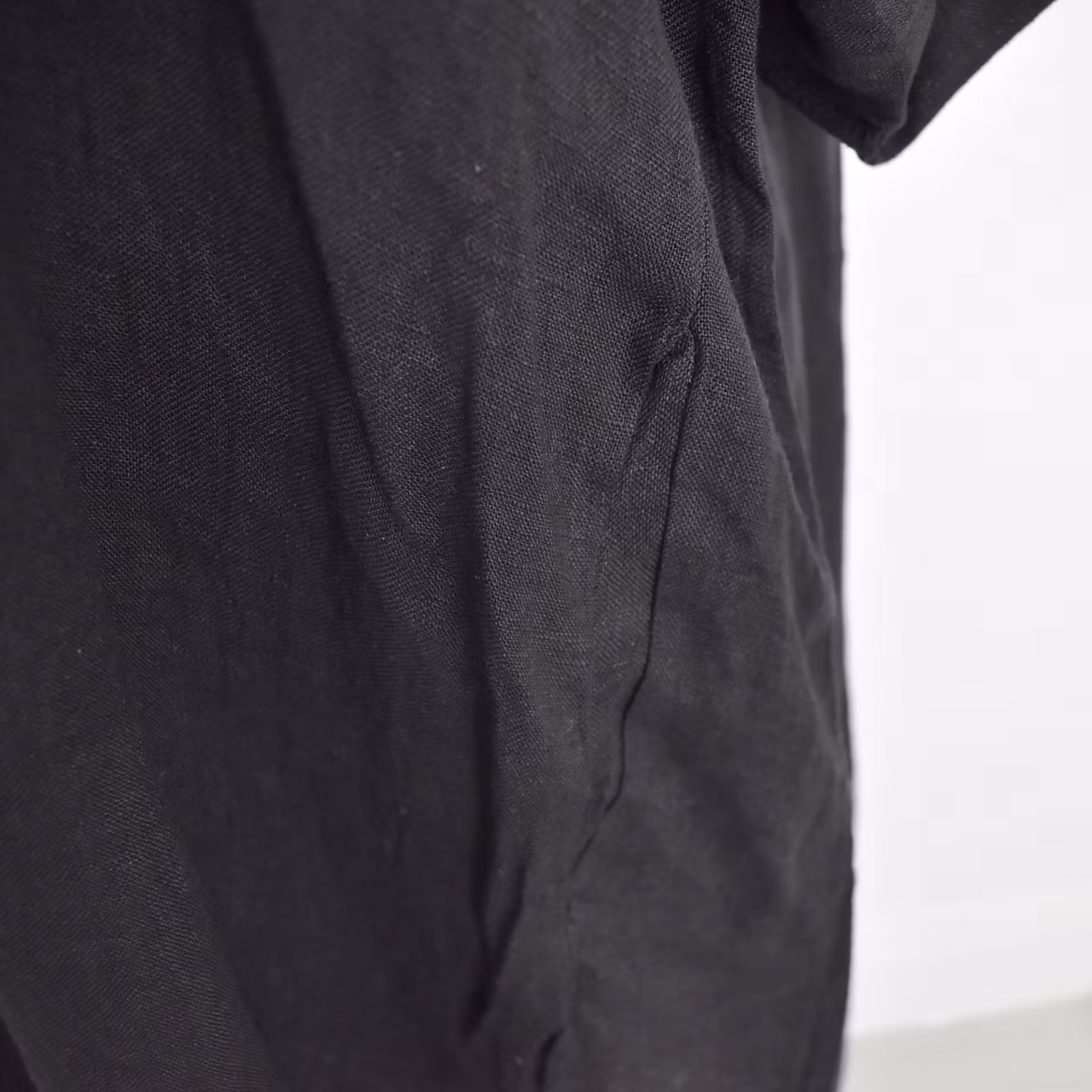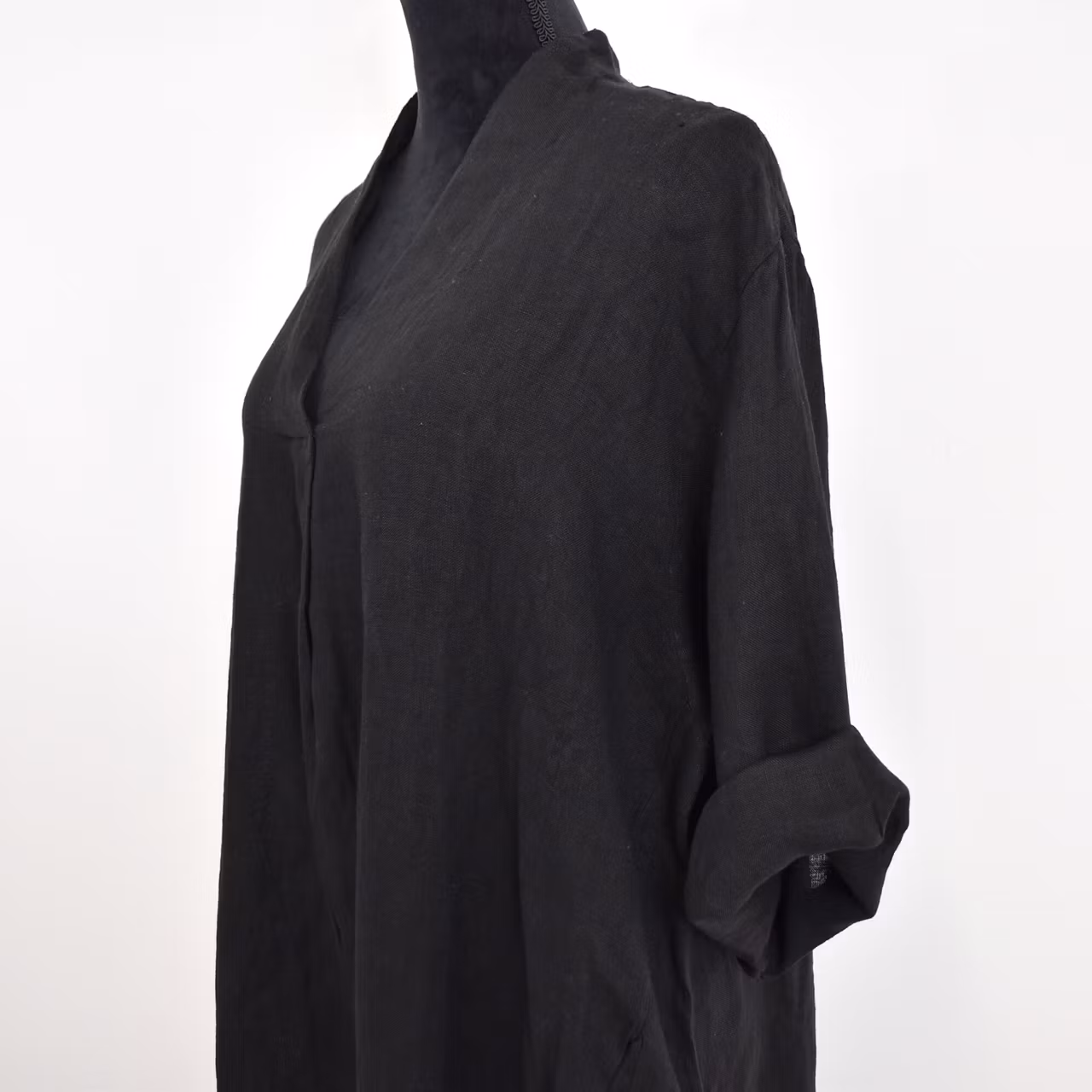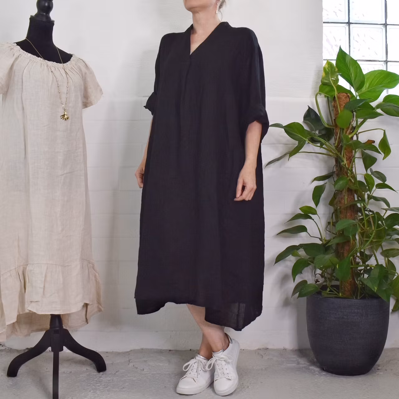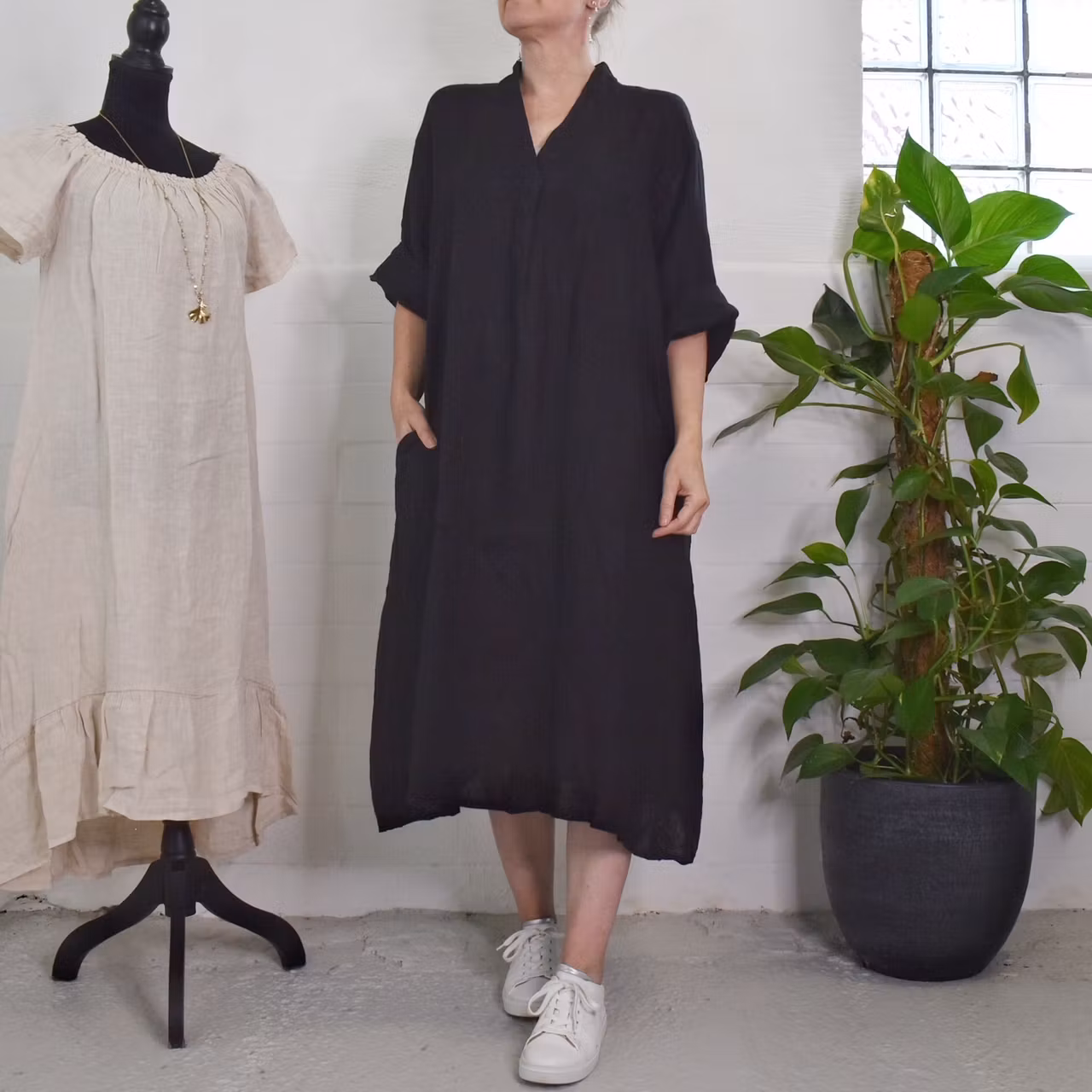 Det här är en snygg rymlig linneklänning med v-ringning och dekorativt sprund fram. Ärmen är trekvartslång och kan vikas upp. I sidorna finns gömda fickor. Observera att materialet inte innehåller stretch och att tyget är tunt. Modellen har en bröstvidd på cirka 88cm och är 163cm lång. Observera att förekomsten av streck, färgskiftningar etc. inte är defekter utan en del av det som gör tyget vackert.