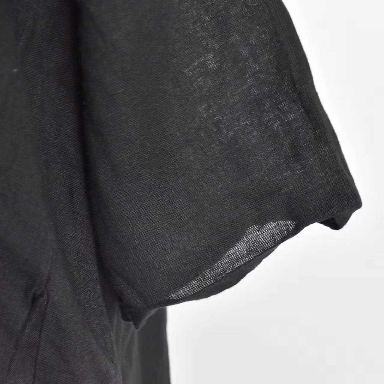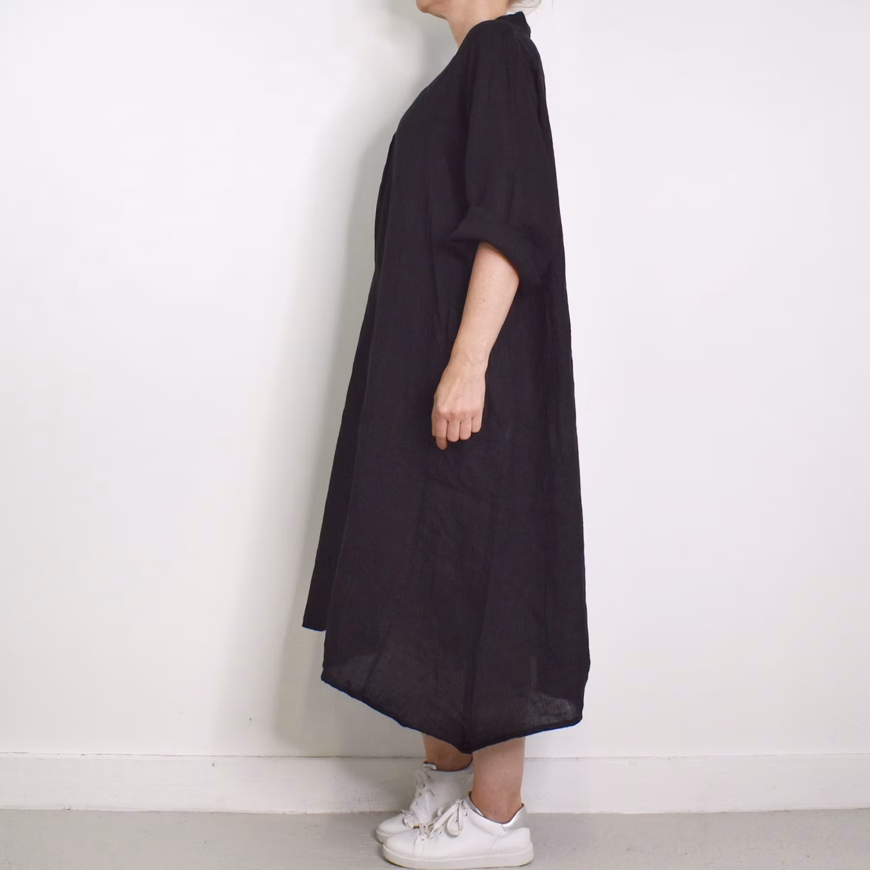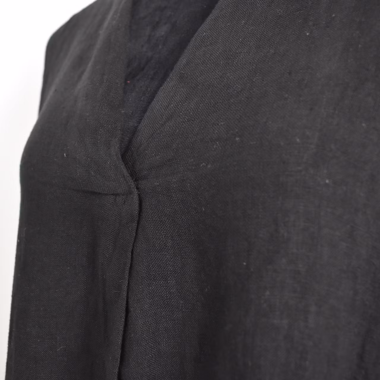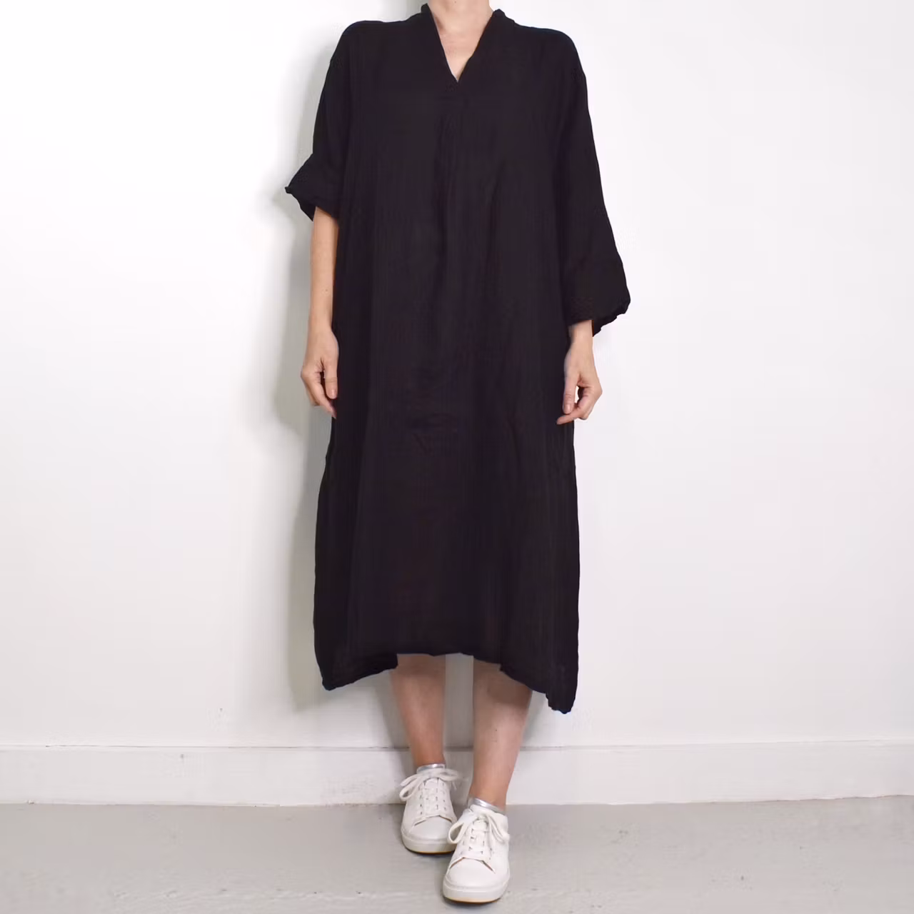 Det här är en snygg rymlig linneklänning med v-ringning och dekorativt sprund fram. Ärmen är trekvartslång och kan vikas upp. I sidorna finns gömda fickor. Observera att materialet inte innehåller stretch och att tyget är tunt. Modellen har en bröstvidd på cirka 88cm och är 163cm lång. Observera att förekomsten av streck, färgskiftningar etc. inte är defekter utan en del av det som gör tyget vackert.