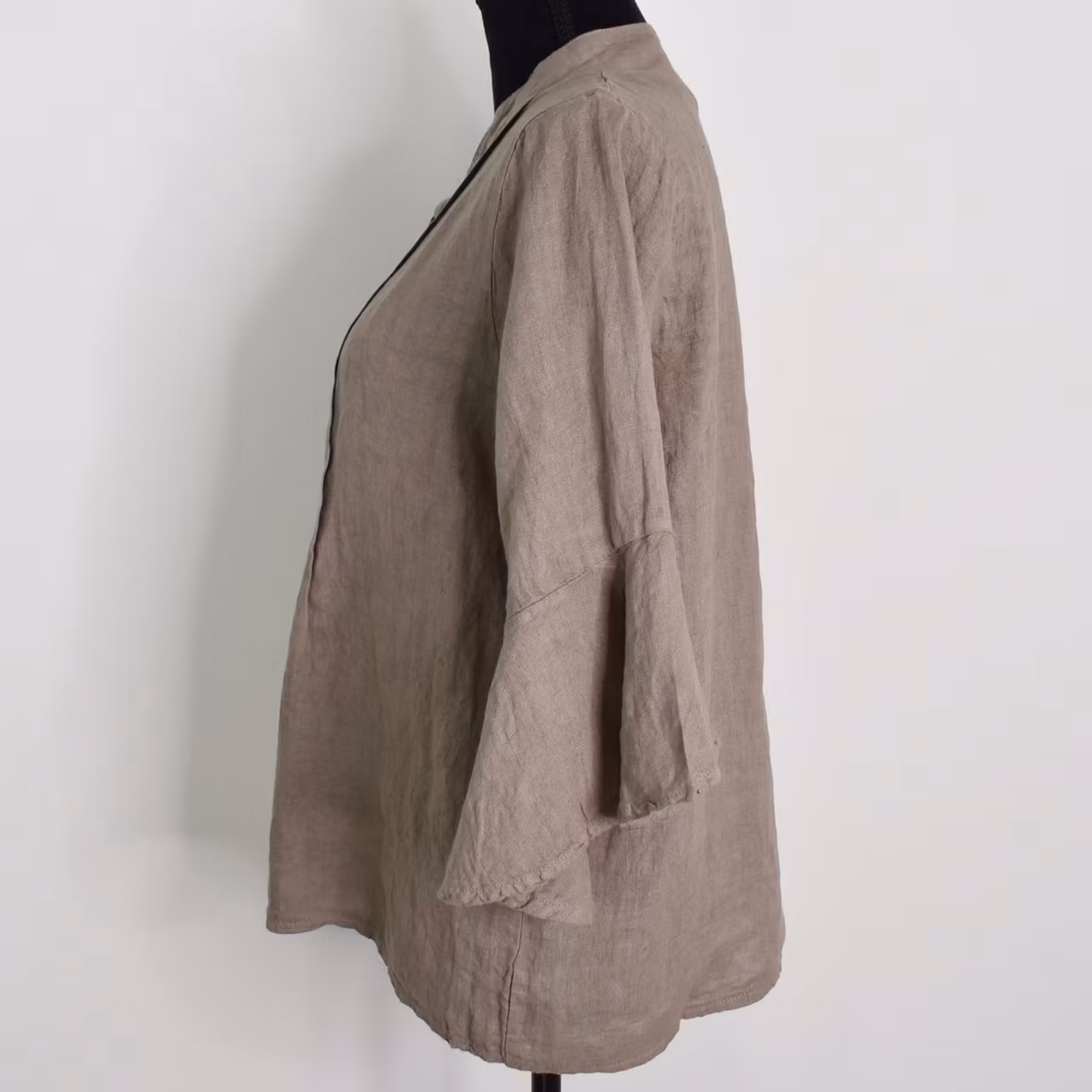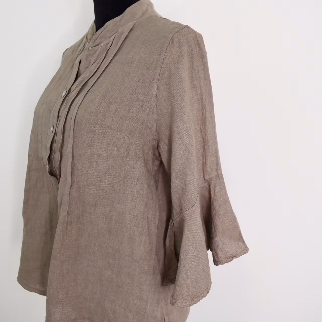 Det här är en tjusig blus i tunt vävt linnetyg. Blusen har liten ståkrage, dekorativa vecka, pärlemorskimrande knappar fram samt fjärilsärm. Observera att materialet inte innehåller stretch och att tyget är tunt. Modellen har en bröstvidd på cirka 88cm och är 163cm lång. Observera att förekomsten av streck, färgskiftningar etc. inte är defekter utan en del av det som gör tyget vackert.