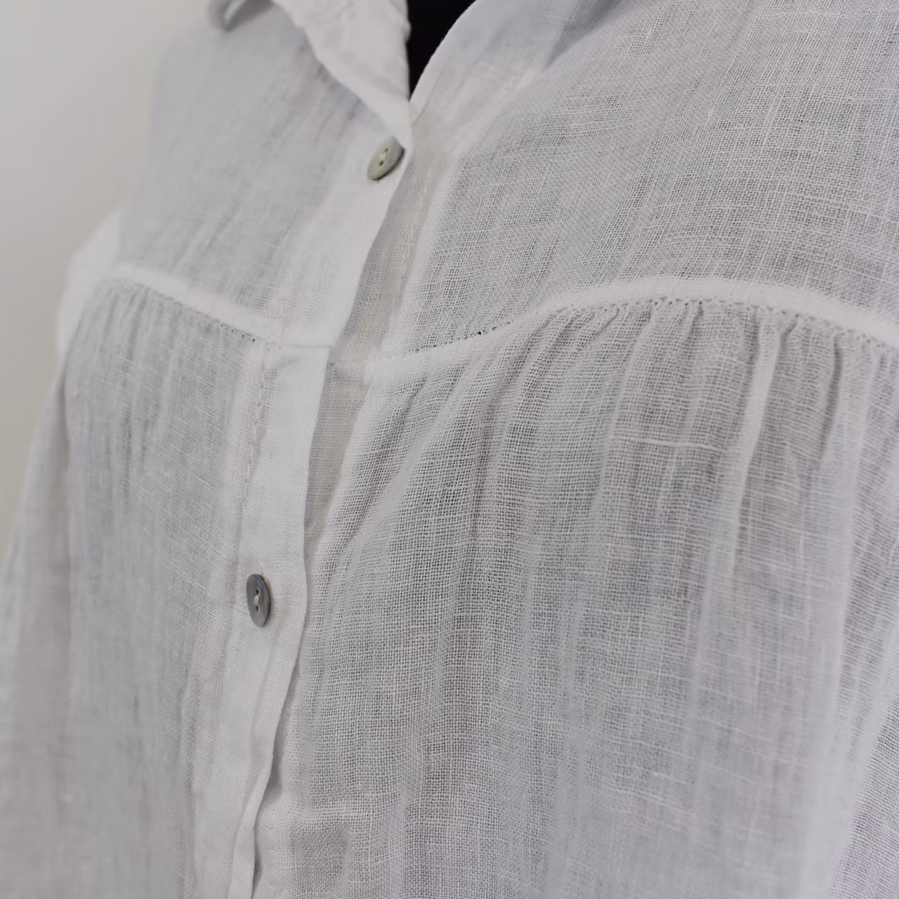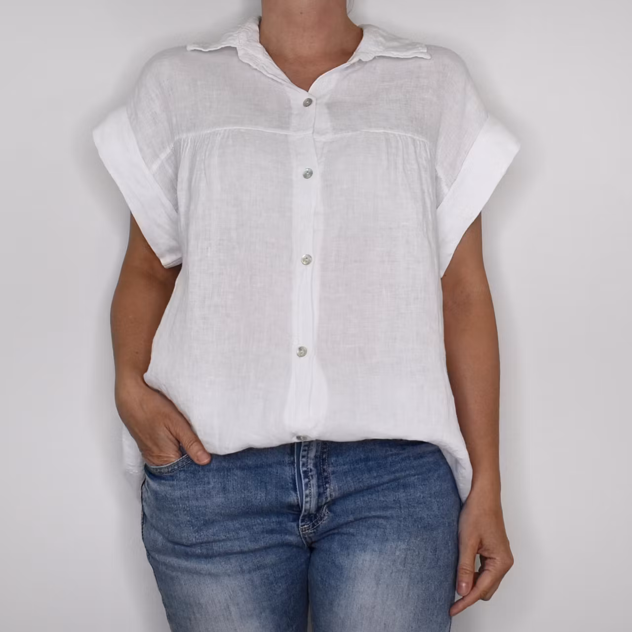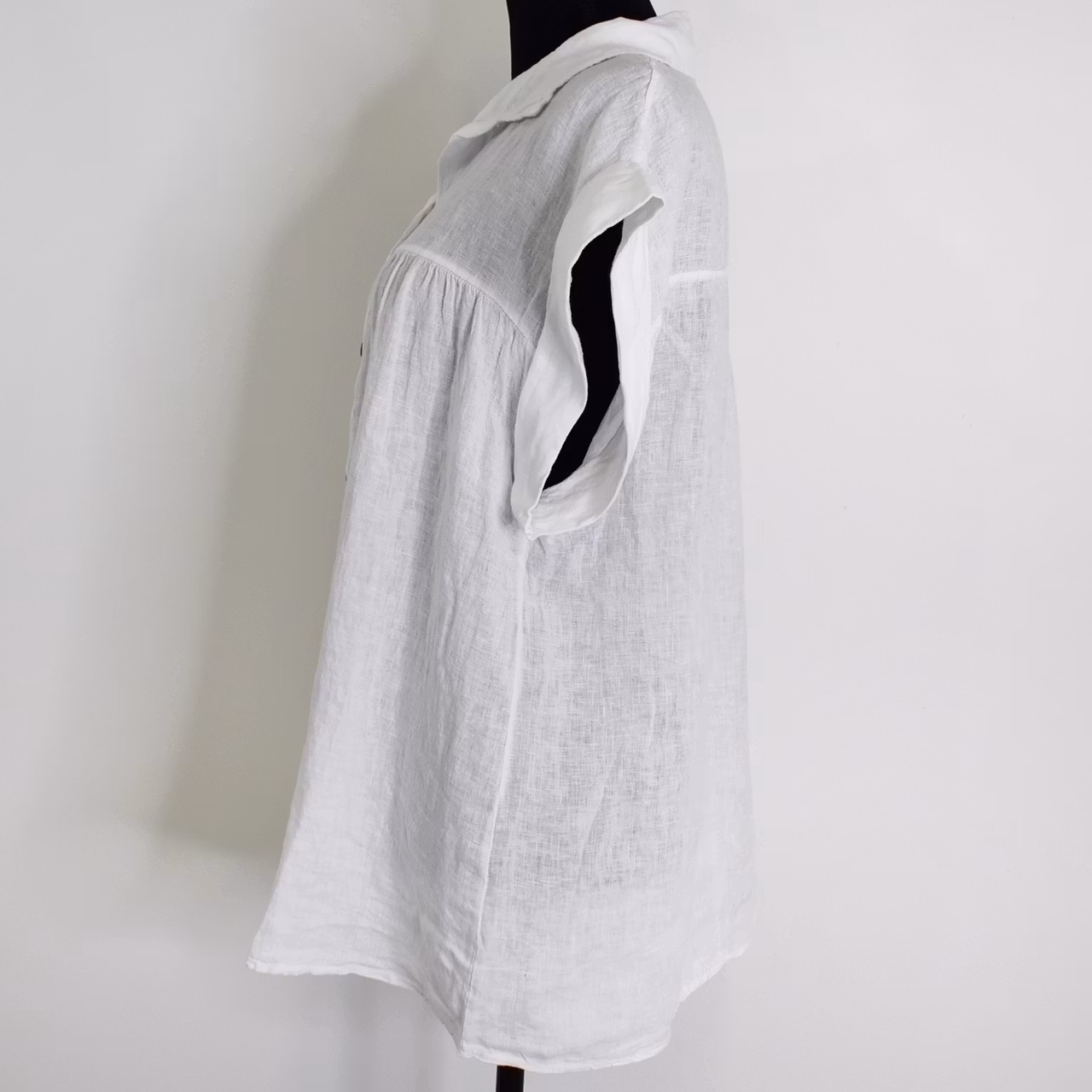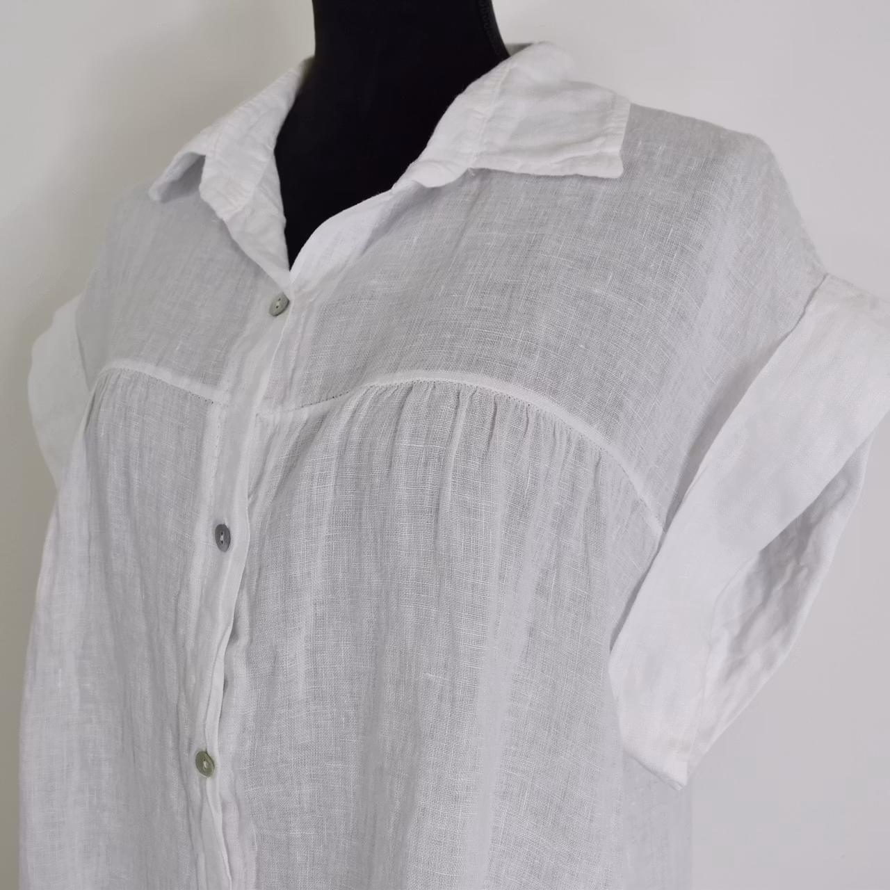 Det här är en läcker blus med skjortkrage och knappar hela vägen fram. Tvärs över bröstet går en söm och från den är tyget vackert rynkat neråt. Ärmen är kort och vid med dubbelvikt tyg. På ryggen är där ett dekorativt sprund. Blusen är vidare nertill. Observera att materialet inte innehåller stretch och att tyget är tunt och något genomskinligt. One Size - passar uppskattningsvis upp till 40/42. Då alla är olika formade är det viktigt att alltid ta hjälp av mått-tabellen för att köpet ska bli lyckat. Modellen har en bröstvidd på cirka 88cm och är 163cm lång. Observera att förekomsten av streck, färgskiftningar etc. inte är defekter utan en del av det som gör tyget vackert.