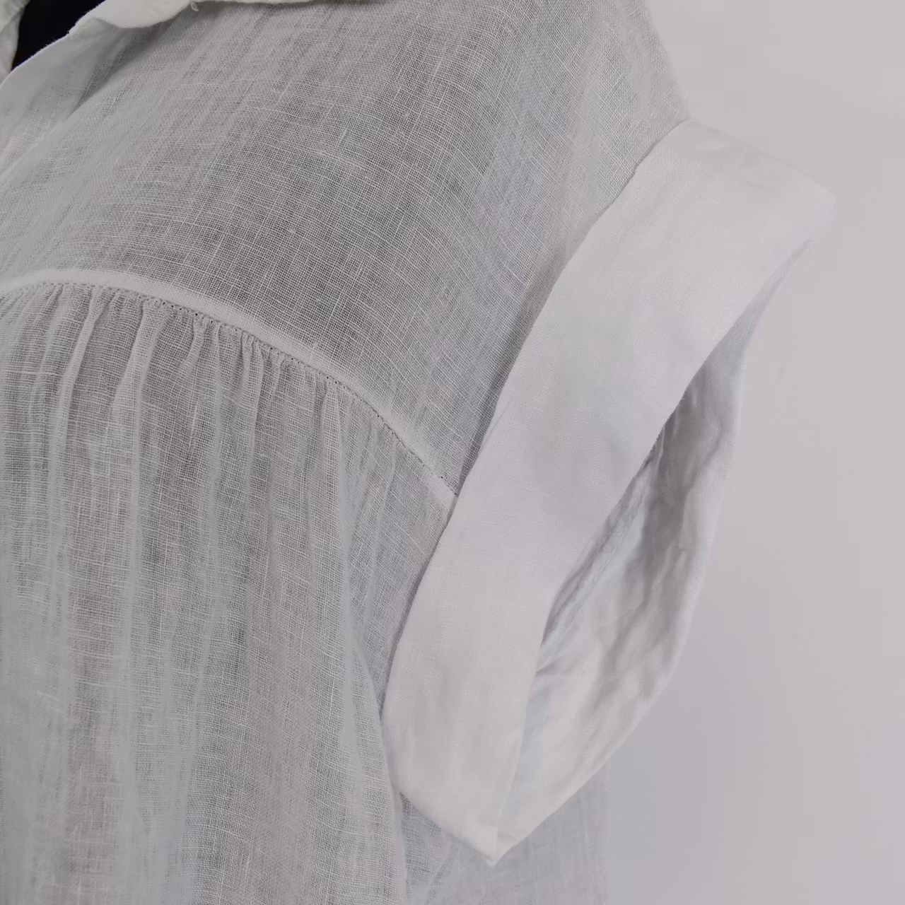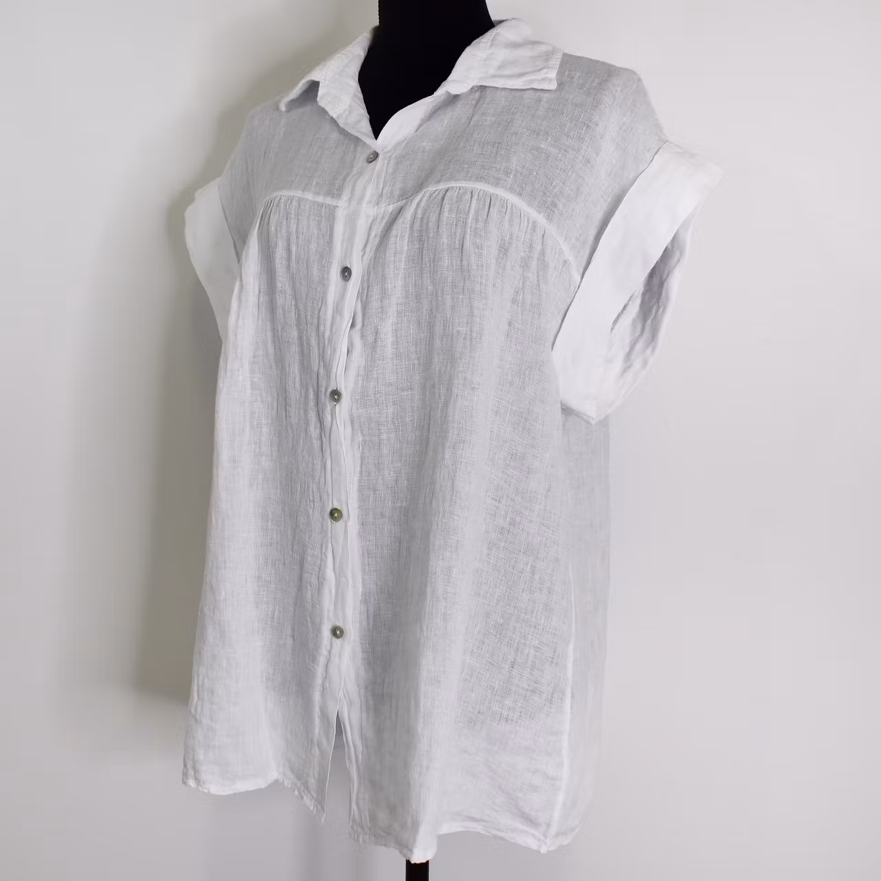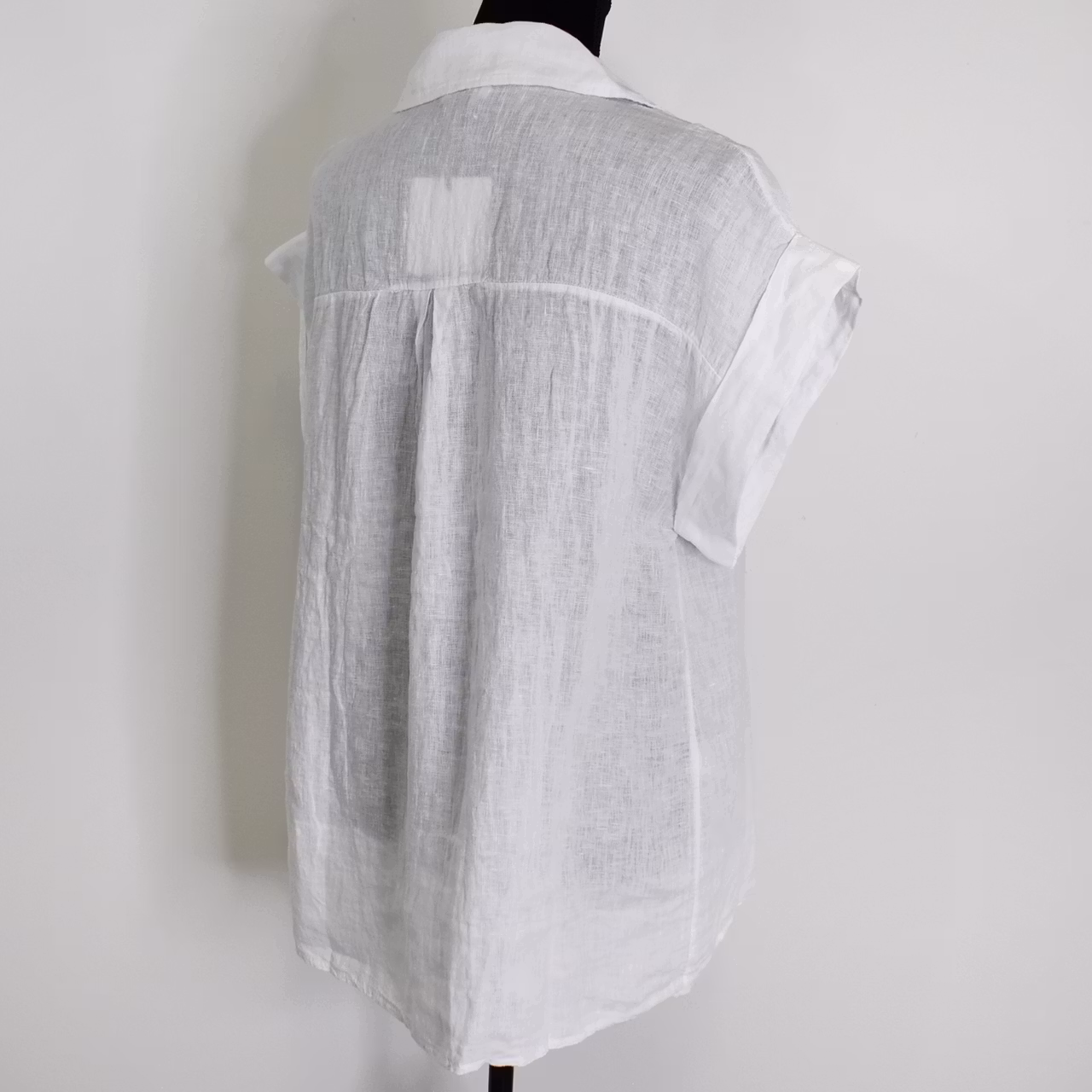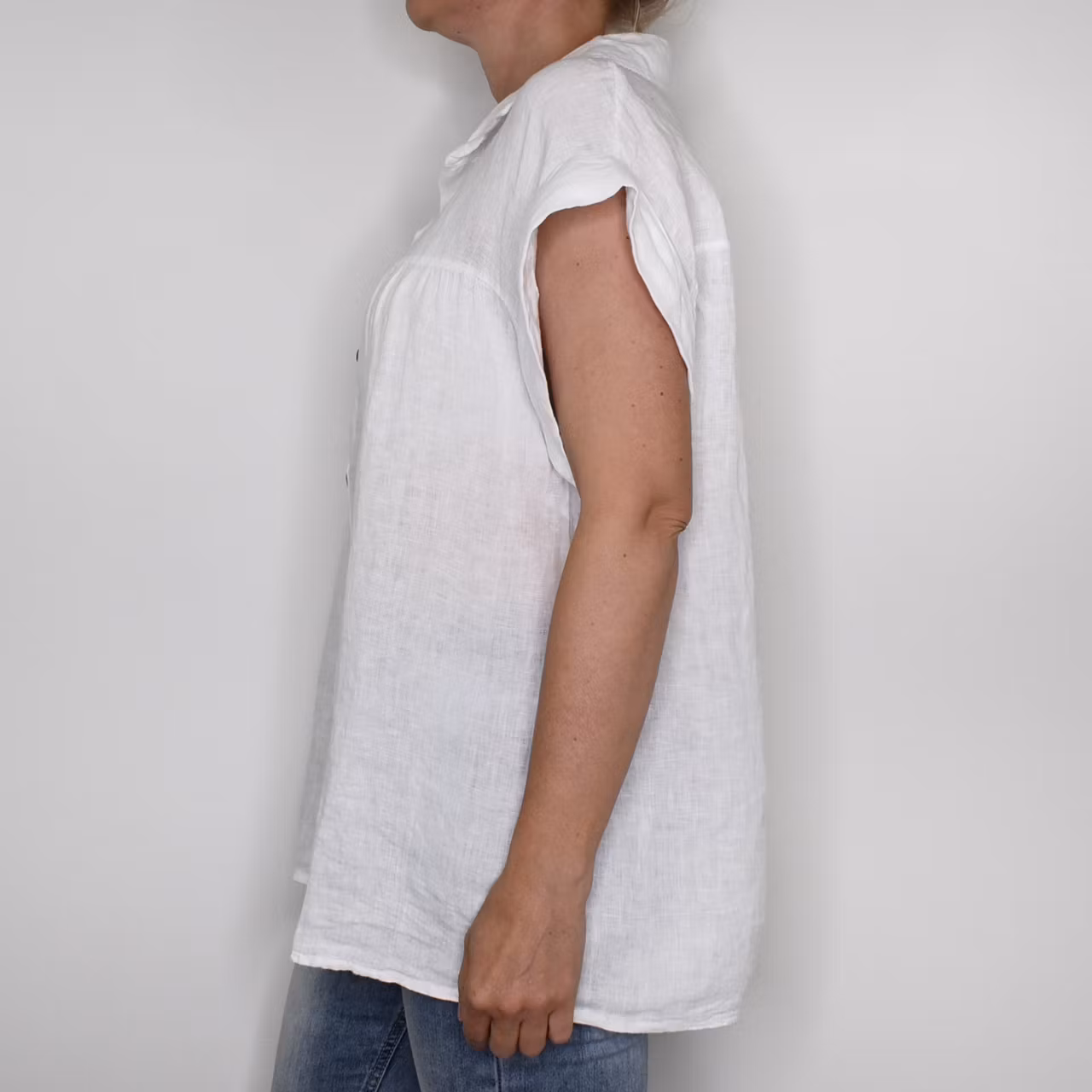 Det här är en läcker blus med skjortkrage och knappar hela vägen fram. Tvärs över bröstet går en söm och från den är tyget vackert rynkat neråt. Ärmen är kort och vid med dubbelvikt tyg. På ryggen är där ett dekorativt sprund. Blusen är vidare nertill. Observera att materialet inte innehåller stretch och att tyget är tunt och något genomskinligt. One Size - passar uppskattningsvis upp till 40/42. Då alla är olika formade är det viktigt att alltid ta hjälp av mått-tabellen för att köpet ska bli lyckat. Modellen har en bröstvidd på cirka 88cm och är 163cm lång. Observera att förekomsten av streck, färgskiftningar etc. inte är defekter utan en del av det som gör tyget vackert.