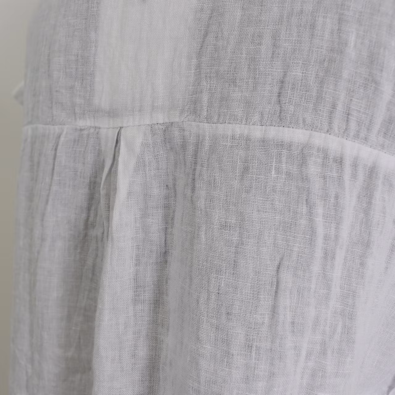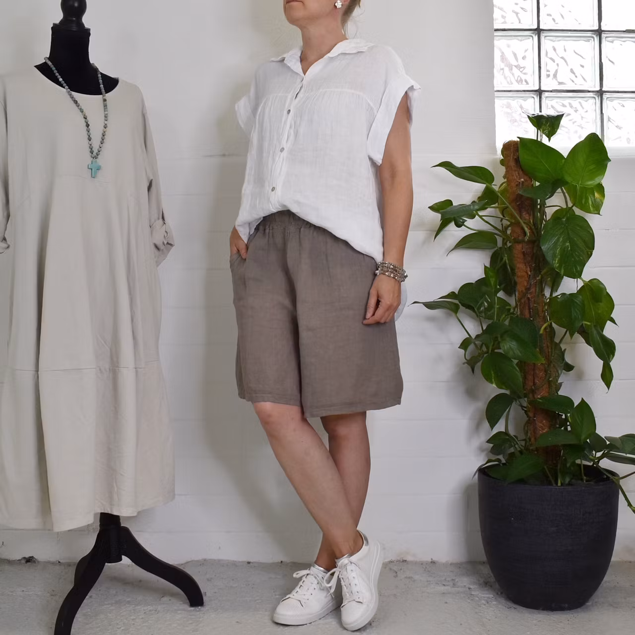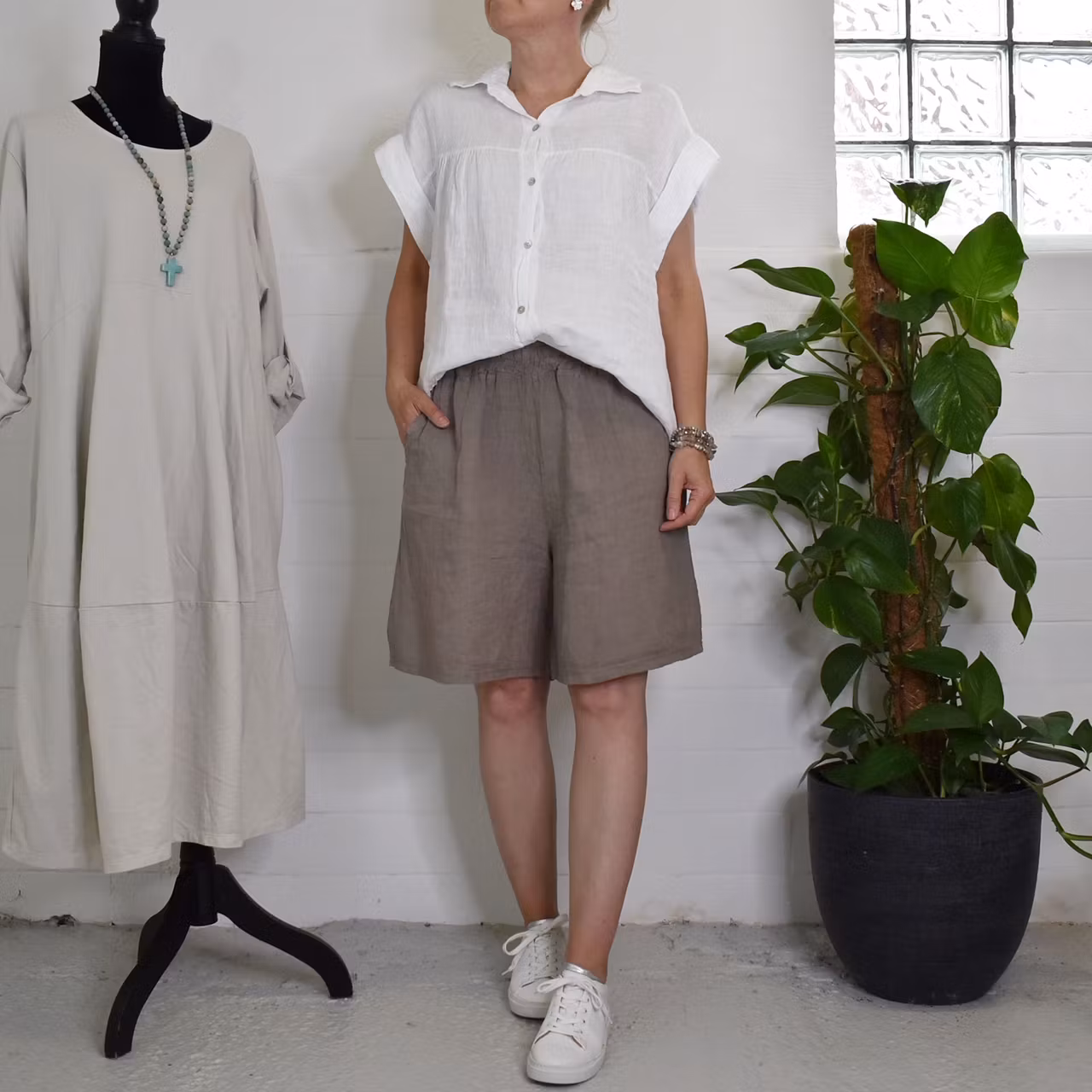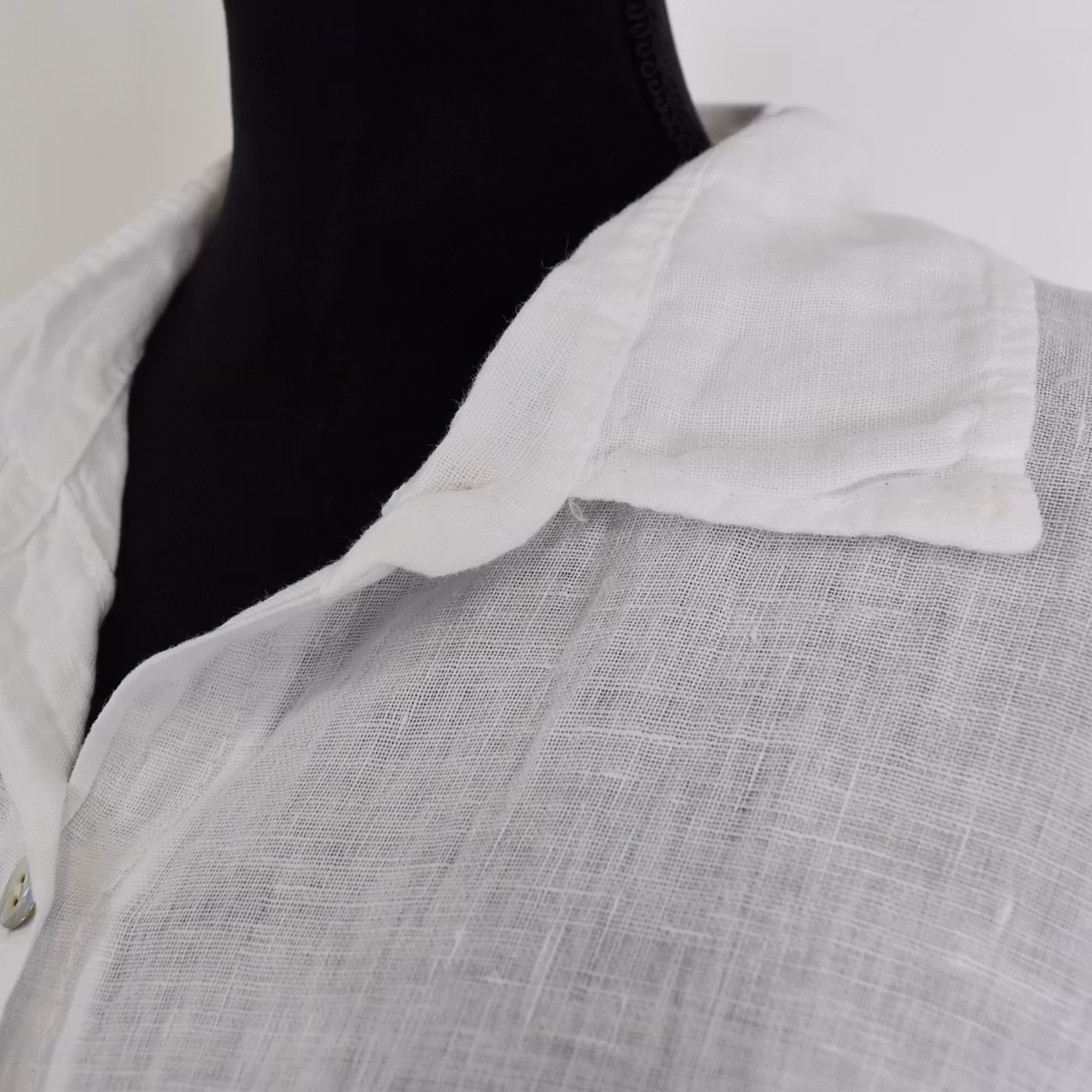 Det här är en läcker blus med skjortkrage och knappar hela vägen fram. Tvärs över bröstet går en söm och från den är tyget vackert rynkat neråt. Ärmen är kort och vid med dubbelvikt tyg. På ryggen är där ett dekorativt sprund. Blusen är vidare nertill. Observera att materialet inte innehåller stretch och att tyget är tunt och något genomskinligt. One Size - passar uppskattningsvis upp till 40/42. Då alla är olika formade är det viktigt att alltid ta hjälp av mått-tabellen för att köpet ska bli lyckat. Modellen har en bröstvidd på cirka 88cm och är 163cm lång. Observera att förekomsten av streck, färgskiftningar etc. inte är defekter utan en del av det som gör tyget vackert.