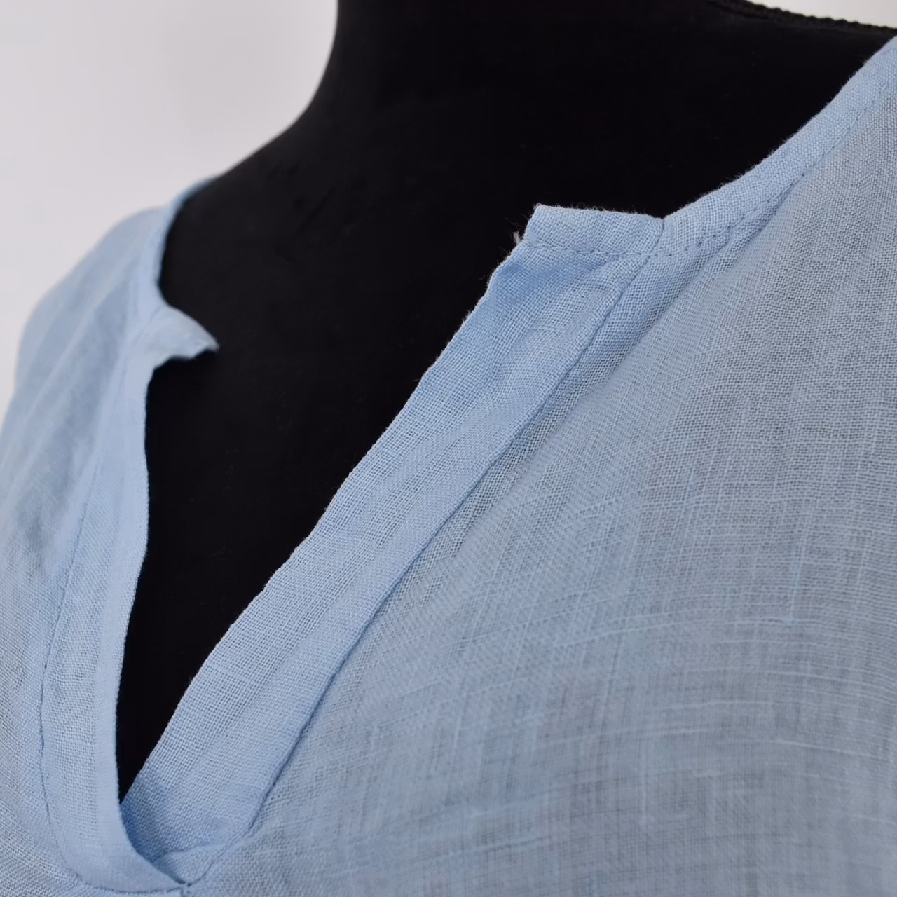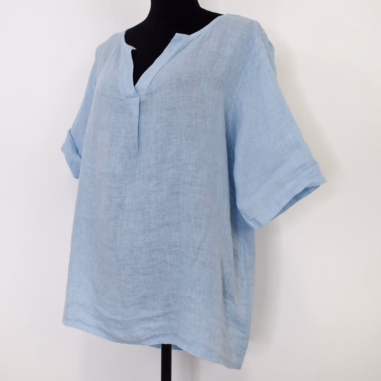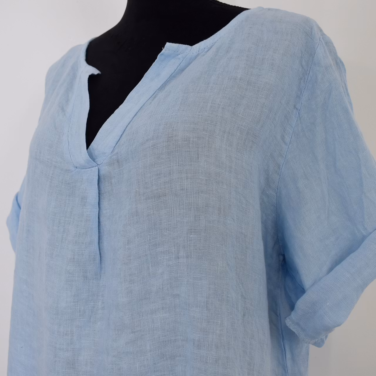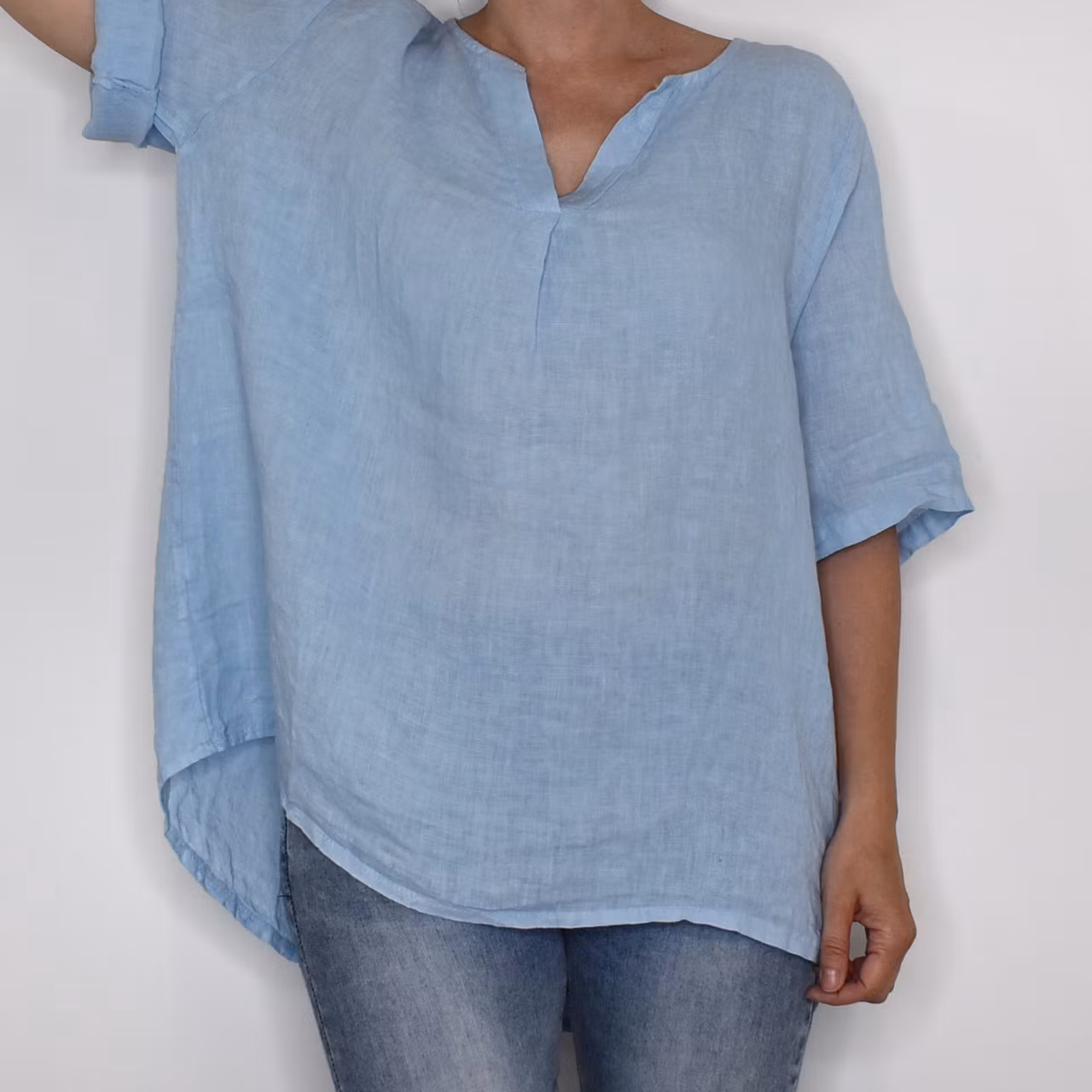 Det här är en enkel och fin v-ringad topp i tunt linnetyg. Ärmen är halvlång och kan vikas upp. På ryggen är där ett dekorativt sprund och toppen är längre baktill. Observera att materialet inte innehåller stretch och att tyget är tunt och något genomskinligt. One Size - passar uppskattningsvis upp till 40/42. Då vi alla är olika formade är det viktigt att alltid ta hjälp av mått-tabellen för att köpet ska bli lyckat. Modellen har en bröstvidd på cirka 88cm och är 163cm lång. Observera att förekomsten av streck, färgskiftningar etc. inte är defekter utan en del av det som gör tyget vackert.